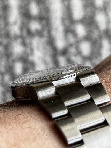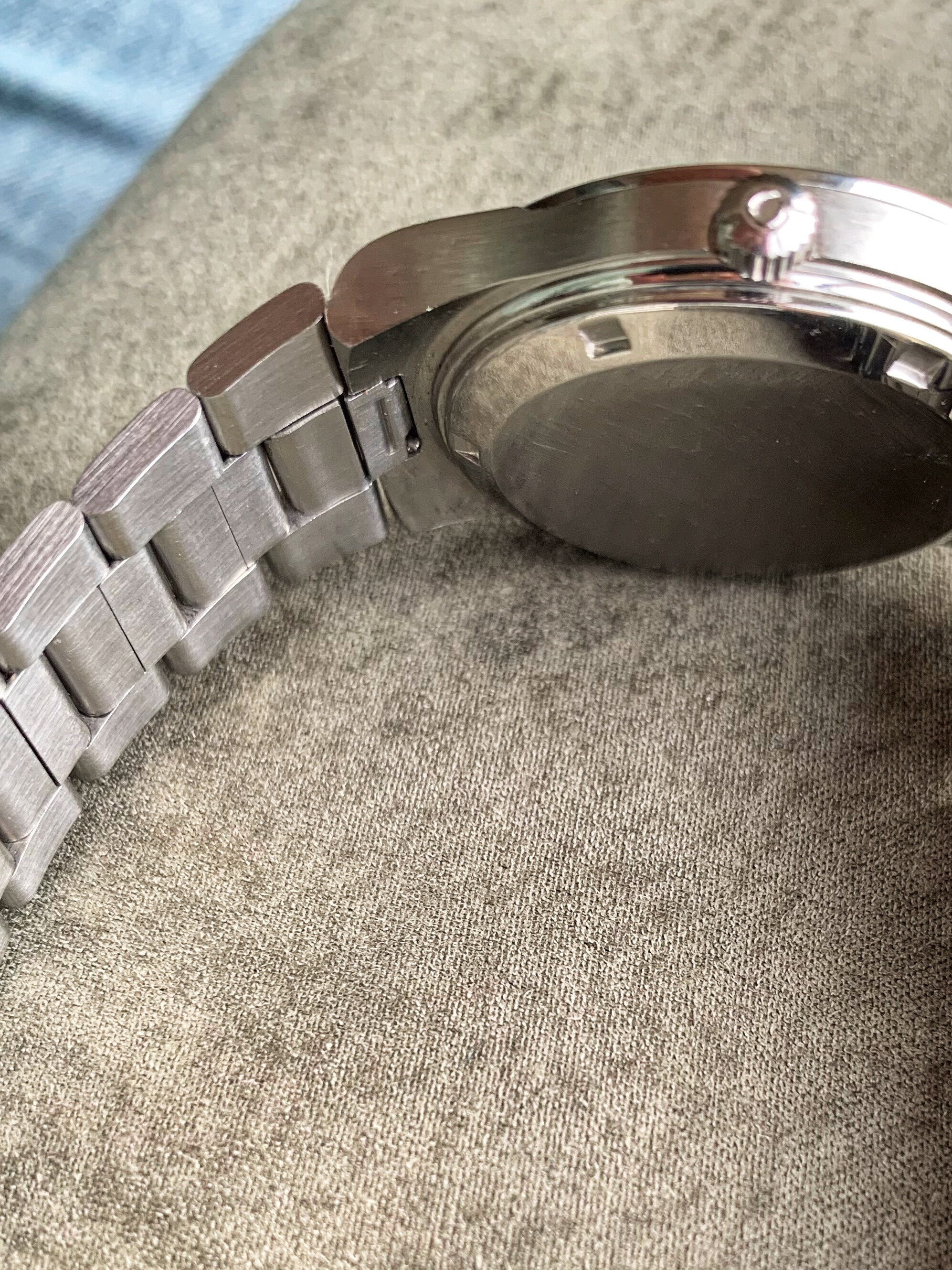 Als genoemd zijn de kast, bracelet en clasp op deze bijna 50 jaar oude Omega nog bijna als nieuw, inclusief de originele kroon. Een enkel krasje mag de pret niet drukken. Des te meer onder de indruk, alsmede verbaasd, was ik van het ingenieuze quick release systeem van de bracelet. Verbaasd omdat we het over een horloge hebben van medio jaren 70 welke, kennelijk, al over een soort “oerversie” van een quick release bracelet beschikt. En onder de indruk omdat het pinnetje van dit quick release systeem tevens fungeert als een soort stoppertje waardoor de eerste schakel van de band niet onder de kast kan schuiven. Tweeledig voordeel: ten eerste ligt de band dus altijd mooi om de pols en ten tweede wordt overmatige slijtage van de eerste paar schakels bij de kast voorkomen. Knap staaltje engineering!