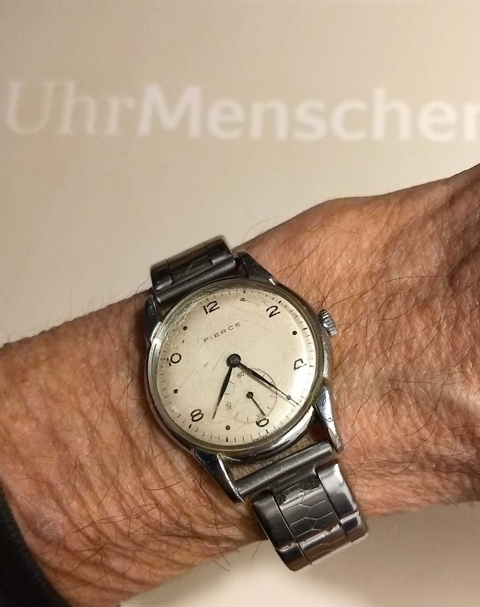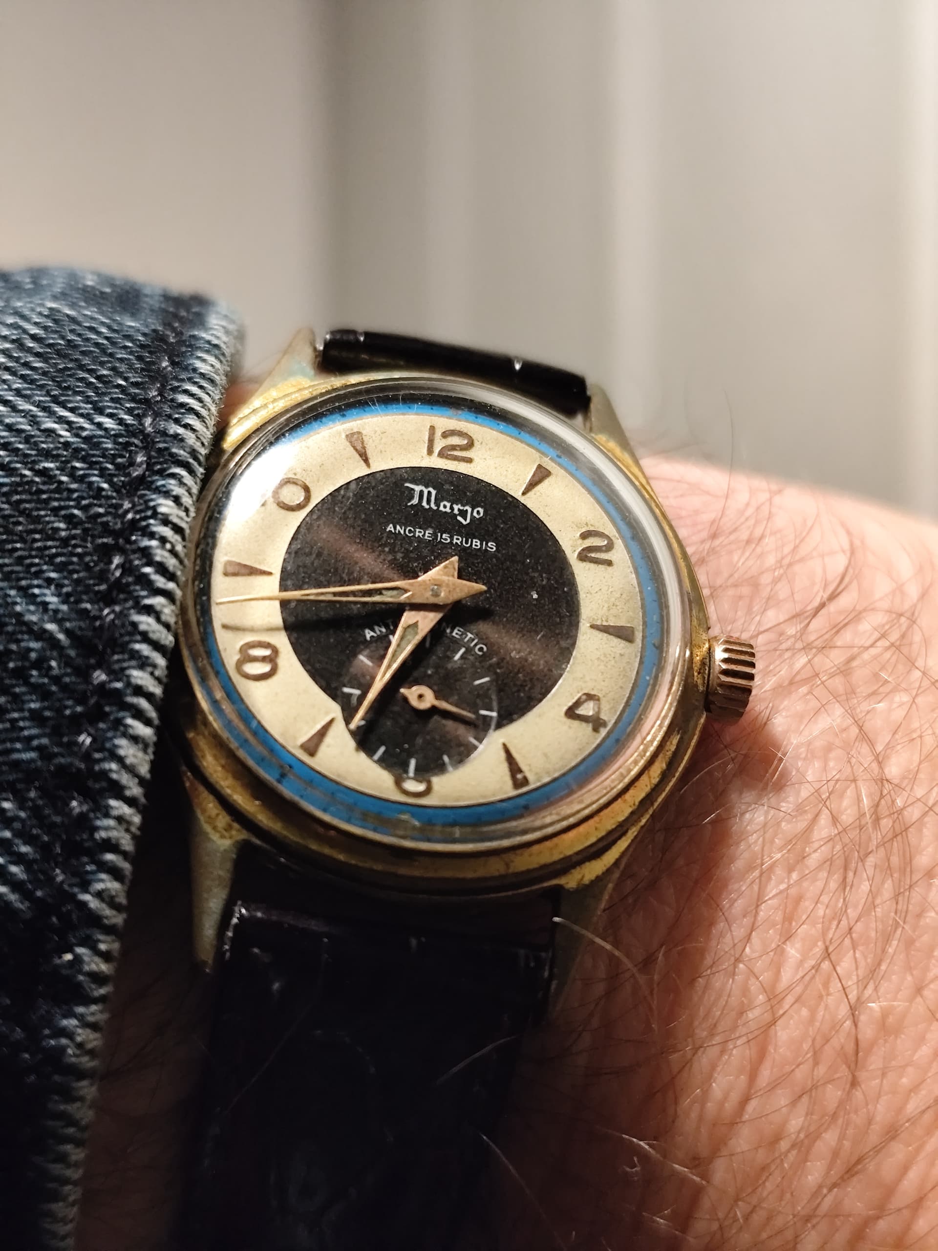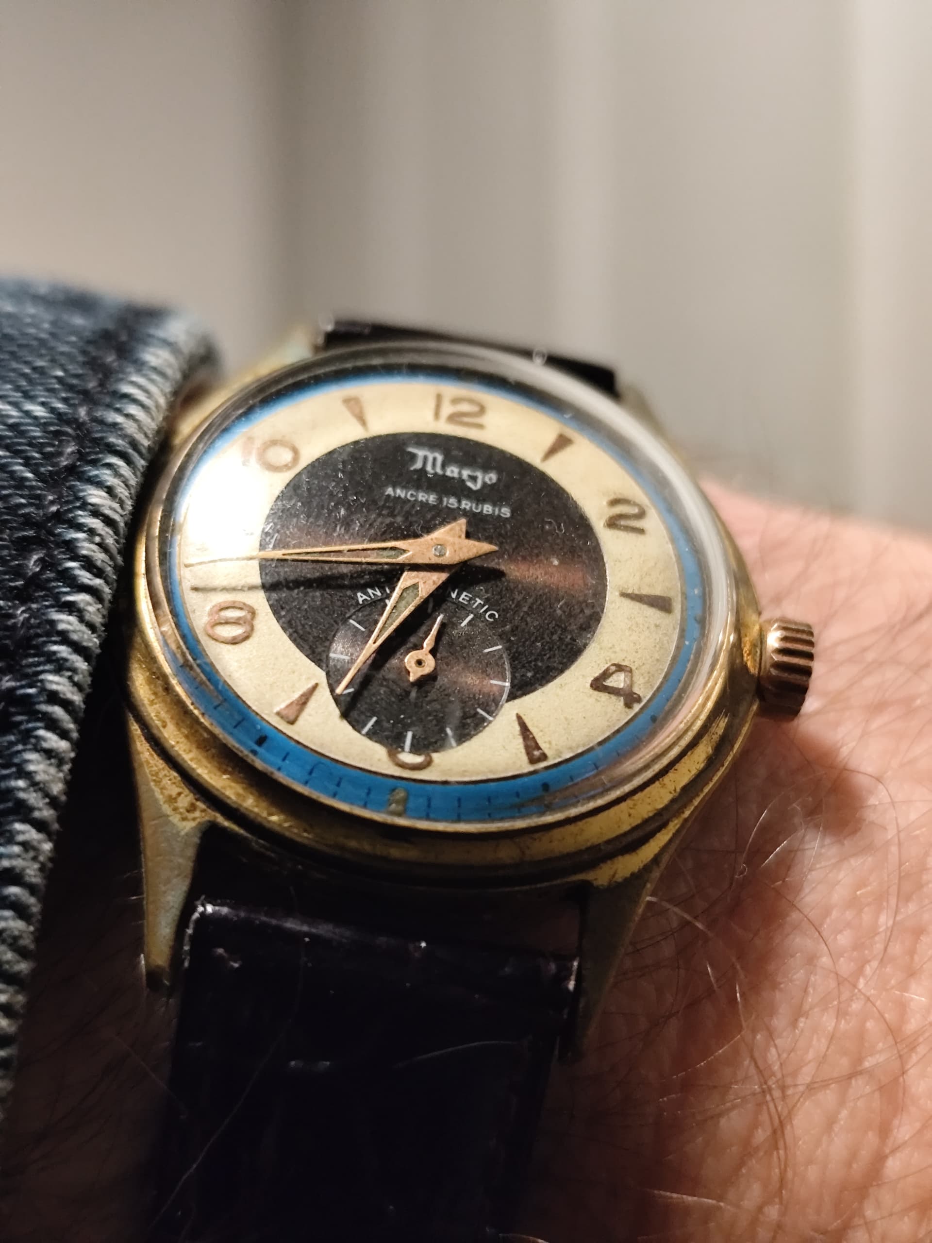 De naam van mijn moeder als compleet onbekend merk, de bullseye dial en de bijzonder, lichtblauwe buitenring trokken mij aan. De sleetse kast is verder strak en de (drilled) lugs zijn recht en intact. Loopt ook nog eens strak op tijd. Deze had ik voor geen goud willen missen.