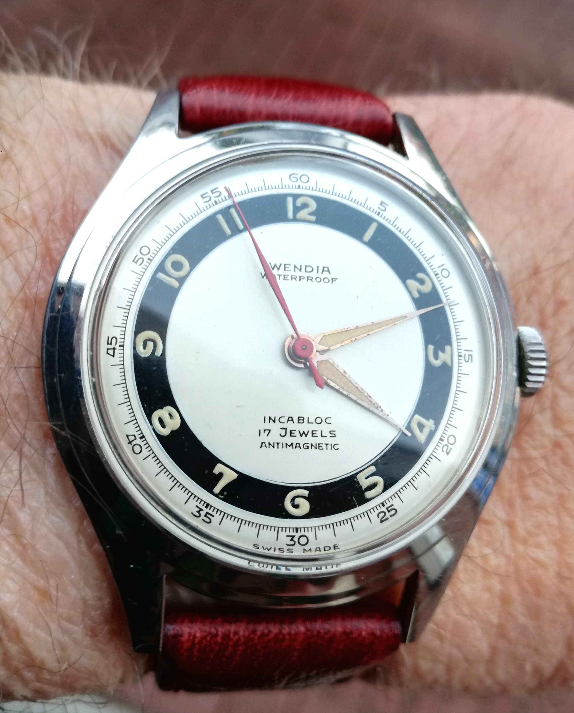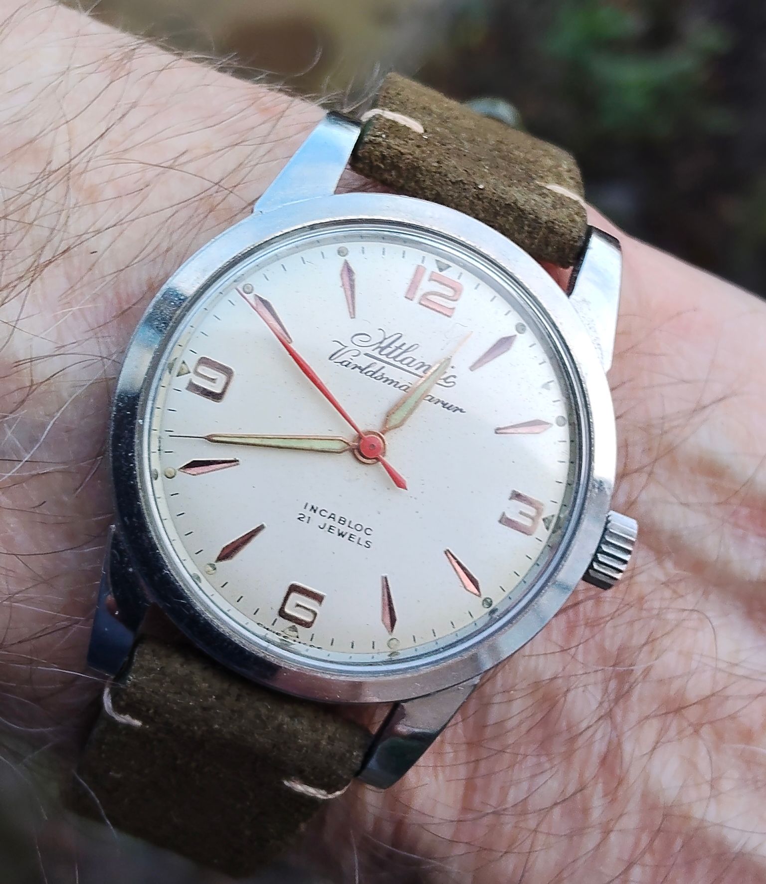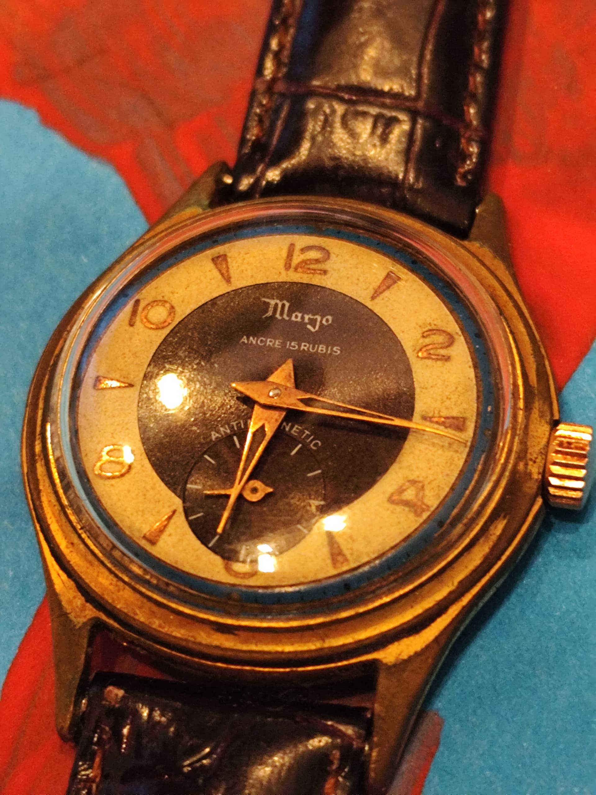 De naam van mijn moeder als compleet onbekend merk, de bullseye dial en de bijzonder, lichtblauwe buitenring trokken mij aan. De sleetse kast is verder strak en de (drilled) lugs zijn recht en intact. Loopt ook nog eens strak op tijd. Deze had ik voor geen goud willen missen.