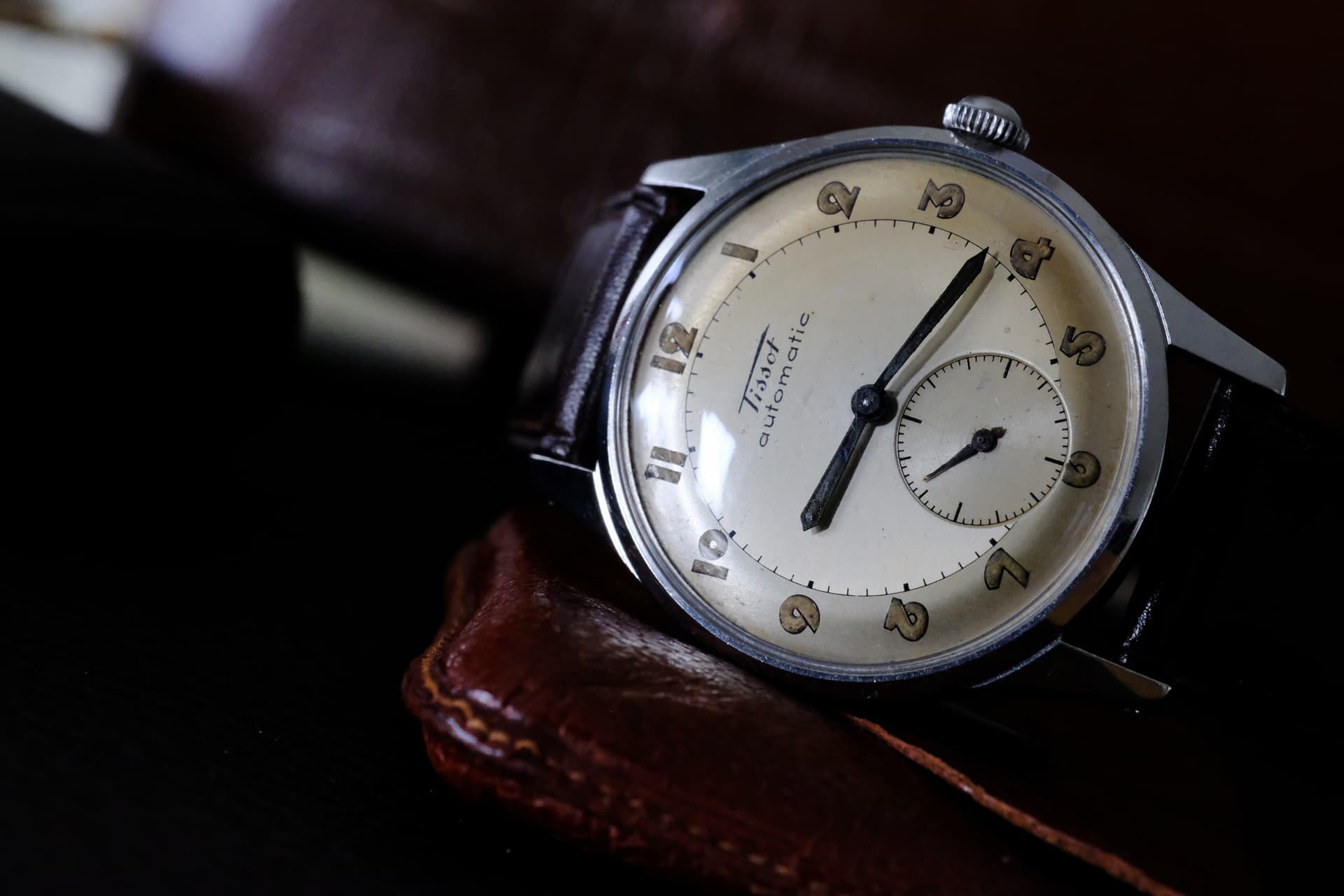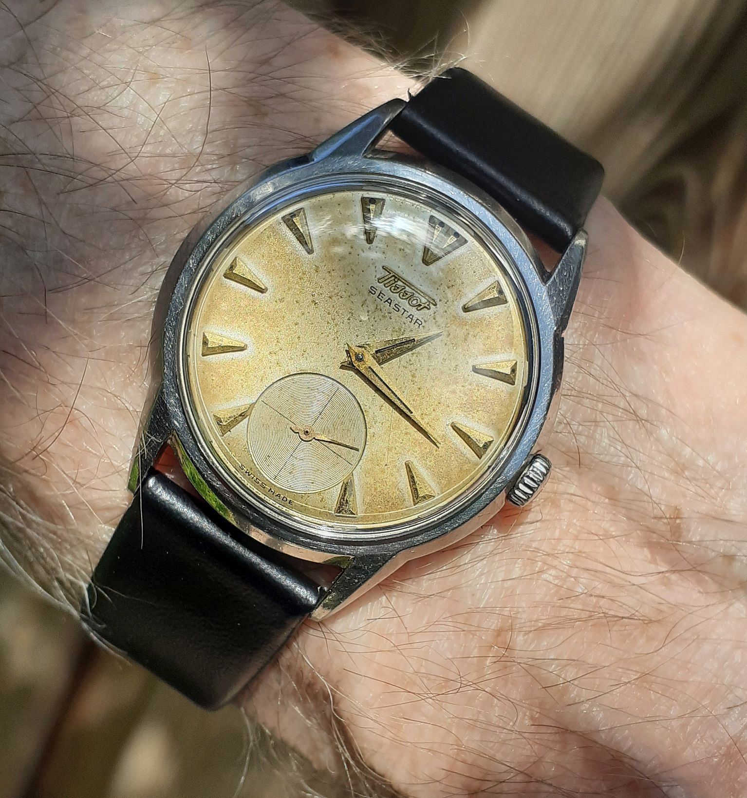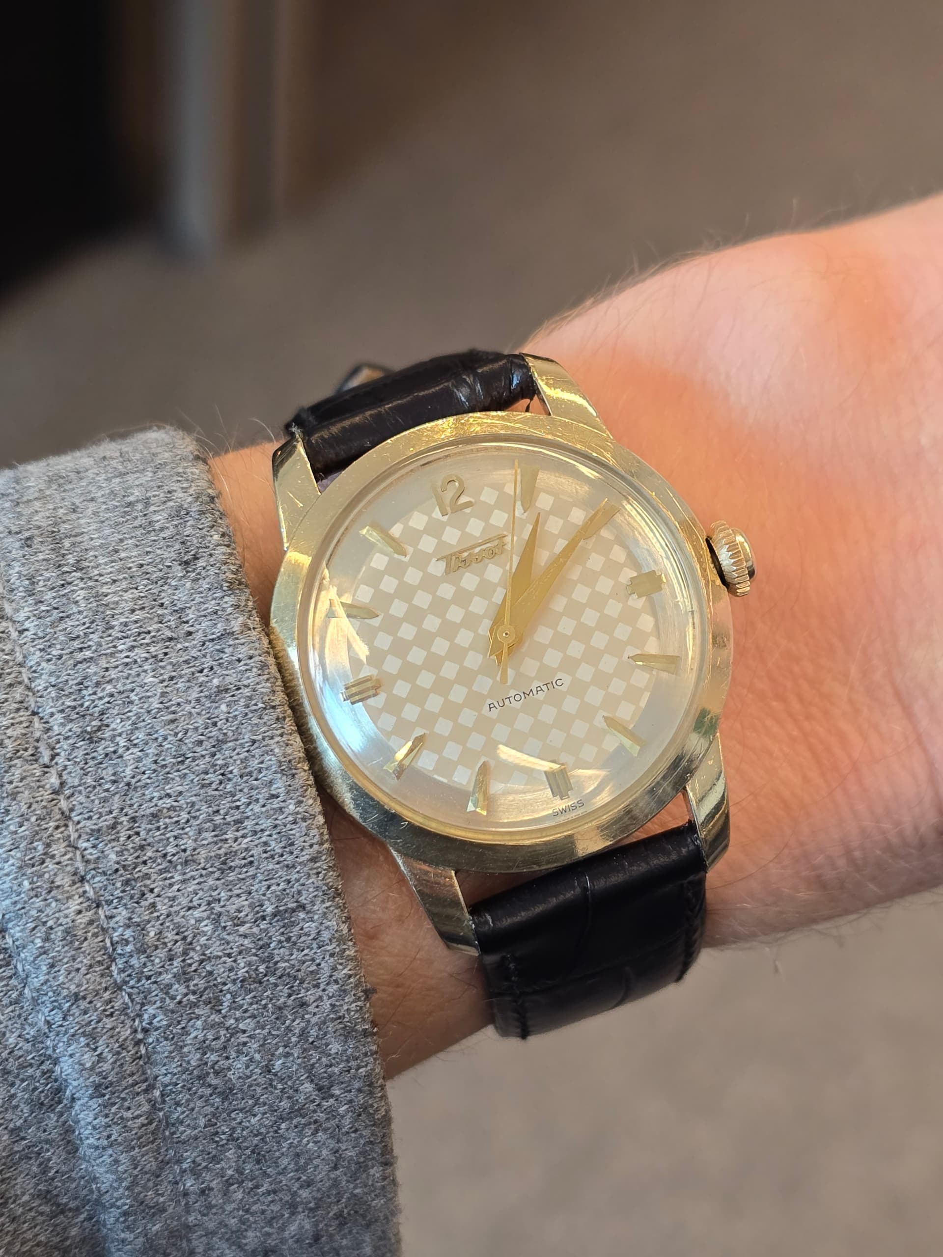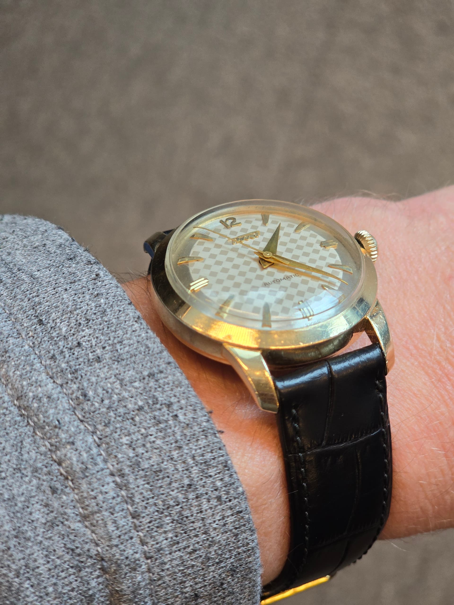 Nog maar een dagje de nieuwe aanwinst, de “chequerboard” rotorautomaat uit omstreeks 1957. Er staat overigens een inscriptie in het achterdeksel uit januari 1961. Nu is dit een is de VS ingekast horloge, dus wellicht lagen de binnenwerken nog een poosje daar op de plank voordat ze in een kast gezet en uitgeleverd werden.