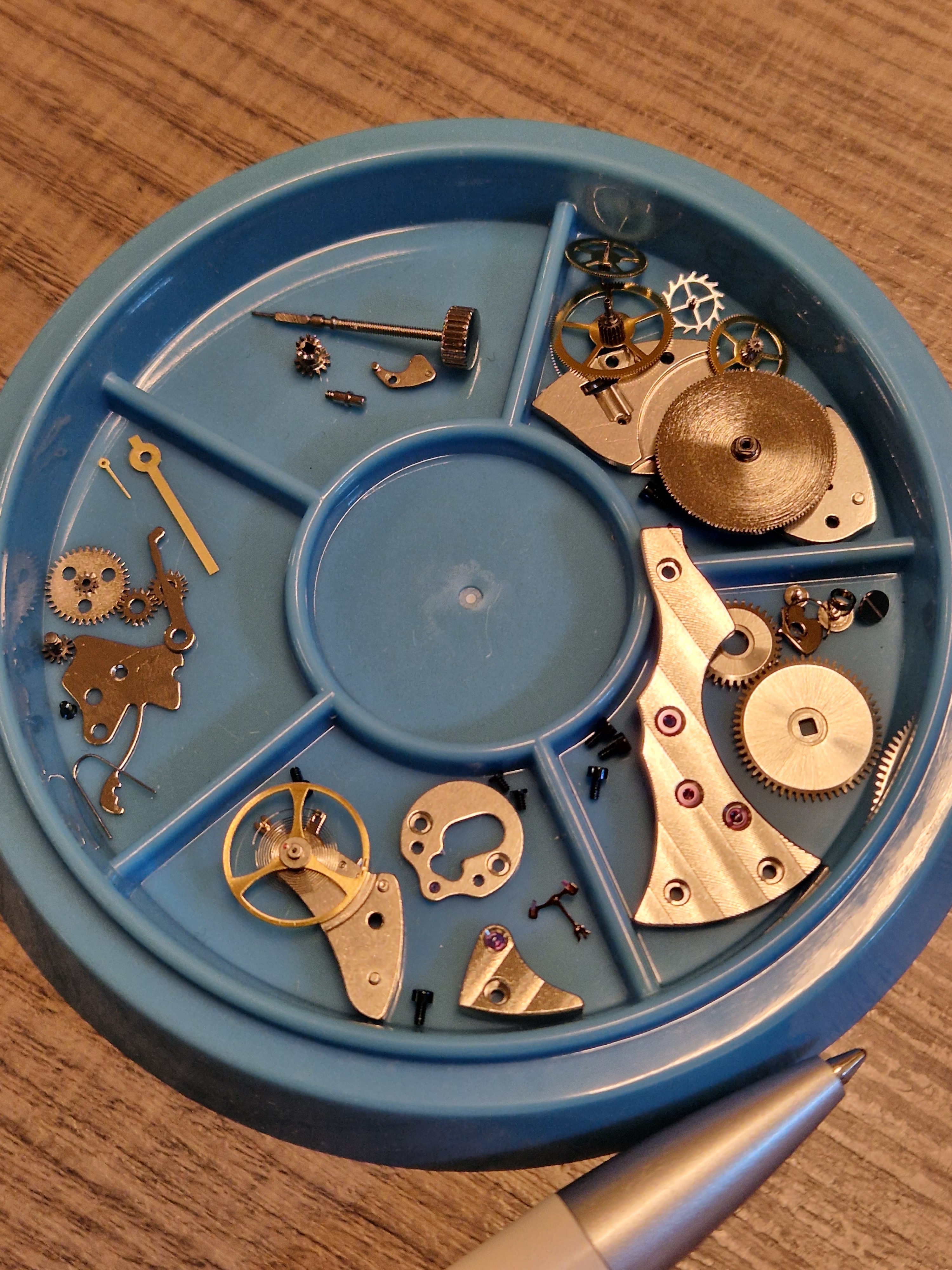 Maar mijn vrijpostige onderdeel bleek gewoon in m’n uurwerk gevallen te zijn, en het was geen veertje. Ik ben vandaag thuis ook nog even in een verloren uurtje aan de bak gegaan, en toen schoot het ronde veertje bij het opwindrad wel weg. Nondeju.