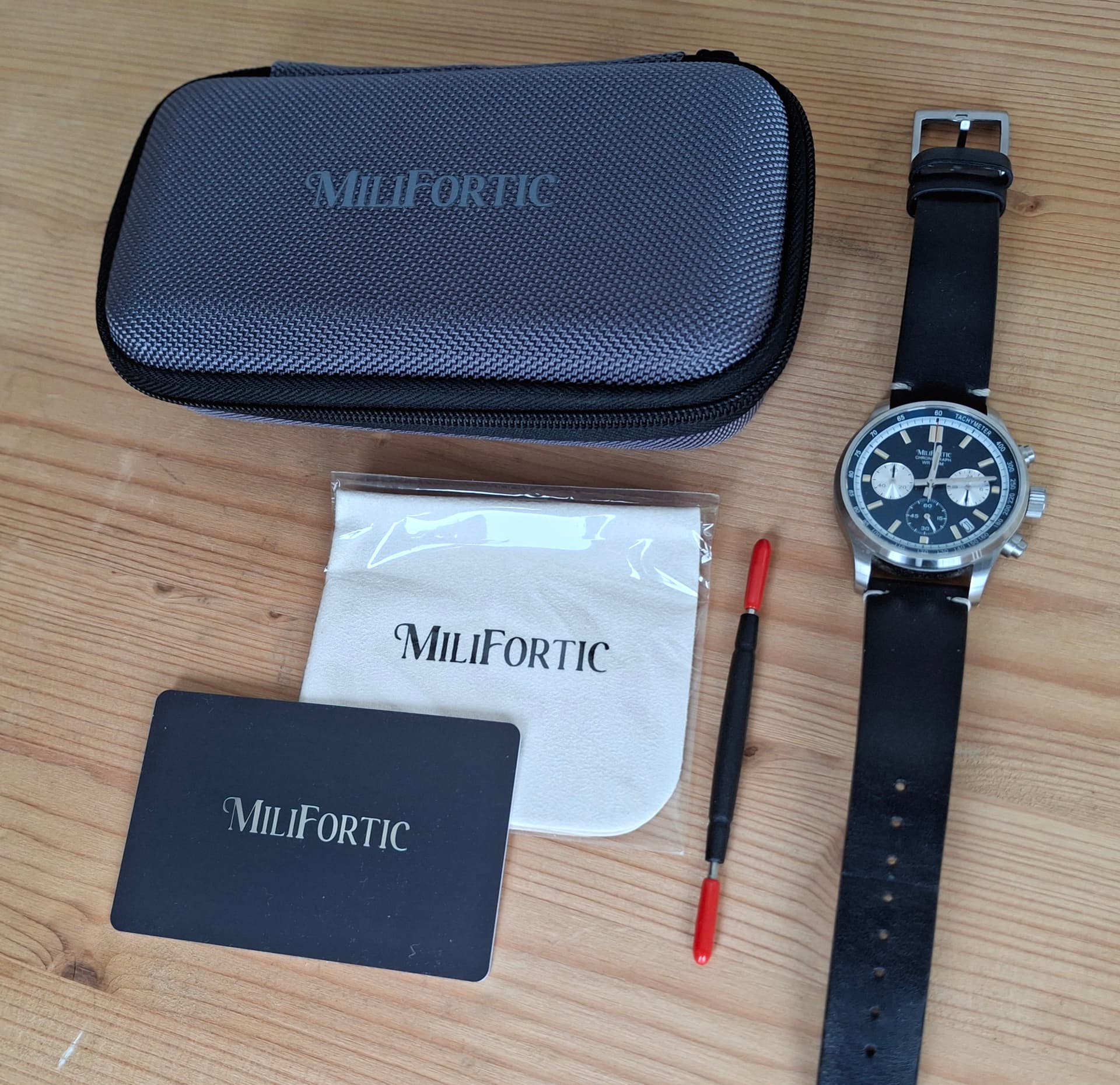 Te koop: een milifortic chronograaf Meca-quartz complete set met handige travelpouche.