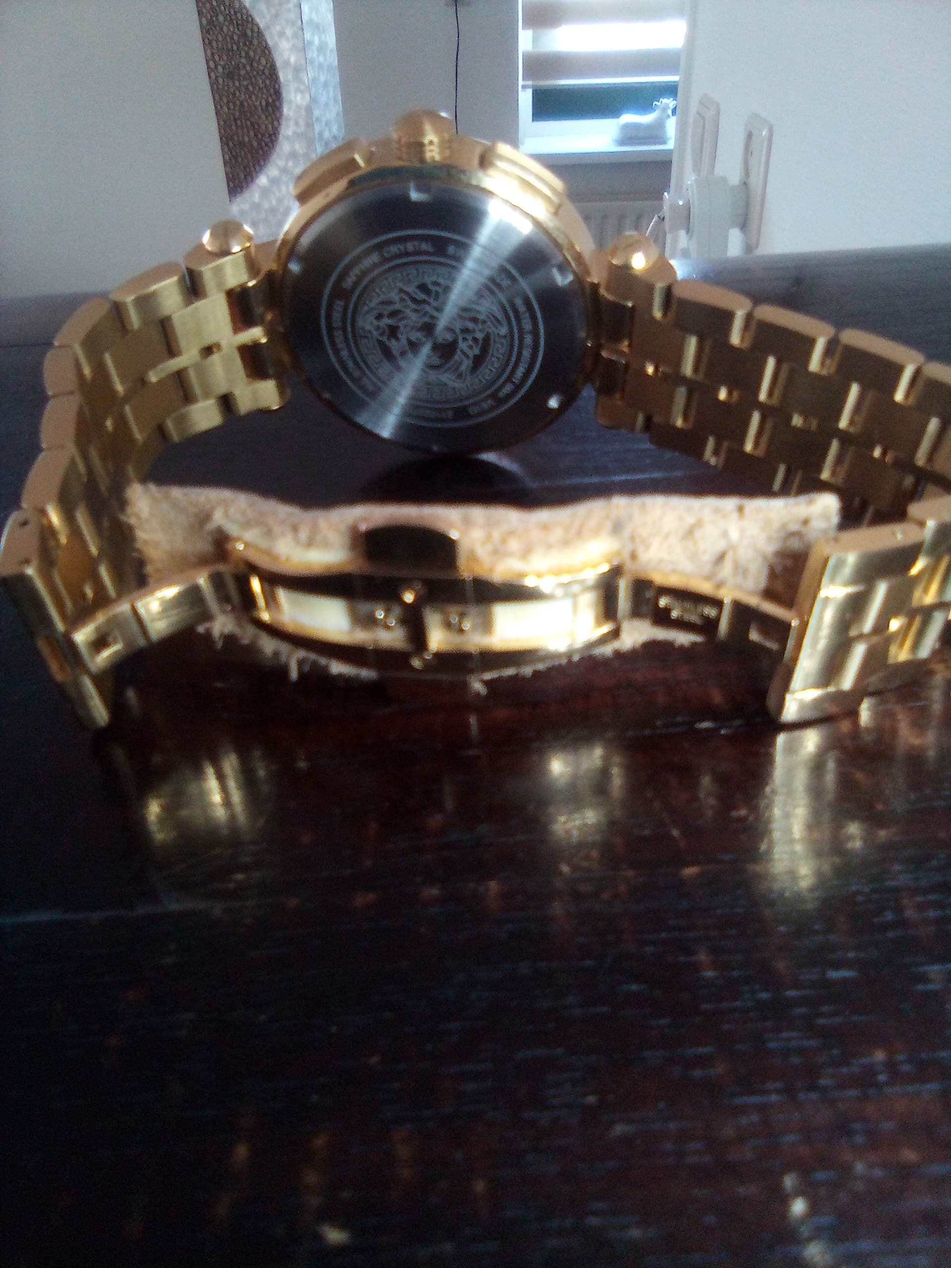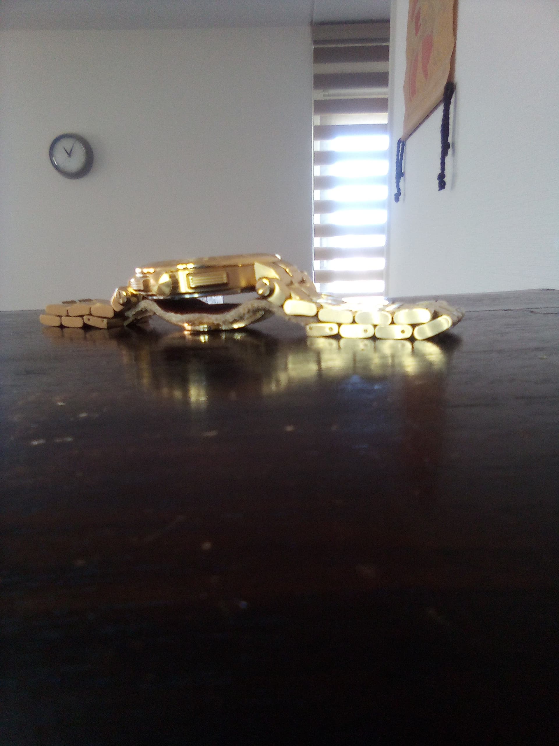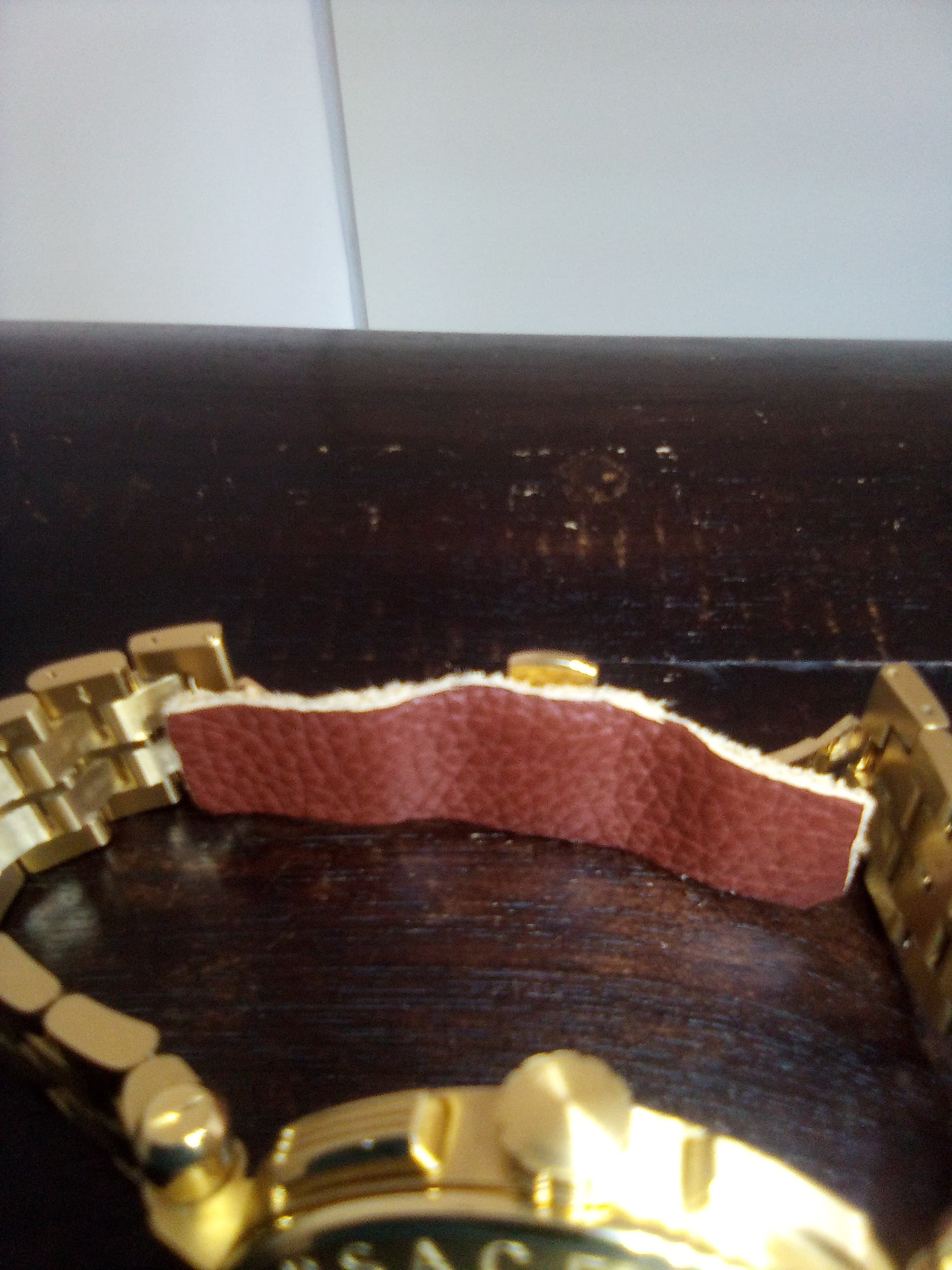 Ik heb een soepel lapje dik leer op maat gemaakt van de vlindersluiting en dit met 1mm dik dubbelklevend band op de sluiting bevestigd. Let op, de schakelband heb ik eerst verruimd met 1 schakel. Met het leer downsize ik de maat van de te wijde band. Het stukje leer heb ik lang genoeg gehouden, om eventueel korter te knippen. Zodat er wat meer ruimte komt. Vooralsnog na 1 week dragen is dit niet nodig geweest.