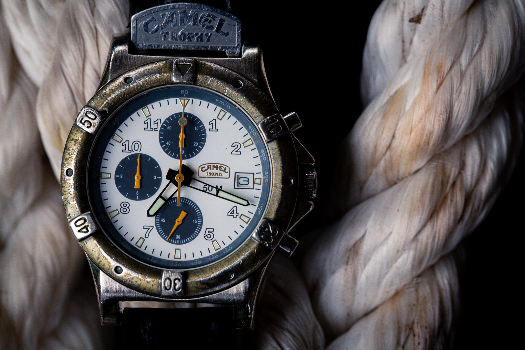 Ik herinnerde me meteen die advertenties, volgens mij in de Donald Duck, maar kan ook de tvgids geweest zijn, met zo’n iconische gele Land Rover, kisten op het dak, een man in Camel-blouse… en dit horloge om zijn pols. Die beelden maakten toen indruk, en dit horloge wilde ik destijds dolgraag hebben.