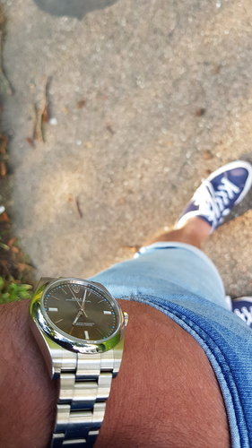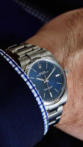 Ik ben geen Rolex kenner/liefhebber, maar de Oyster Perpetual vind ik wel een klassieke schoonheid. Veel mooier door de subtielere indexen en de rustiger band. Het gaat meer om het horloge in die combi voor mijn gevoel. Het ontbreken van datum en loep is ook een groot voordeel (heel groot).