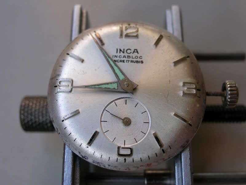 Na een lange tijd is mijn eerste knutselproject afgerond. Nog even het geheugen opfrissen: het gaat hier om een Inca met een Cupillard, kaliber 233 (uitgezocht door Paul K). Het uurwerk liep niet goed, de opwindas stond vast en de minutenwijzer was verdwenen.