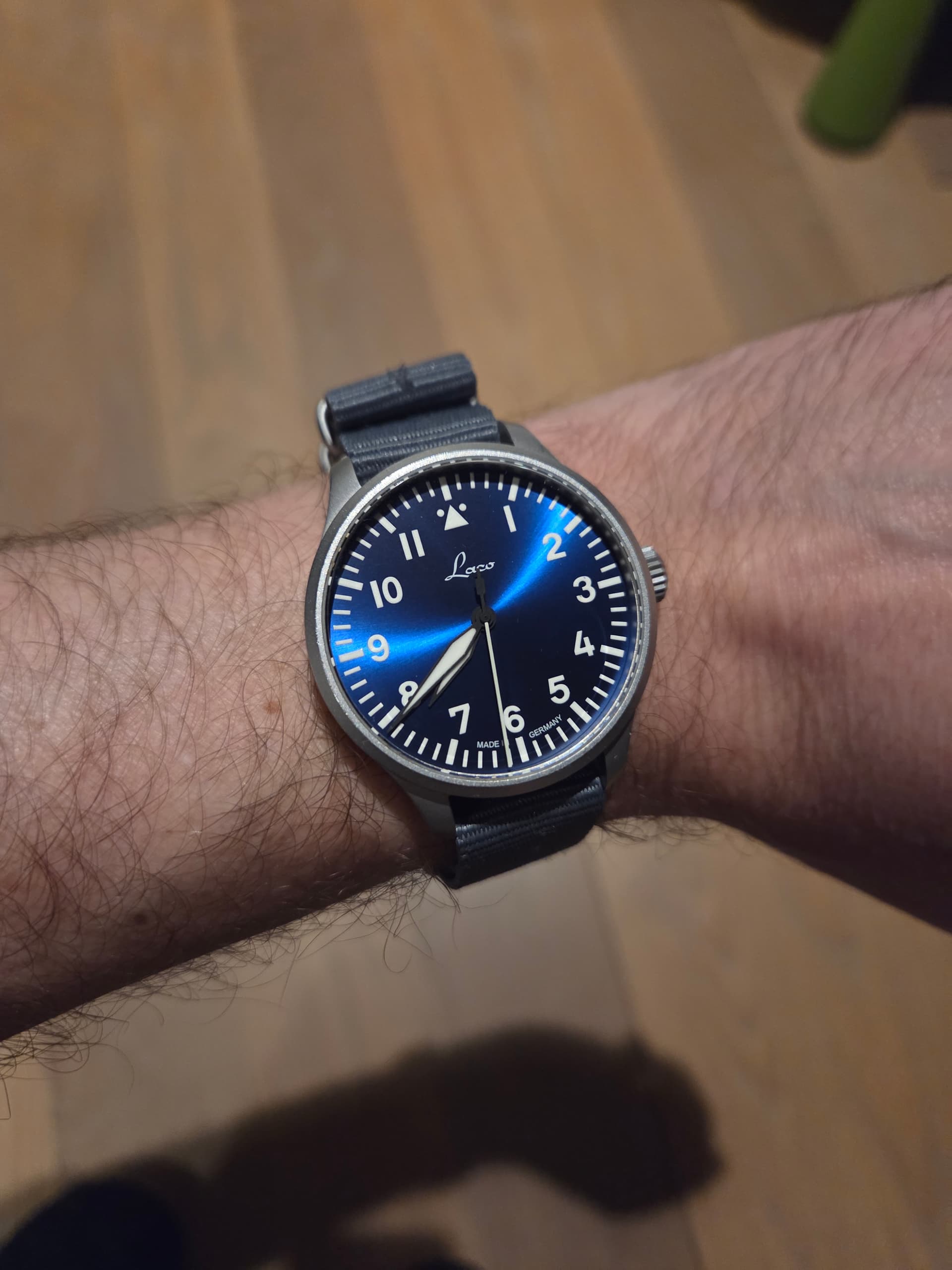 Mijn Flieger is een Augsburg Blau 39mm met upgraded loopwerk en saffier. Fijn horloge, maar met 18mm zijn de bandjes wat iel. Sinds ik het horloge op een nato heb gezet ziet het er beter uit. Perfecte Lume.