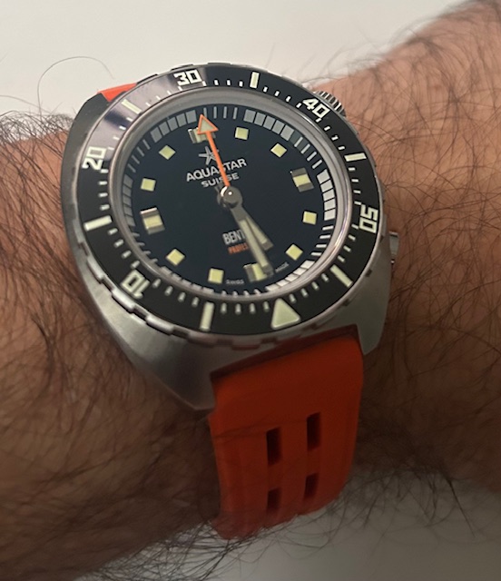 Nou klaar dus. Helaas niet. Te diep in de rabbit hole. Want als je dan blijft lezen over Doxa kom je via Rick Marei altijd bij Aquastar… en toen vond ik iemand in Canada die de nieuwe Aquastar Benthos Professional voor weinig geld weg wilde doen, met een oranje Isofrane strap én de beads of rice, én ook nog eens voor werk in Nederland moest zijn. Ja dan ga ik voor de bijl natuurlijk. En ook voor die Aquastar val ik dus keihard, wat is dat een mooi ding zeg.