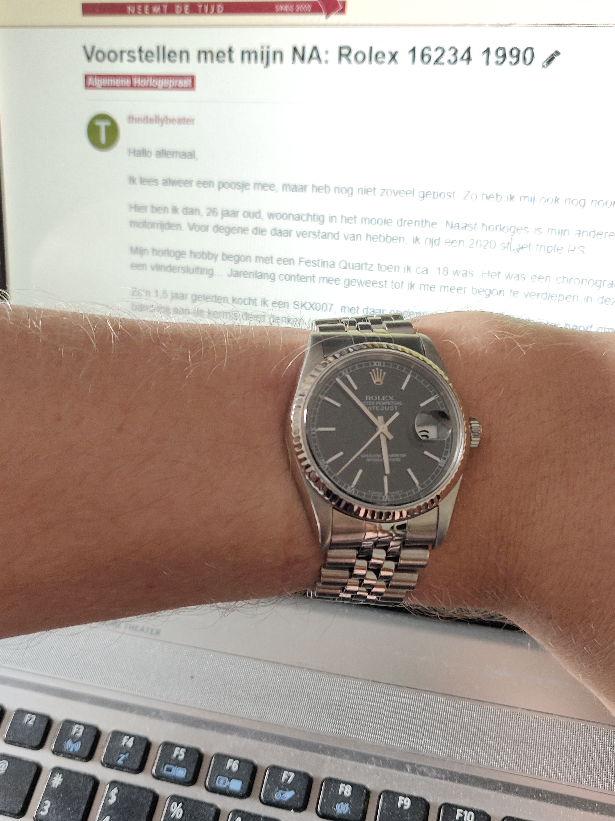 Het is voor mij geworden een 16234 uit 1990 zonder B+P watch only. Eerst hechte ik daar wel veel waarde aan omdat het ook zo gehyped wordt door mede fanaten… maar toen ik het horloge eenmal omhad boeide me dat niet meer zoveel. Deze is voor mij gelinkt aan een verhaal. Een verhaal uit mijn leven, wat net als dit horloge, niet meer weggaat (in ieder geval niet door verkoop :P).