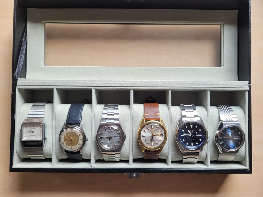 Inmiddels is de doos netjes gevuld met 6 stuks en ben er wel even tevreden mee. Het zijn voor nu stuk voor stuk denk ik wel blijvertjes, met sinds vandaag de laatste toevoeging mogelijk in deze doos (horloge om de pols geeft ook ruimte in de doos en anders een extra doos).