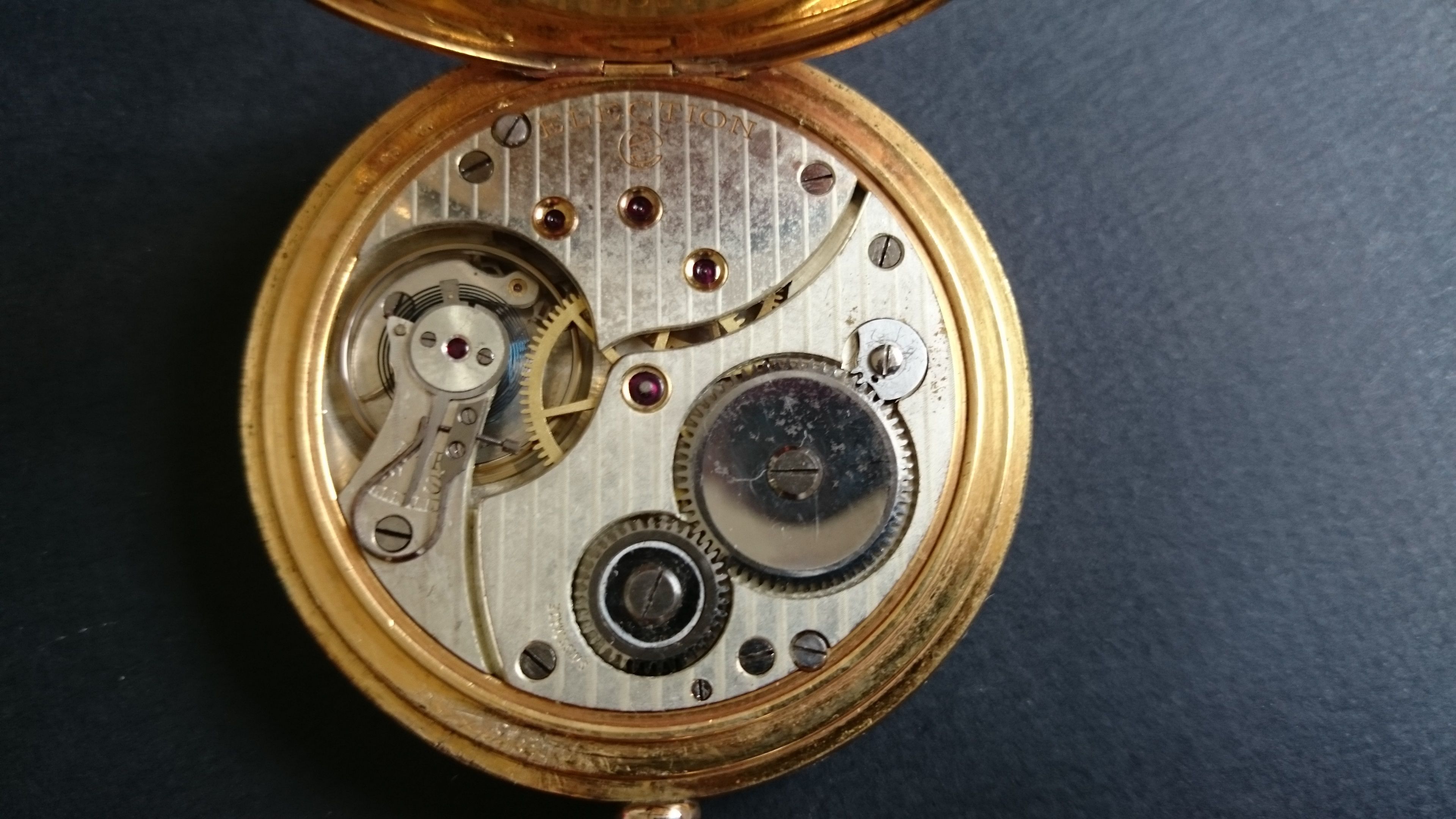 Sinds iets meer dan een jaar ben ik echt aan het verzamelen geslagen. Mijn eerste antieke zakhorloge was een gouden Chronometre Repetition uit ca 1910 (patent uit 1905) met repetitieuurwerk. Ik vond het mechanisme met de gongen simpelweg geweldig! Deze is na 8 maanden eindelijk klaar om weer opgehaald te worden bij de juwelier, ben benieuwd! Foto’s zijn van voor het onderhoud/restauratie.