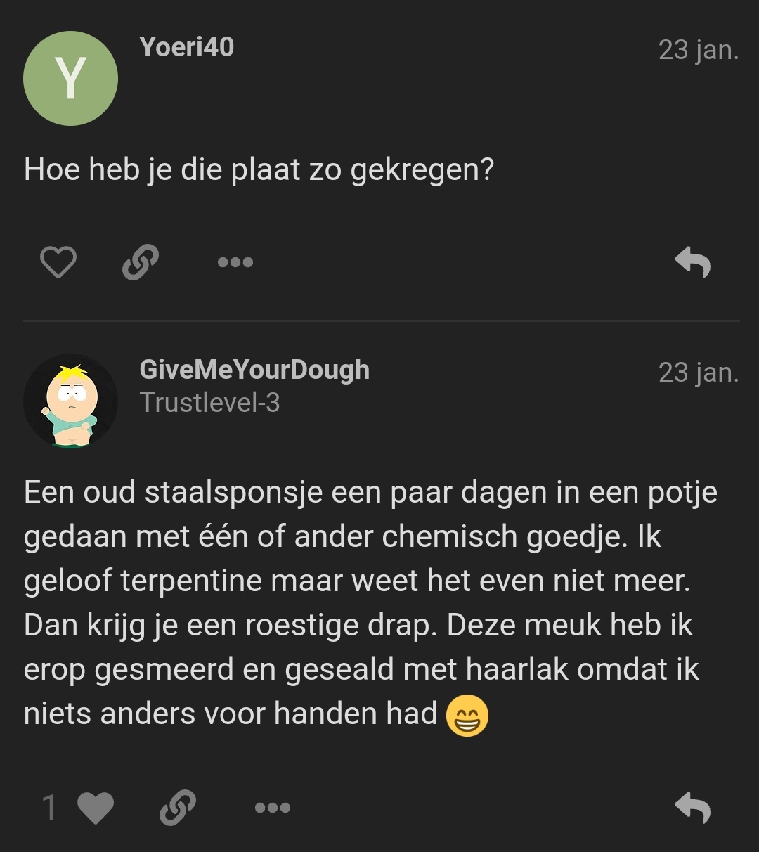 Zelfgemaakt roest door middel van staalspons en azijn. Na het aanbrengen van het roest en het laten drogen gefixeerd met matte blanke lak