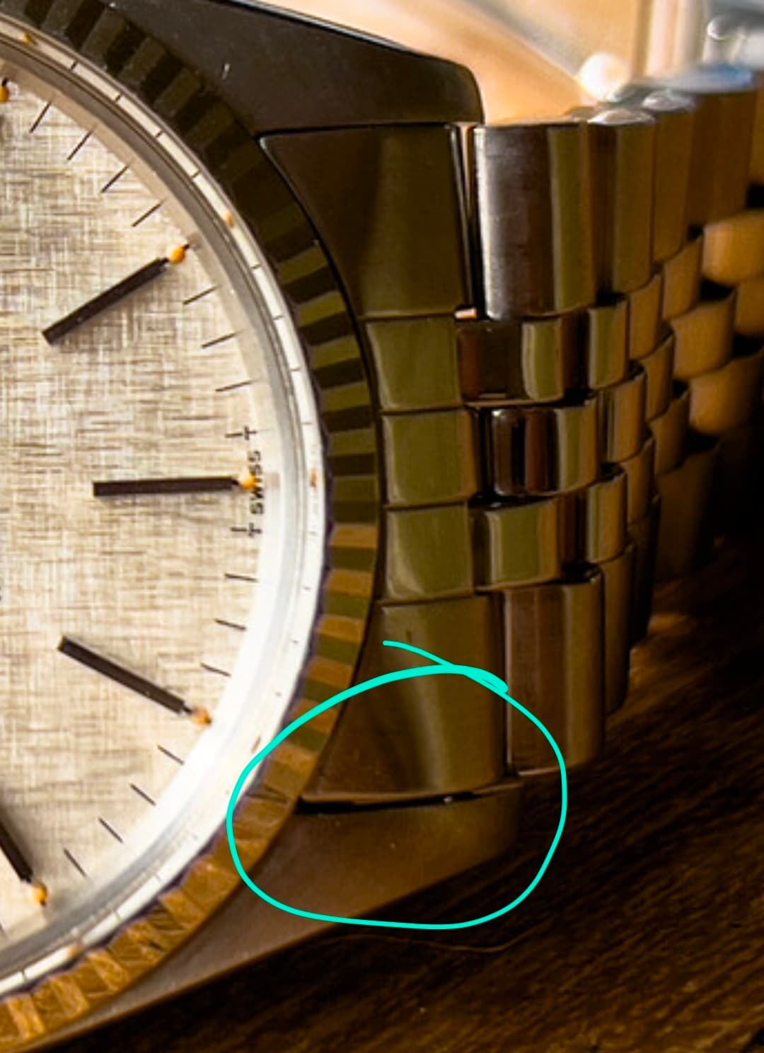 Aansluiting van de endslugs met de kast is met hollow links altijd een lastige… ik zie het inderdaad ook, maar dat is voor mij geen dealbreaker… eventuele oxidatie zou wel gek zijn… kast en bezel van jouw exemplaar zijn in mijn beleving best aardig vergelijkbaar @Bouwe ?