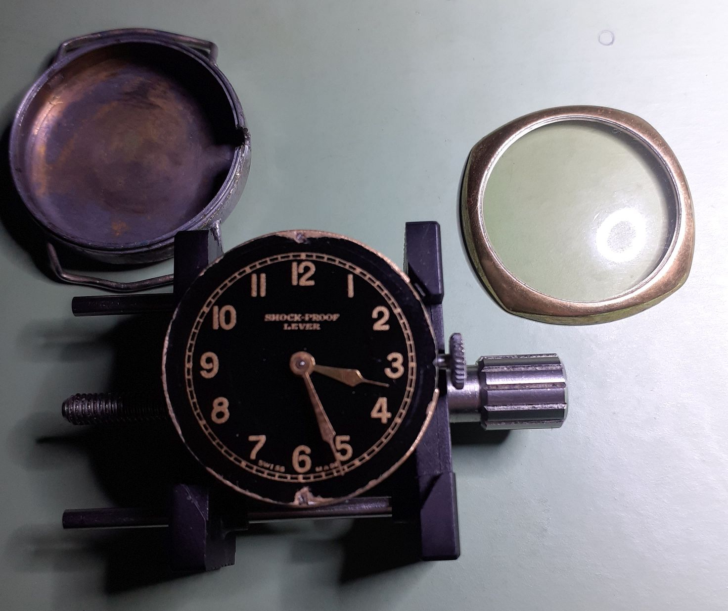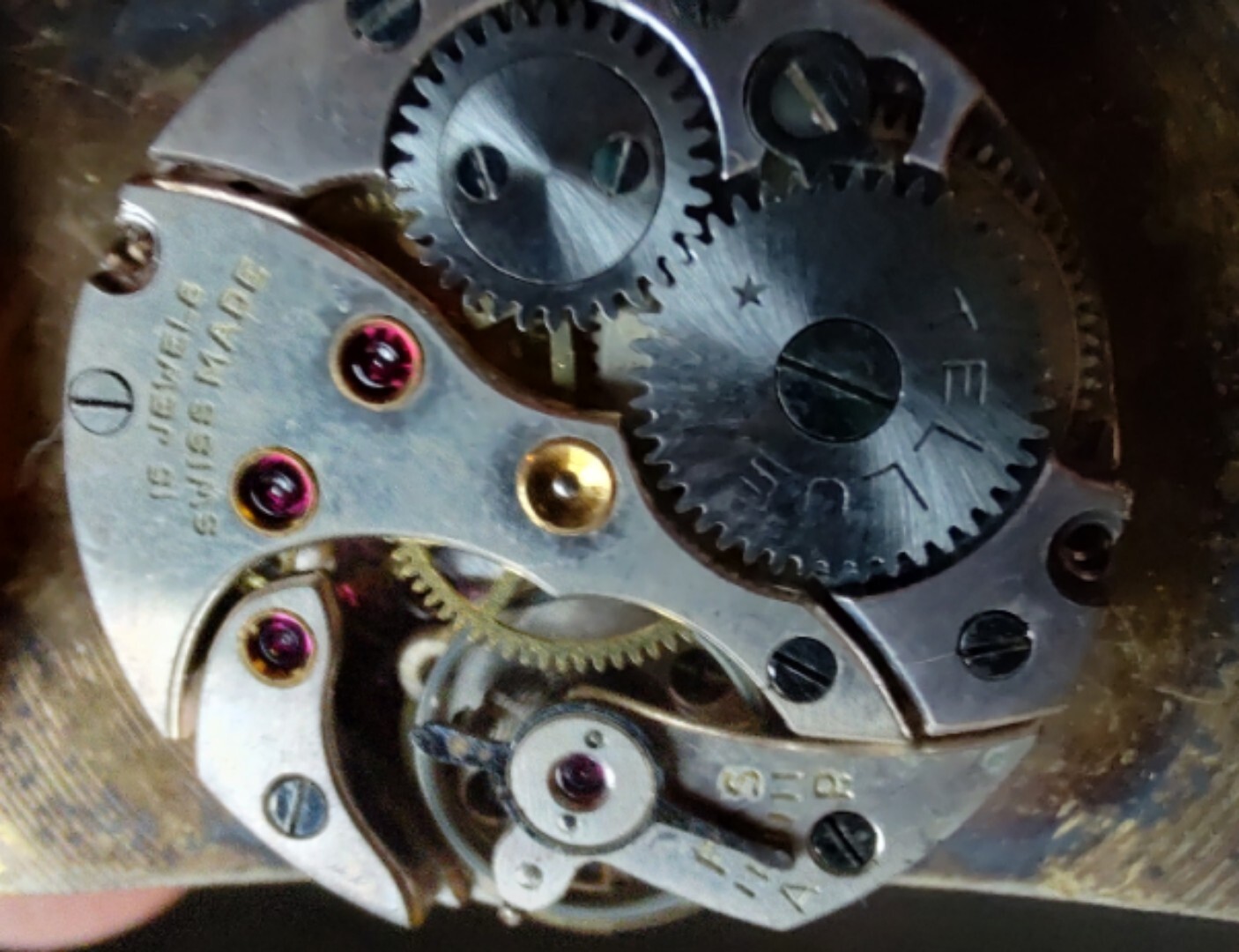 Tijdens het wachten op de cleaning machine van onderdelen van een Universal had ik dit horloge even opengemaakt om te kijken of het loopt, en het loopt. Ik vraag me af wel kaliber het is, en hoe oud het zal zijn.
