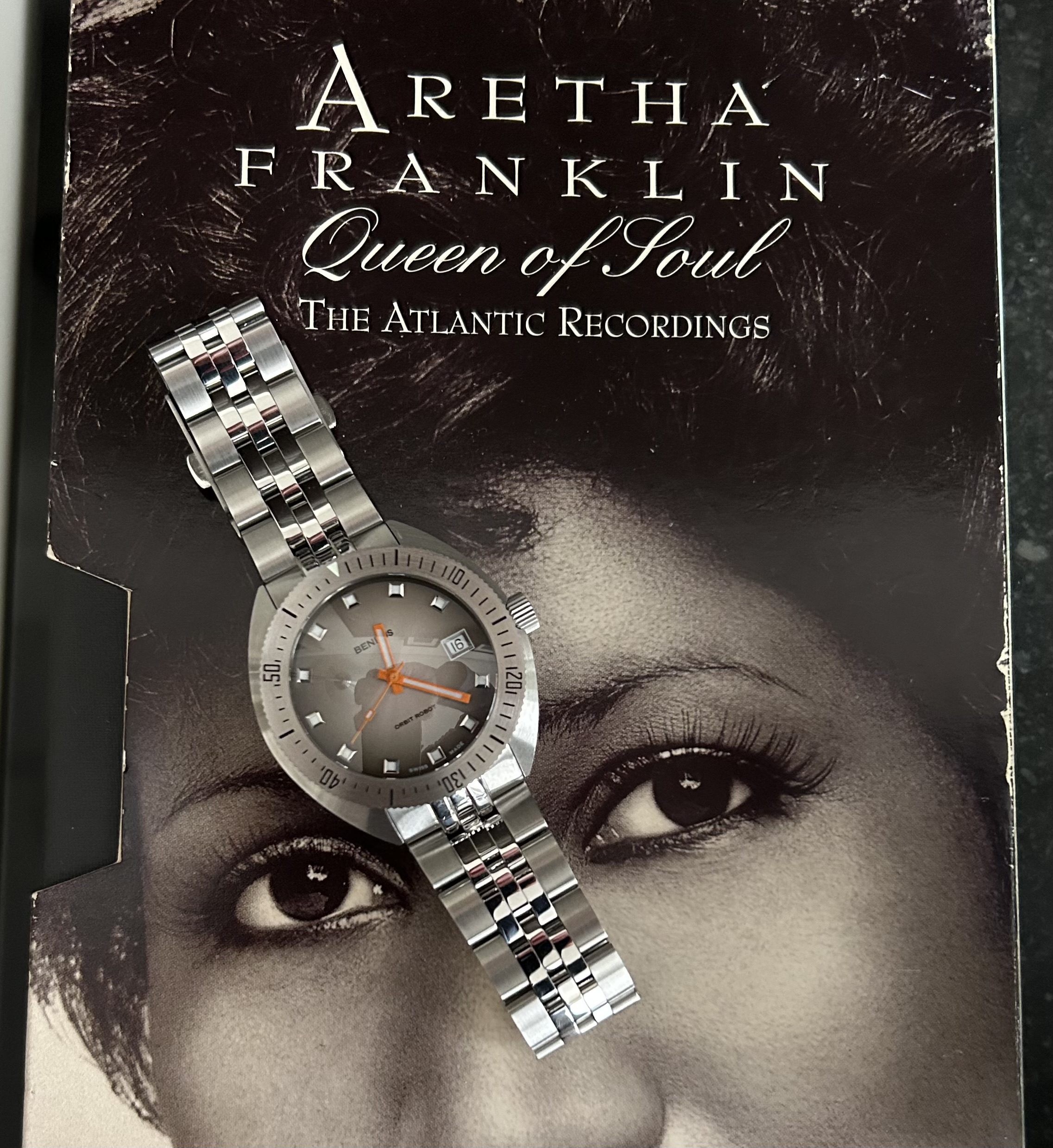Deze fantastische Aretha-cd-box kocht ik in de jaren 90, al was het veel geld voor een student. Maar sommige dingen ‘moeten’ gewoon op het moment, ook als het financieel minder goed uitkomt. Hetzelfde geldt eigenlijk ook voor die Benrus…