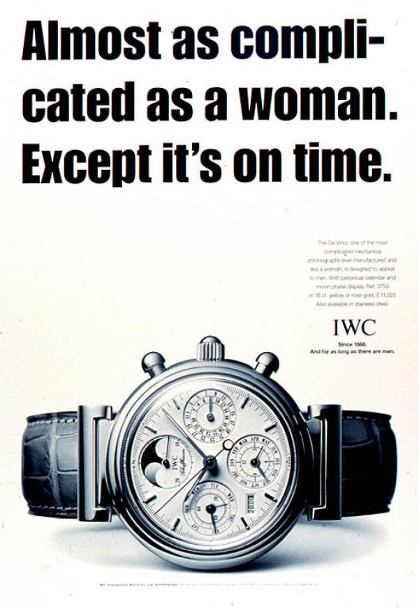 Op het moment dat de marketing een seksistische 1955 oprisping is diskwalificeert een merk zich in mijn ogen. Los van de lelijke lugs en oncoole kastvorm zou ik dus uit principe al niet voor de IWC kiezen.