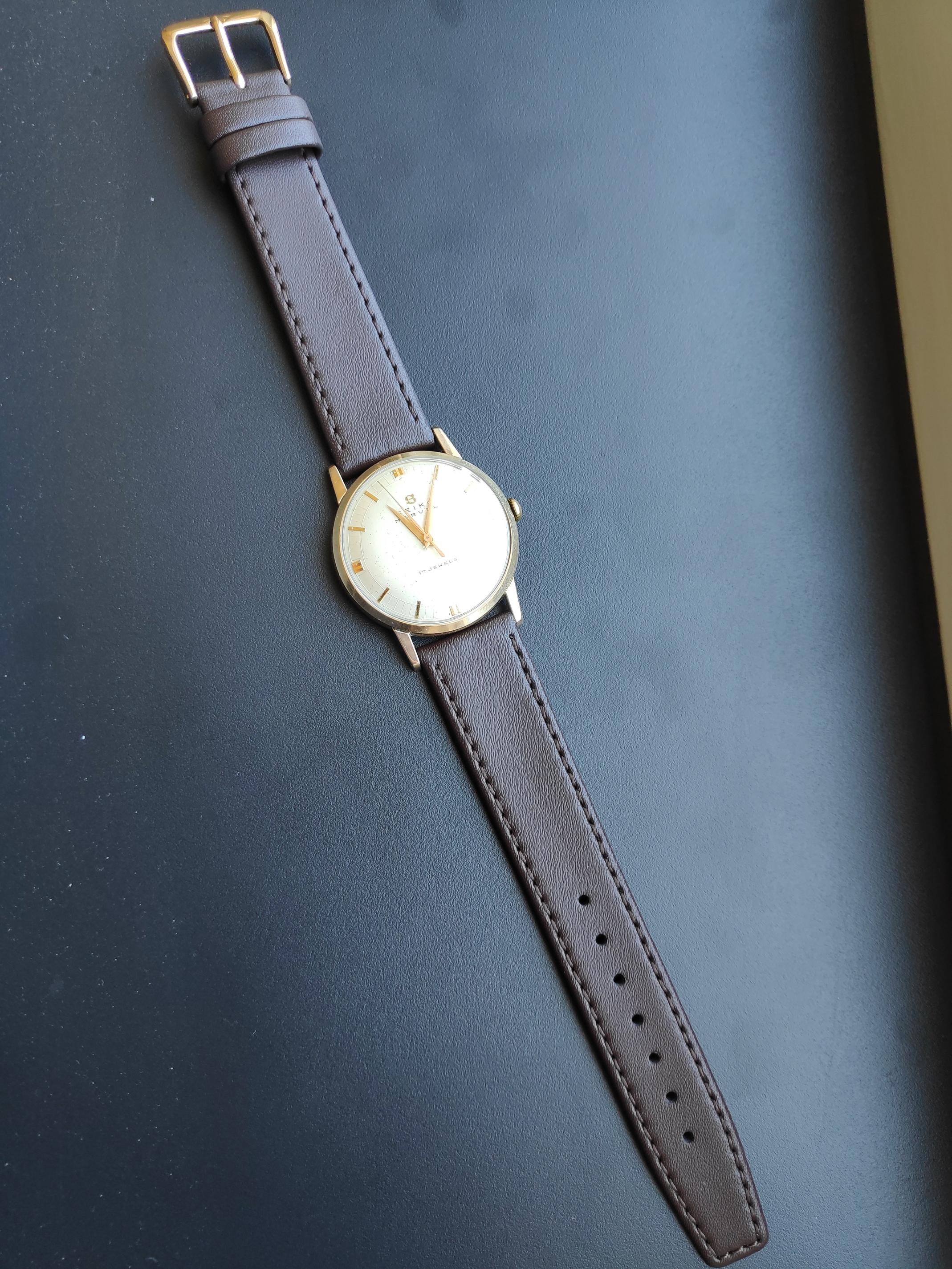 Daarbij zou ik op vrijwel alle dunnere vintage horloges donkerbruin of zwart shell cordovan zetten. Die banden zijn dun, soepel, sterk en zelfsmerend. Kost een paar centen, maar in mijn optiek de perfecte band.