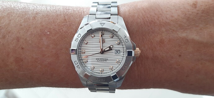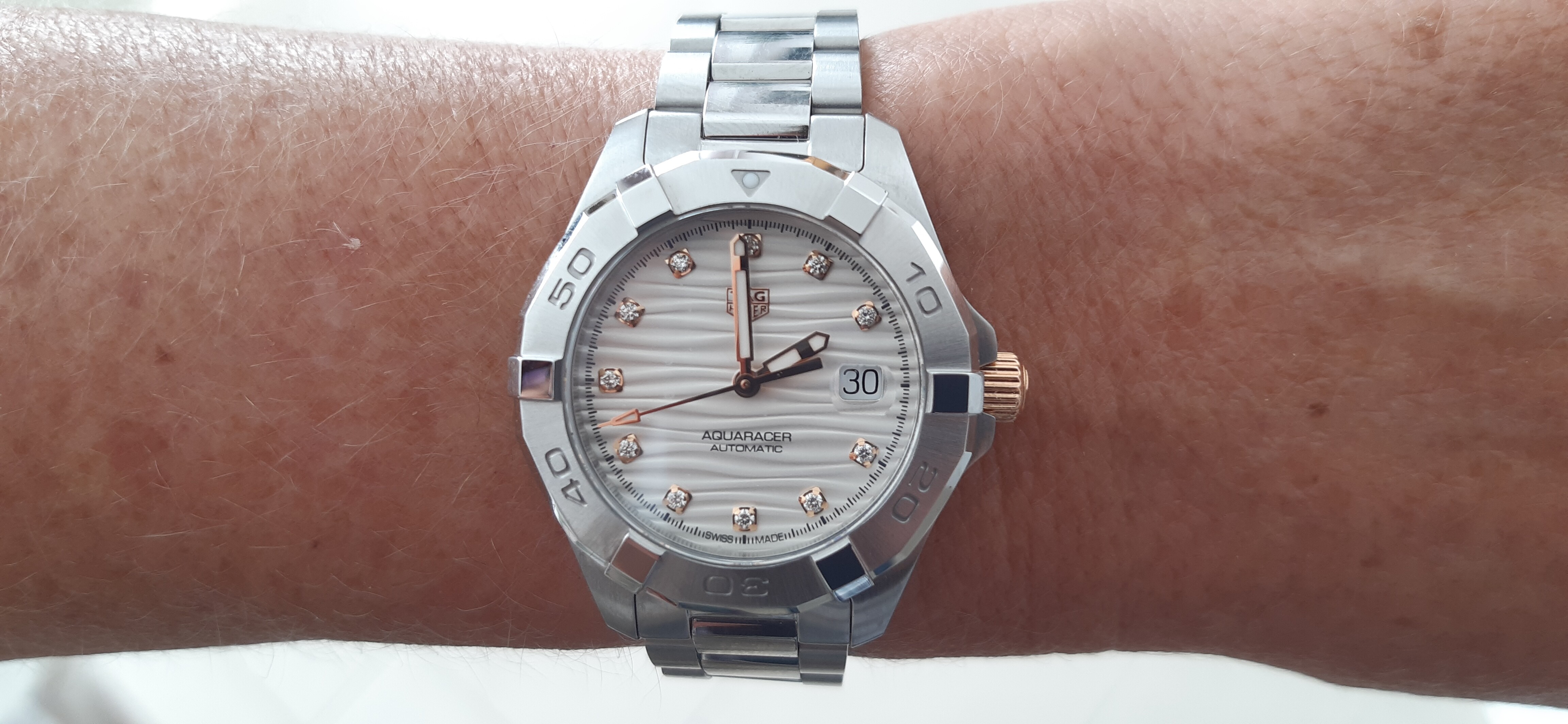 Mijn vrouw afgelopen voorjaar een echt horloge cadeau gedaan, omdat ik het niet langer kon aanzien dat mijn zoon en ik met bijvoorbeeld een Tudor omliepen en zij met een horloge van een mode merk. Ze is blij met haar Tag Heuer Aquaracer en draagt deze dagelijks, maar van mijn liefhebberij/passie/obsessie snapt ze niets! Maar wie weet op een dag?