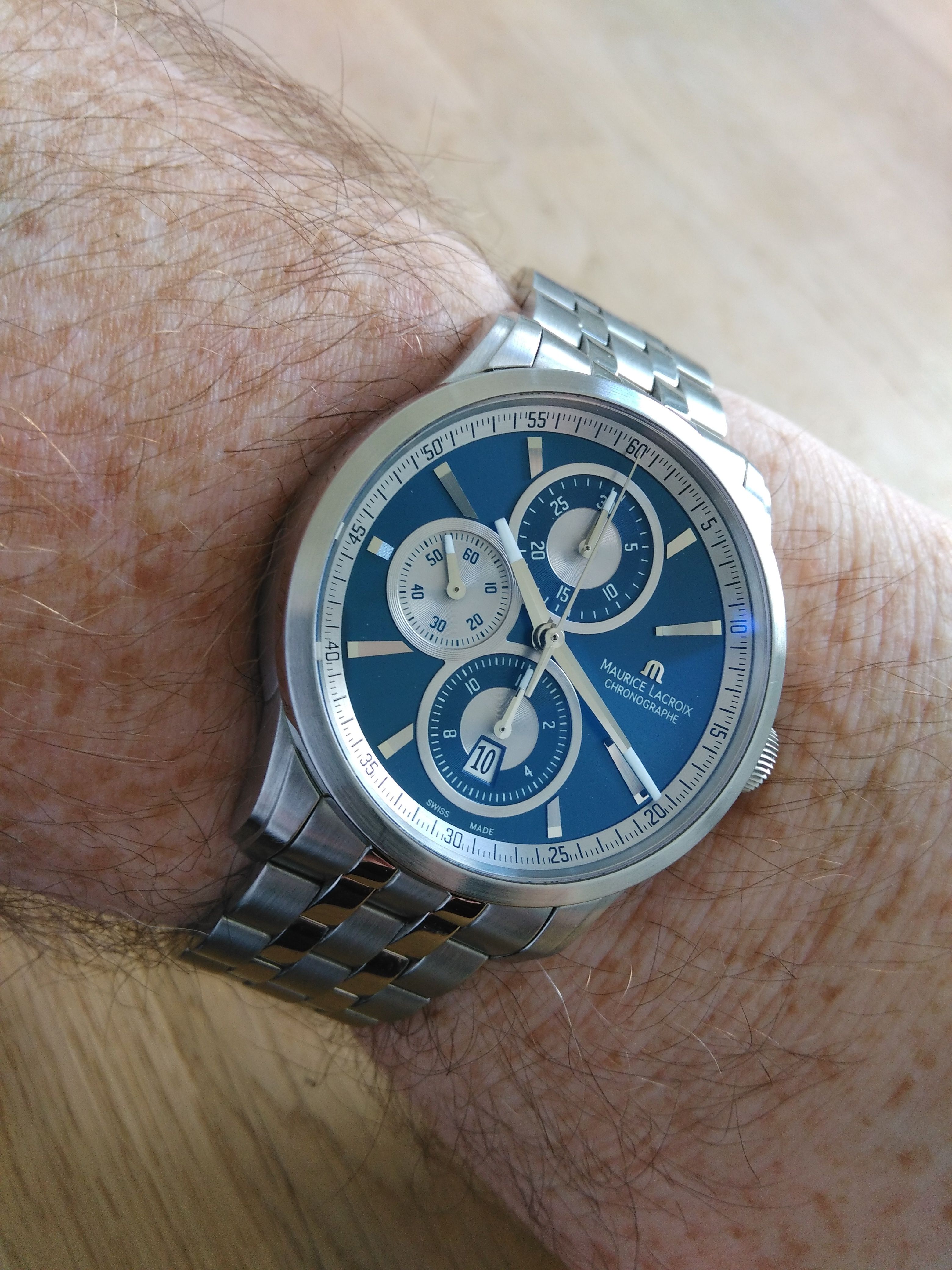 Ik denk echter dat mijn keuze gaat vallen op een merk dat in NL ook niet zo heel populair is, Maurice Lacroix. Ik heb de afgelopen week aardig wat Breitling, Omega, Oris, Tag en zo gezien, maar deze klok vind ik gewoon de mooiste. Waarom? Daarom. Is niet uit te leggen, noemen we smaak. Prachtige blauwe plaat, eigenzinnig design en een heel mooie band.