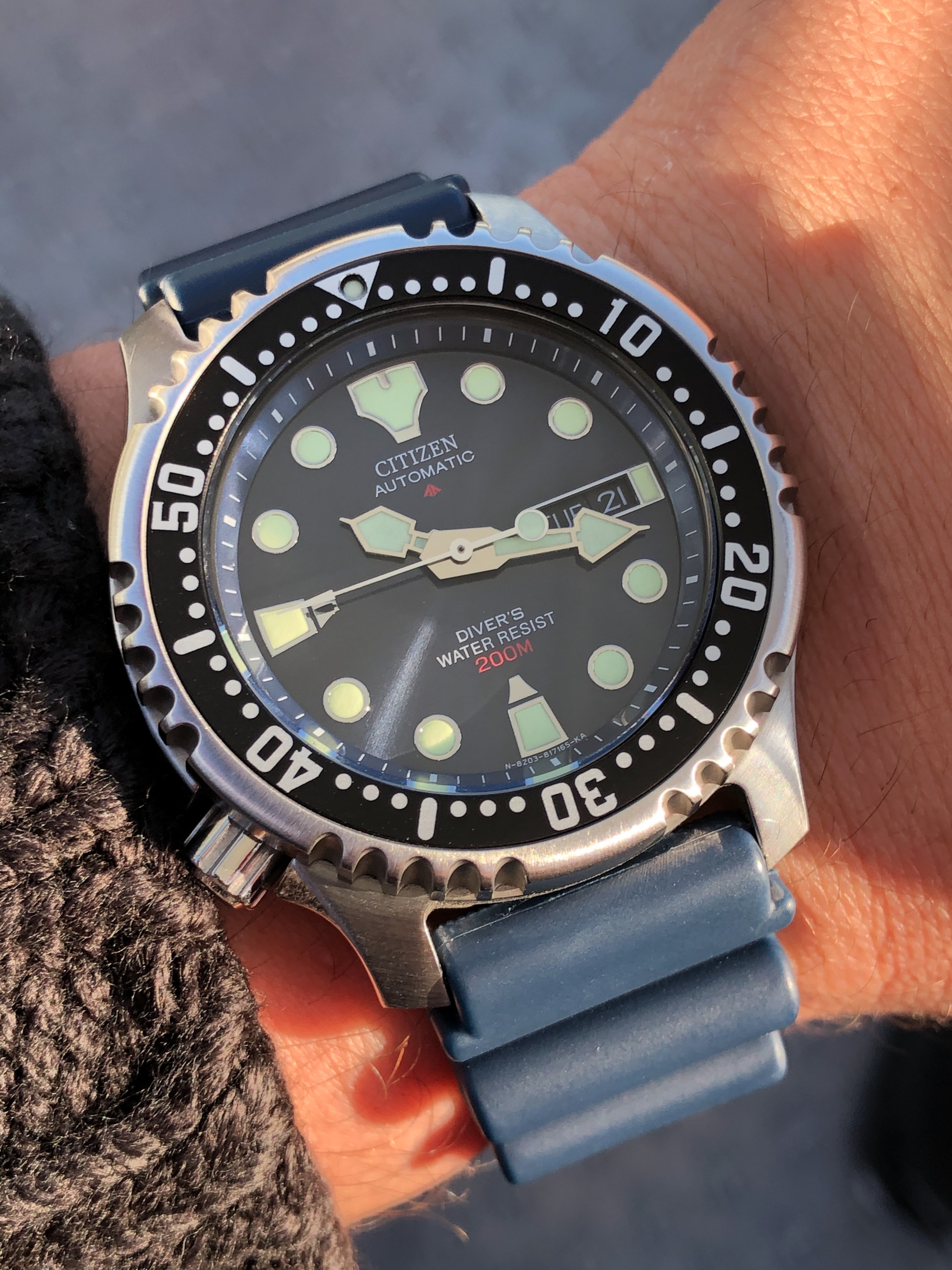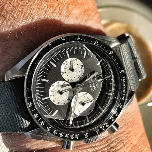 Hij blijft genieten. Elke keer wil ik die andere bezel er op zetten maar dan hou ik hem toch weer zo. Hij doet het ook zo lekker op een nato.
