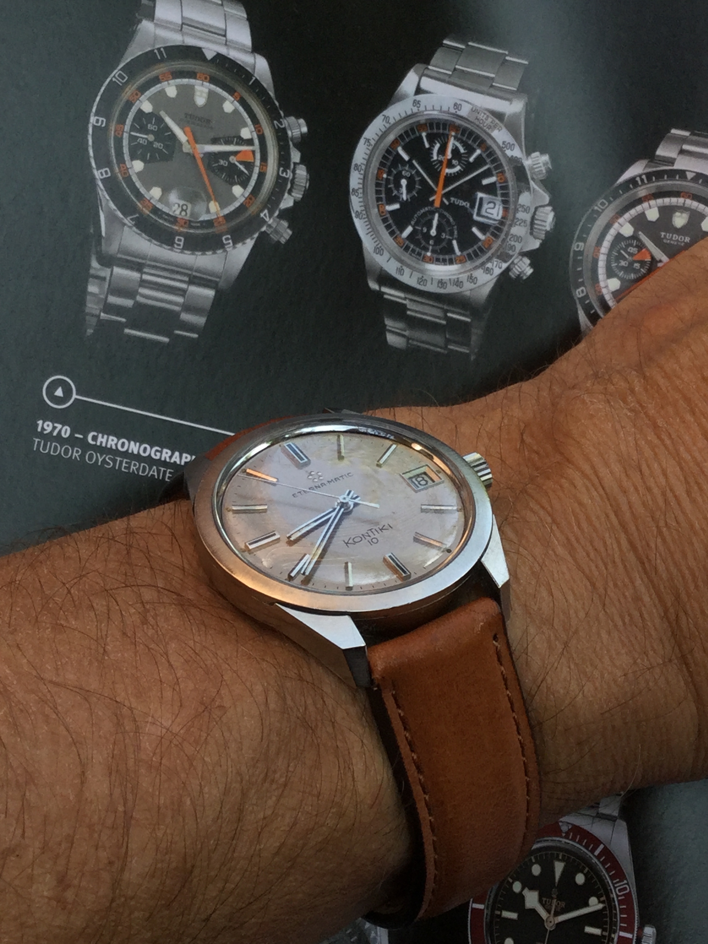 Check deze fraaie Eterna Kontiki 10 zwevend boven de Tudor brochureā¦