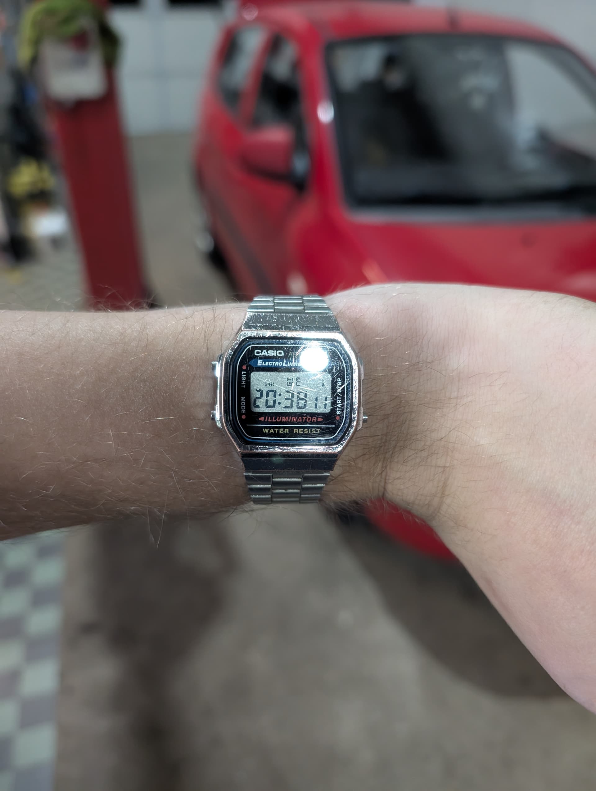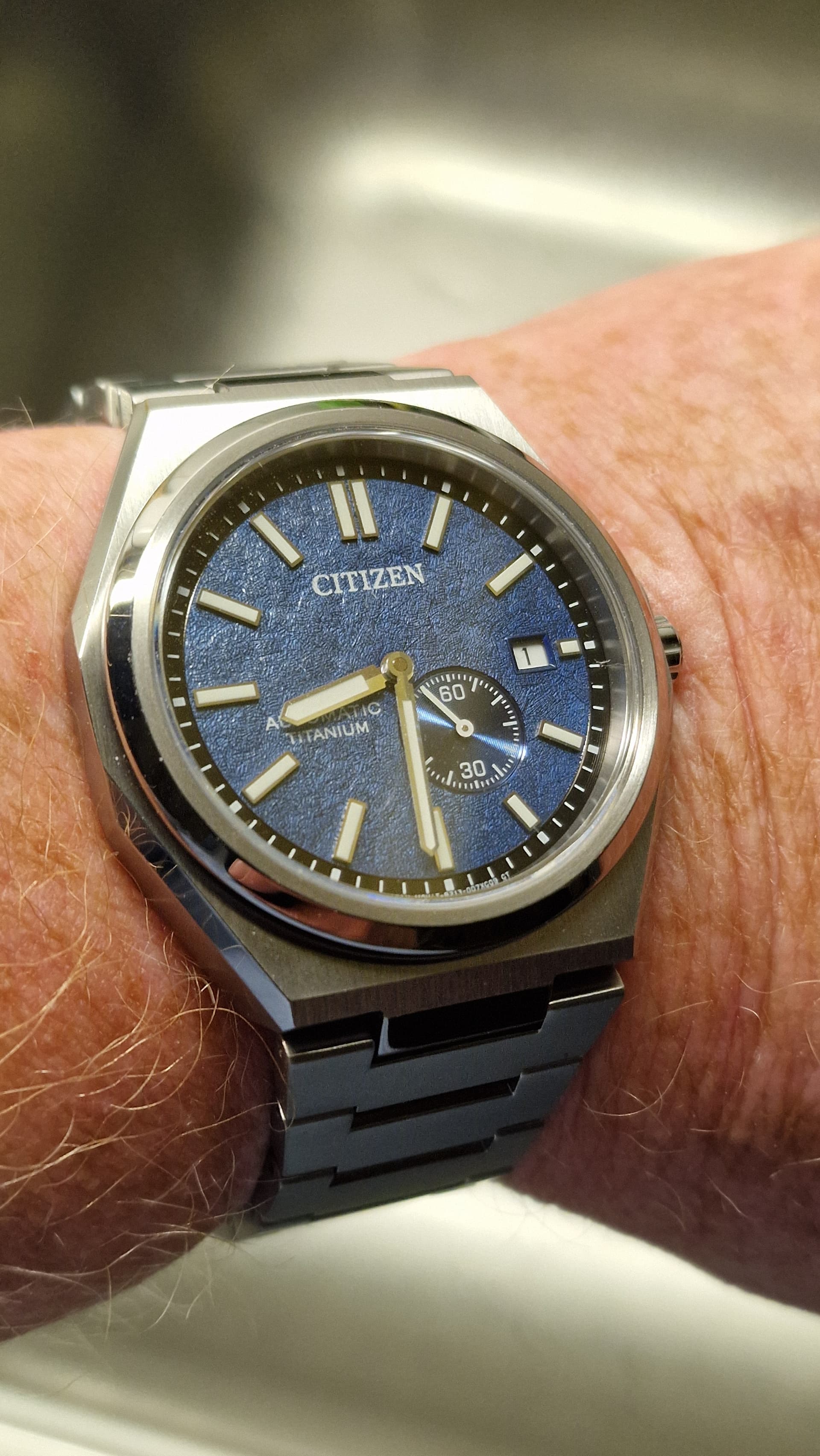 Ja, hij ziet er nog netjes uit. Wel 2 krasjes op het glas, maar zie je alleen vanuit bepaalde hoeken.