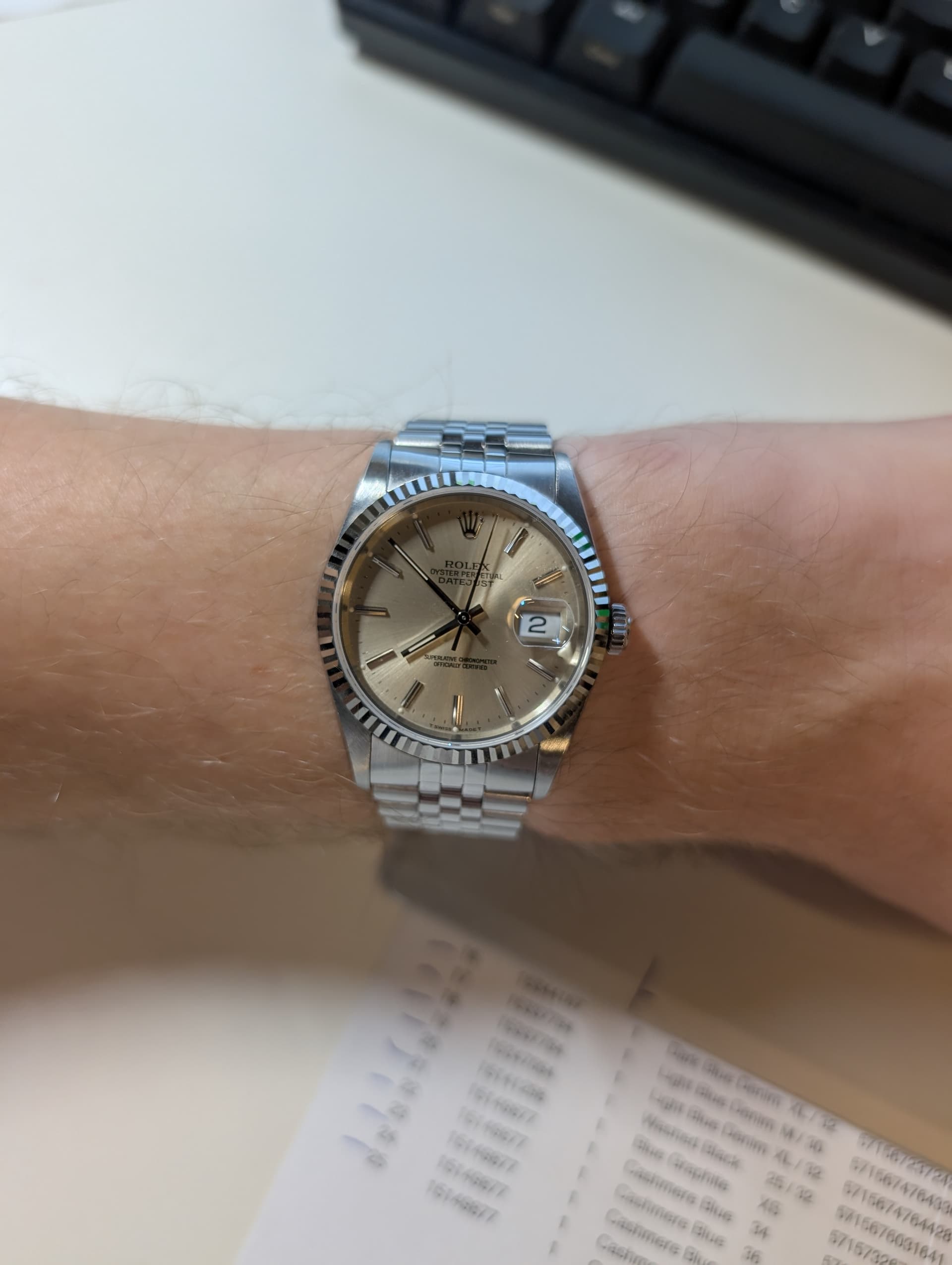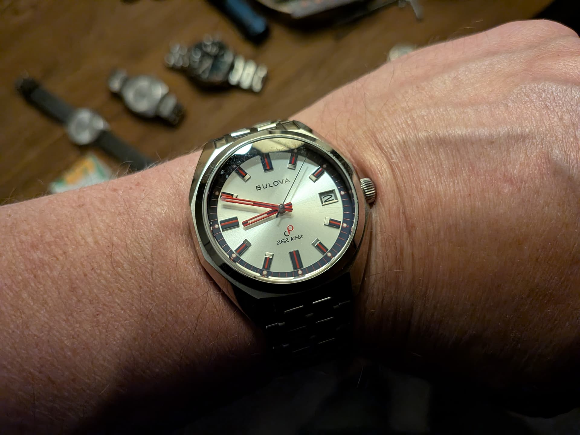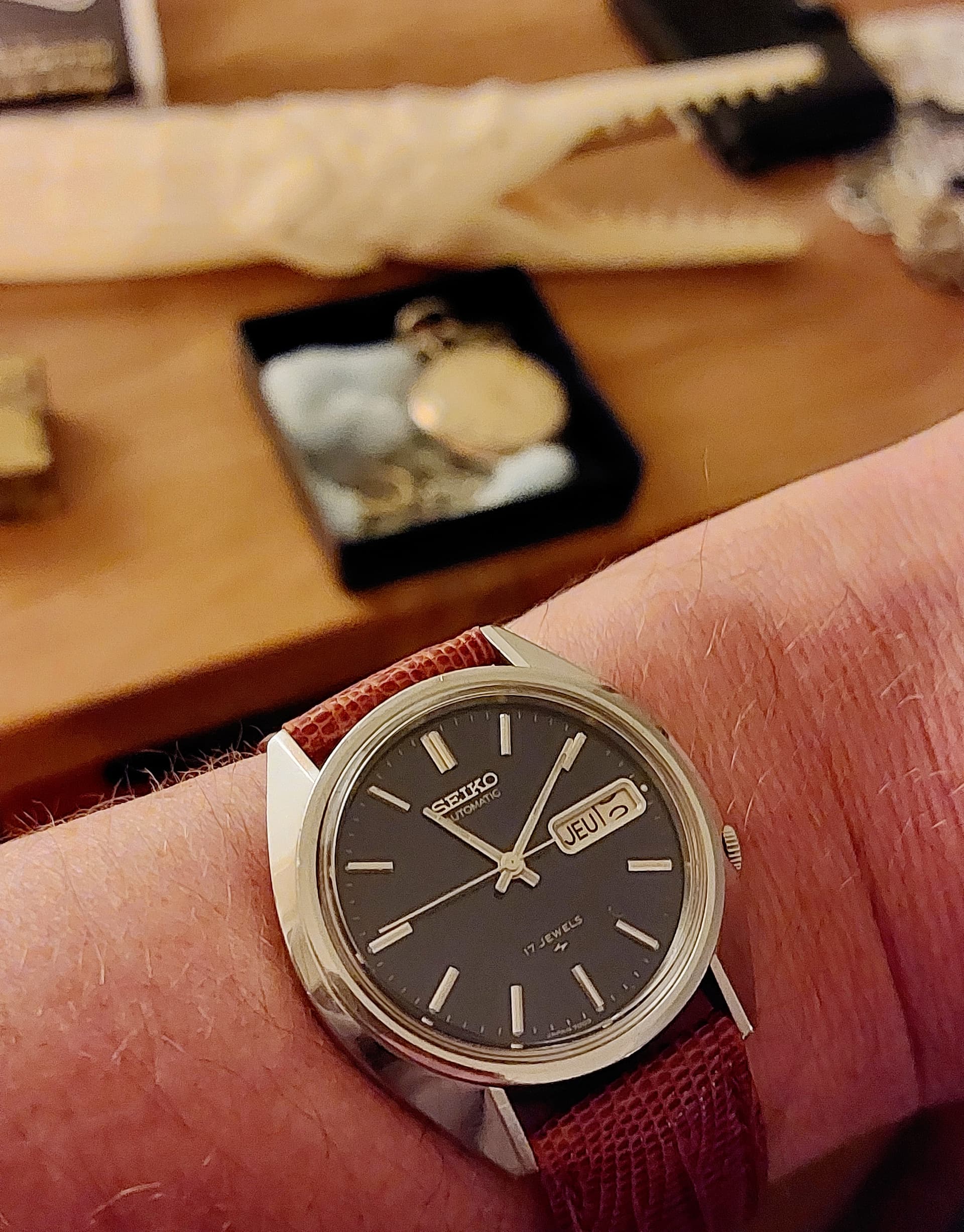Plakmerk, check, deukje in de wijzerplaat, check, stof onder het glas, check…maar op één of andere manier erg charmant (wat mij betreft).