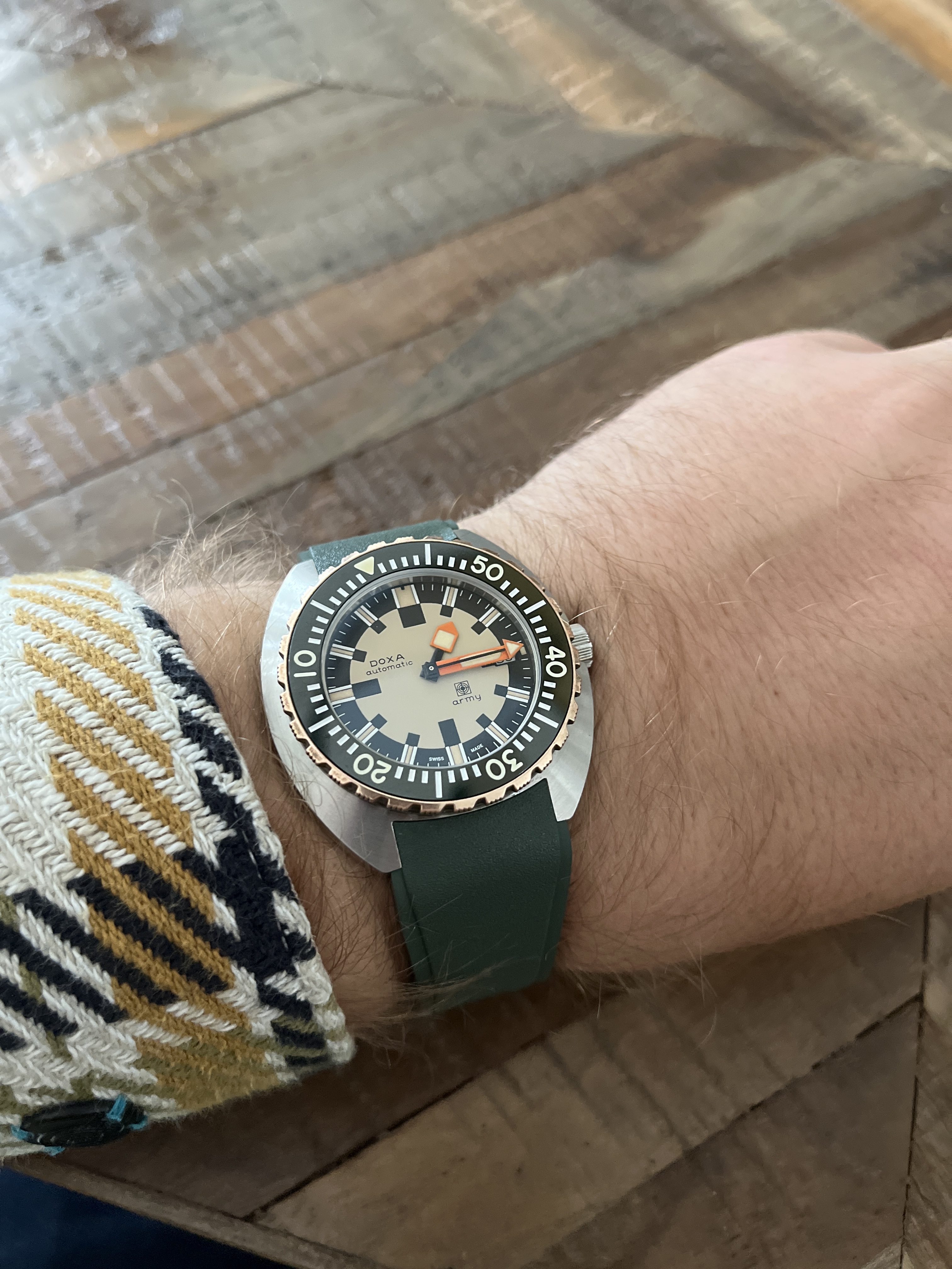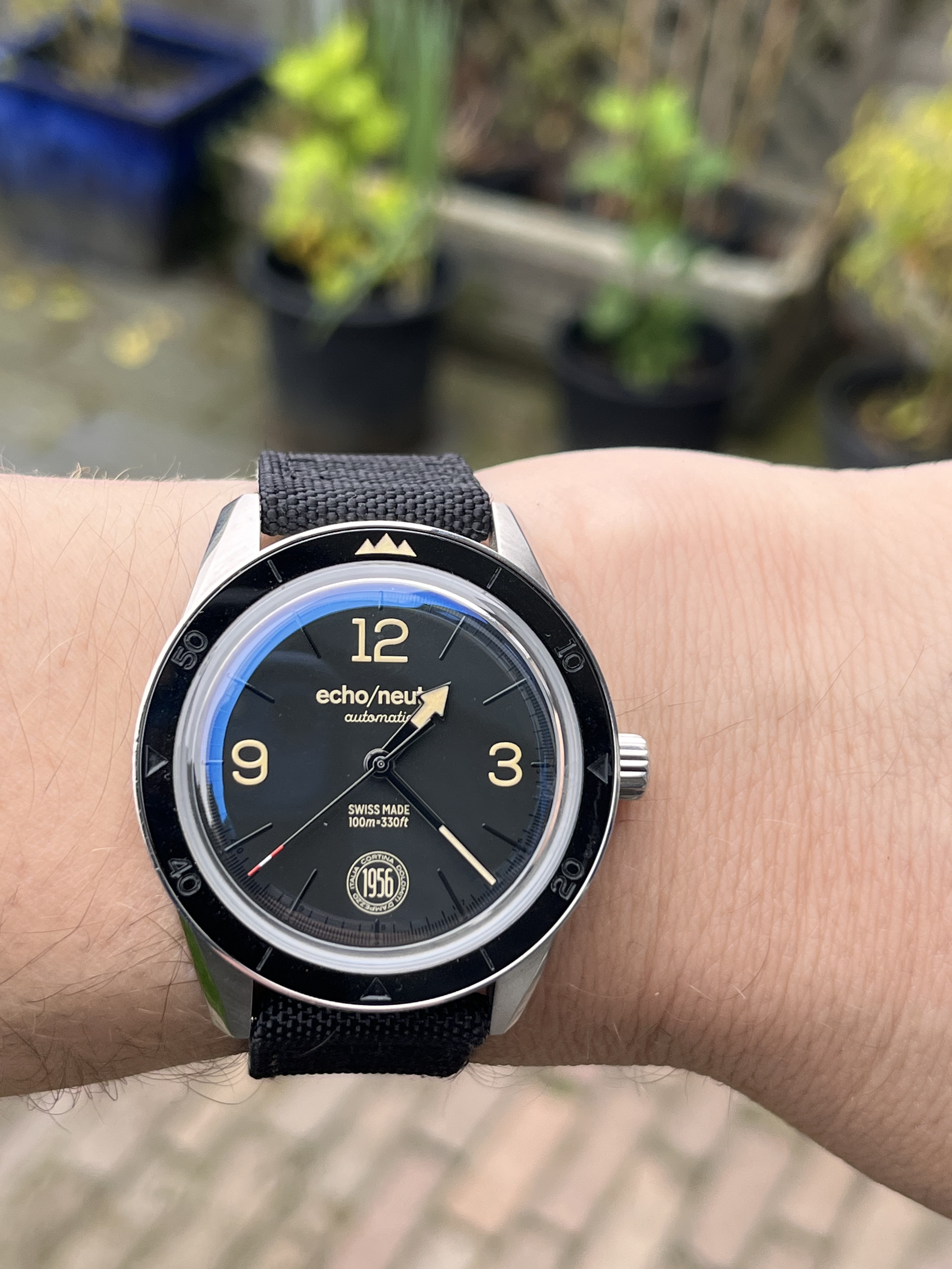 Doe zelden aan een wissel maar vanmorgen mijn andere horloge weggebracht voor een service. Dus nu deze mooie jongen om de pols, de Echo/Neutra 1956.