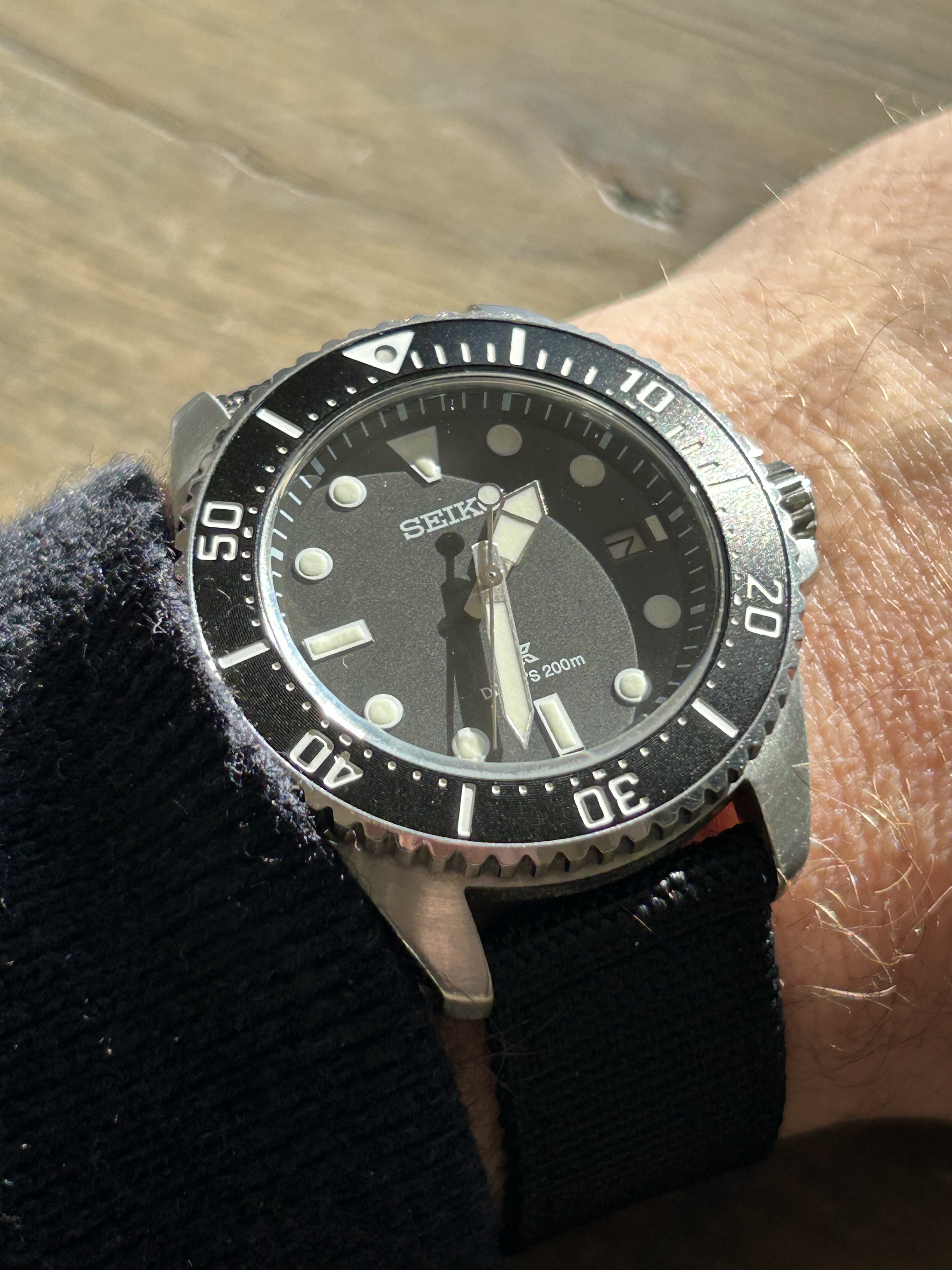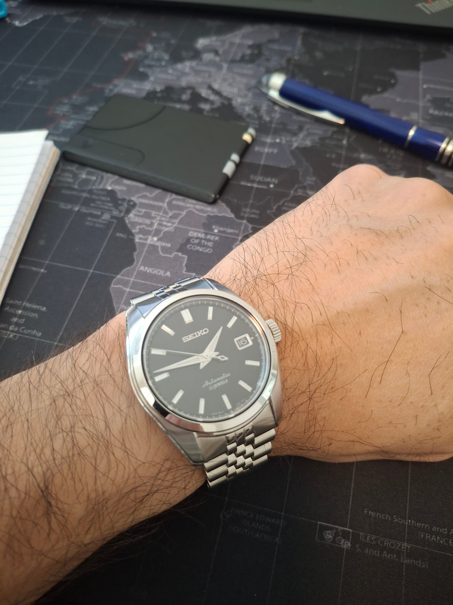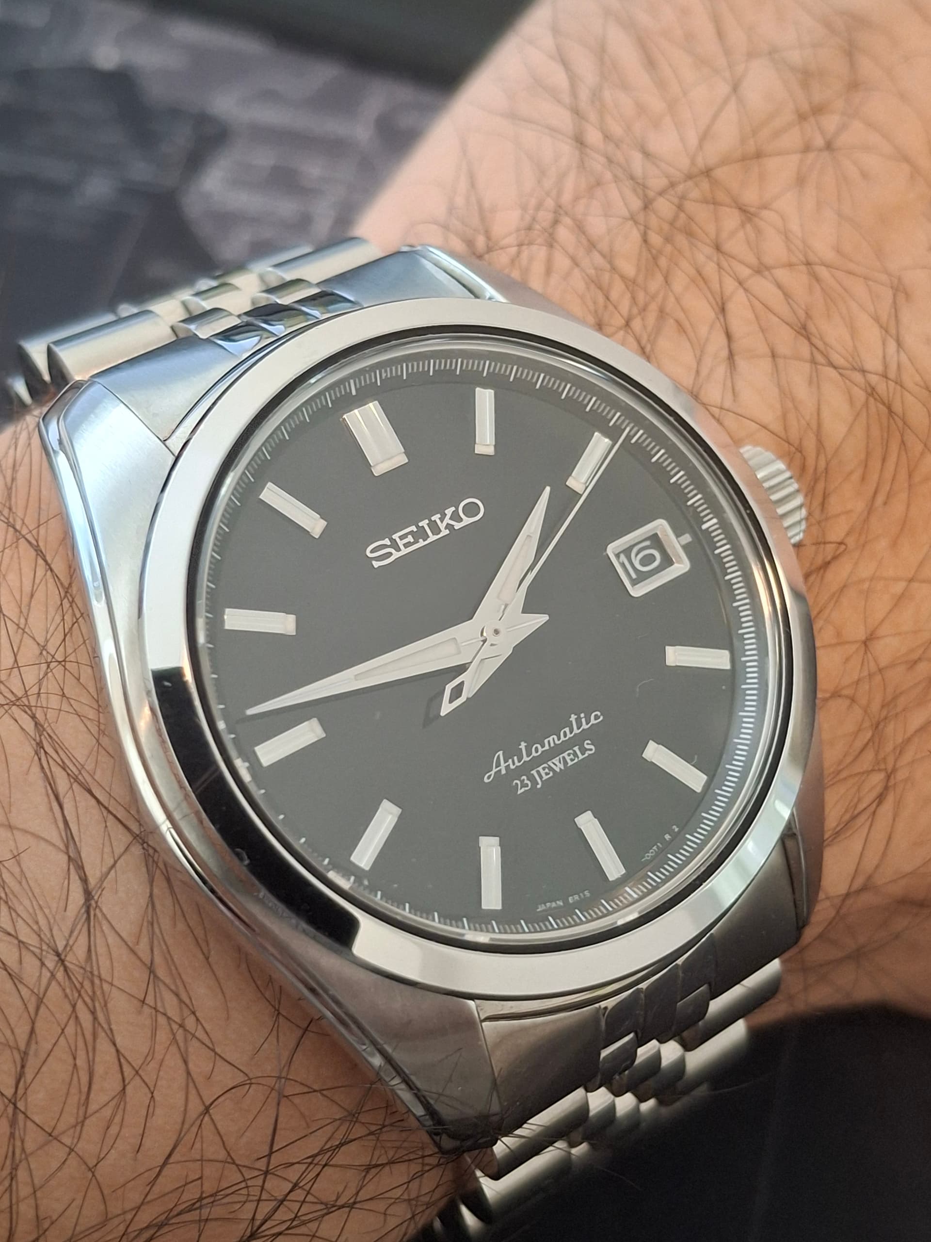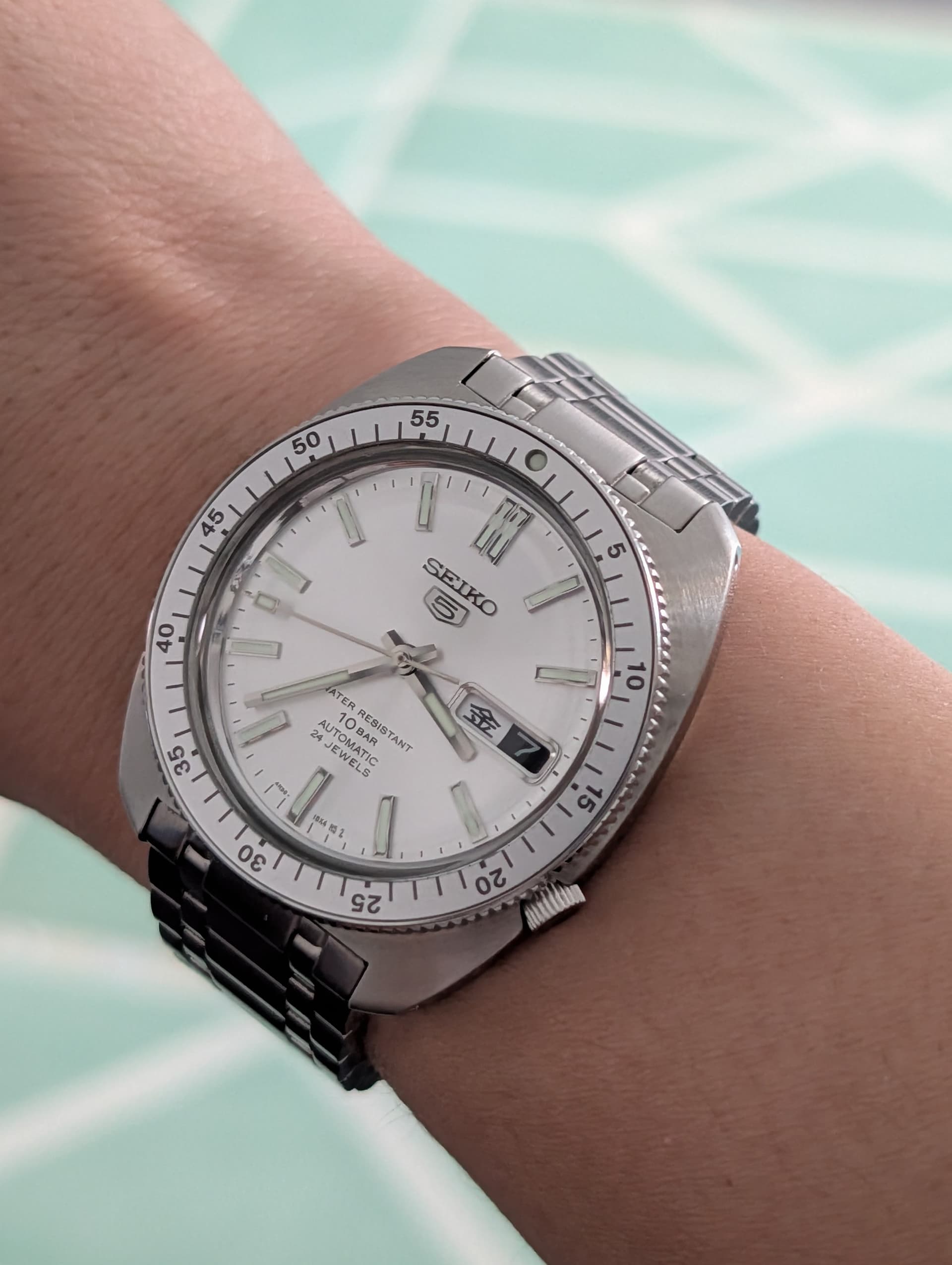 Een grab 'n go Seiko Quartz met een zalmkleurige, cleane wijzerplaat.