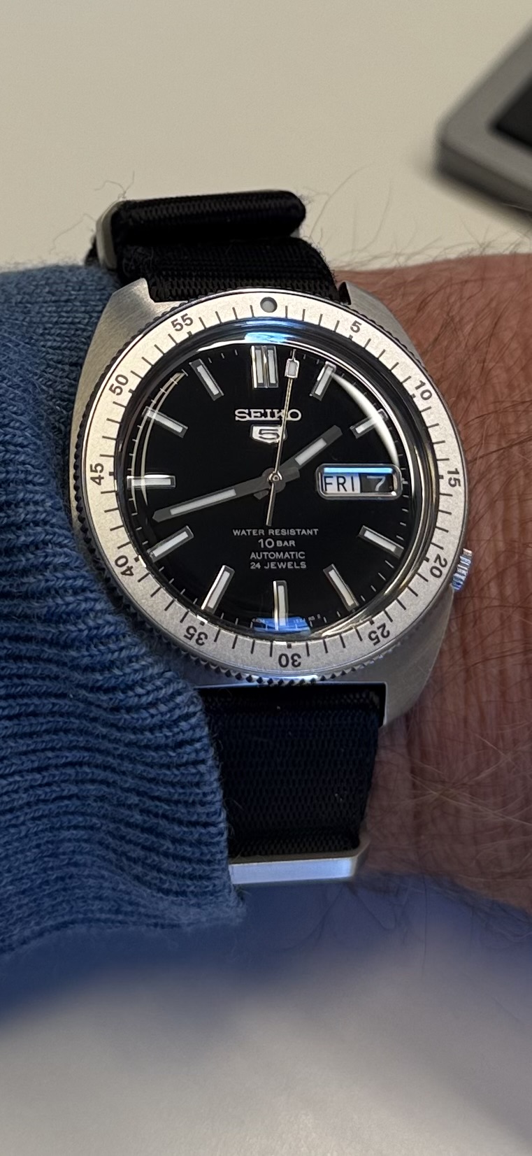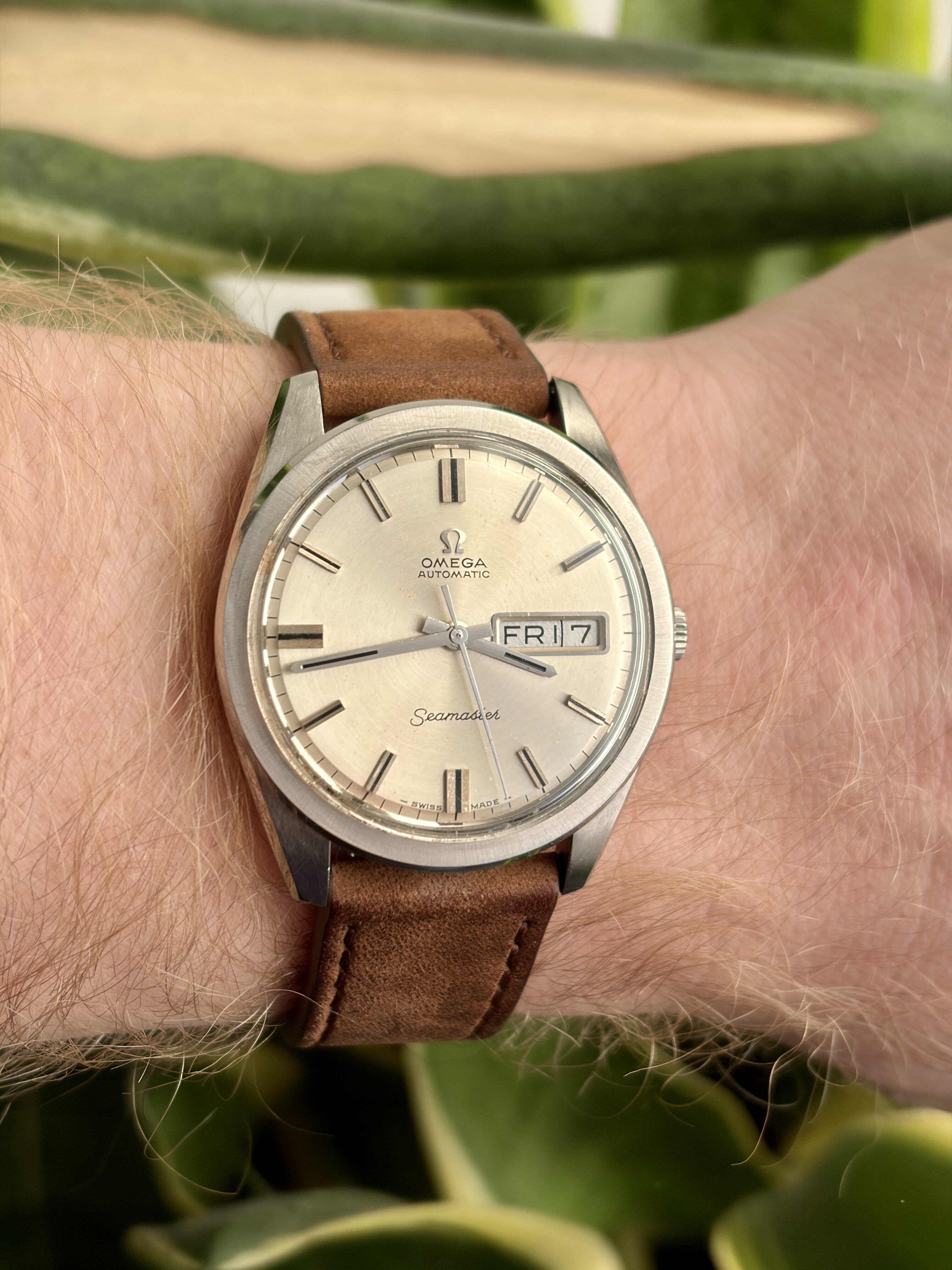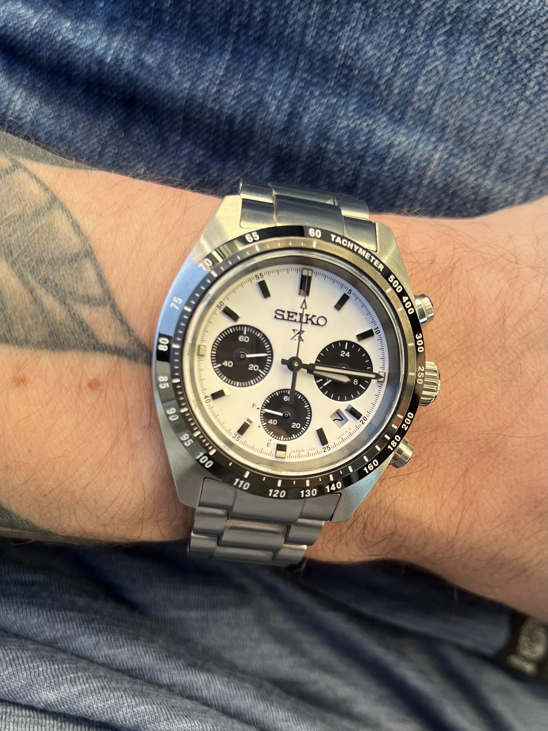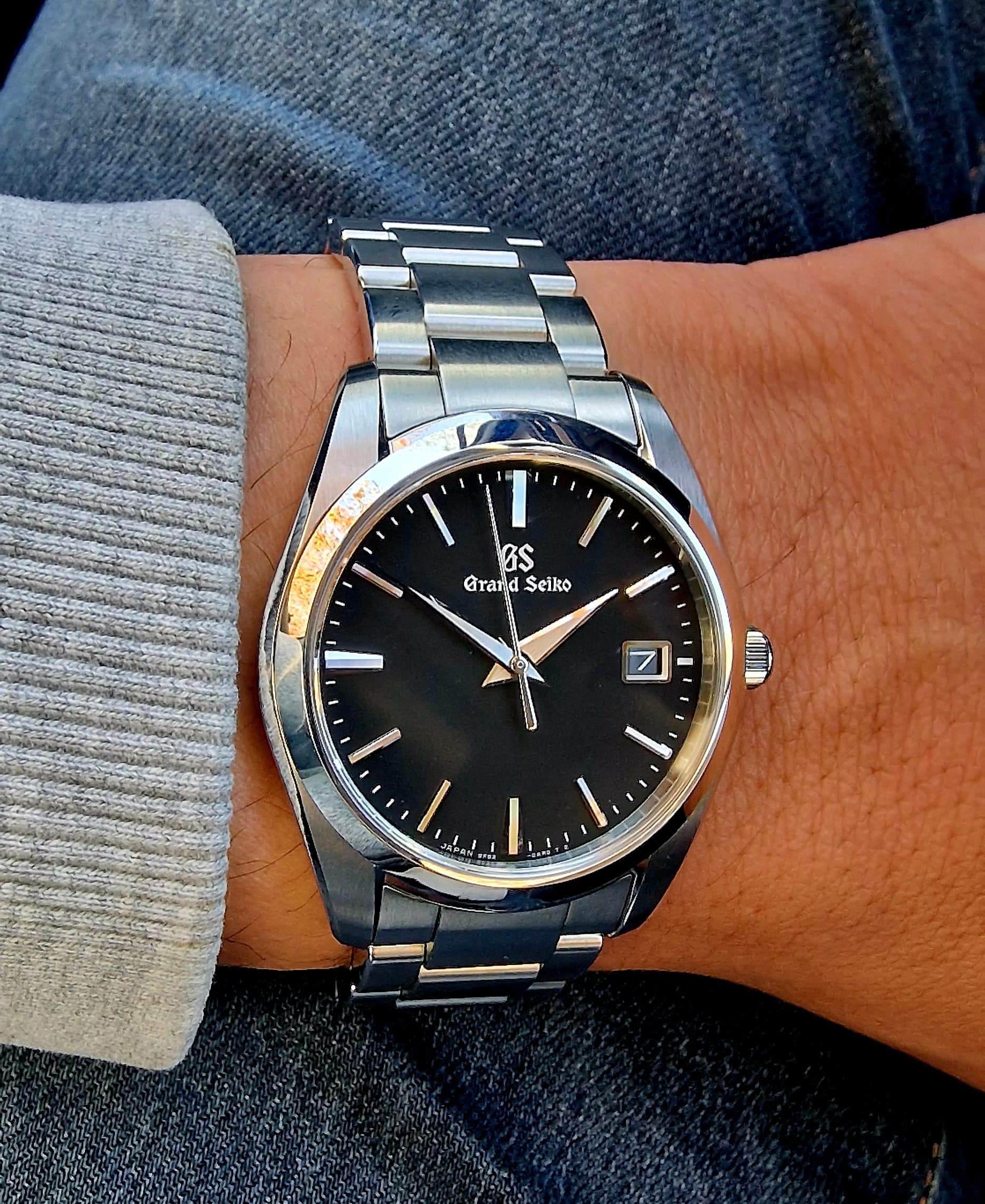 Een grab 'n go Seiko Quartz met een zalmkleurige, cleane wijzerplaat.
