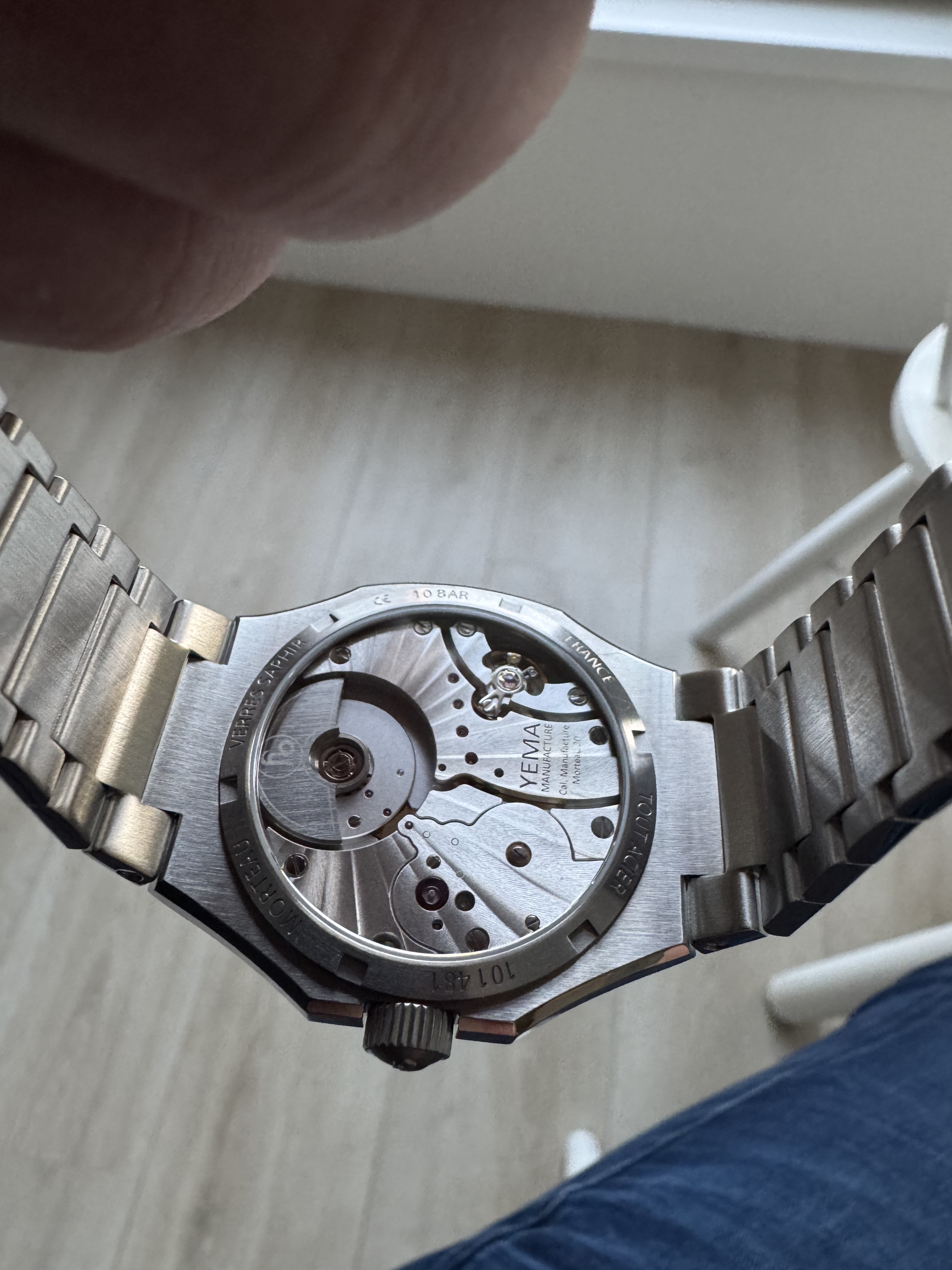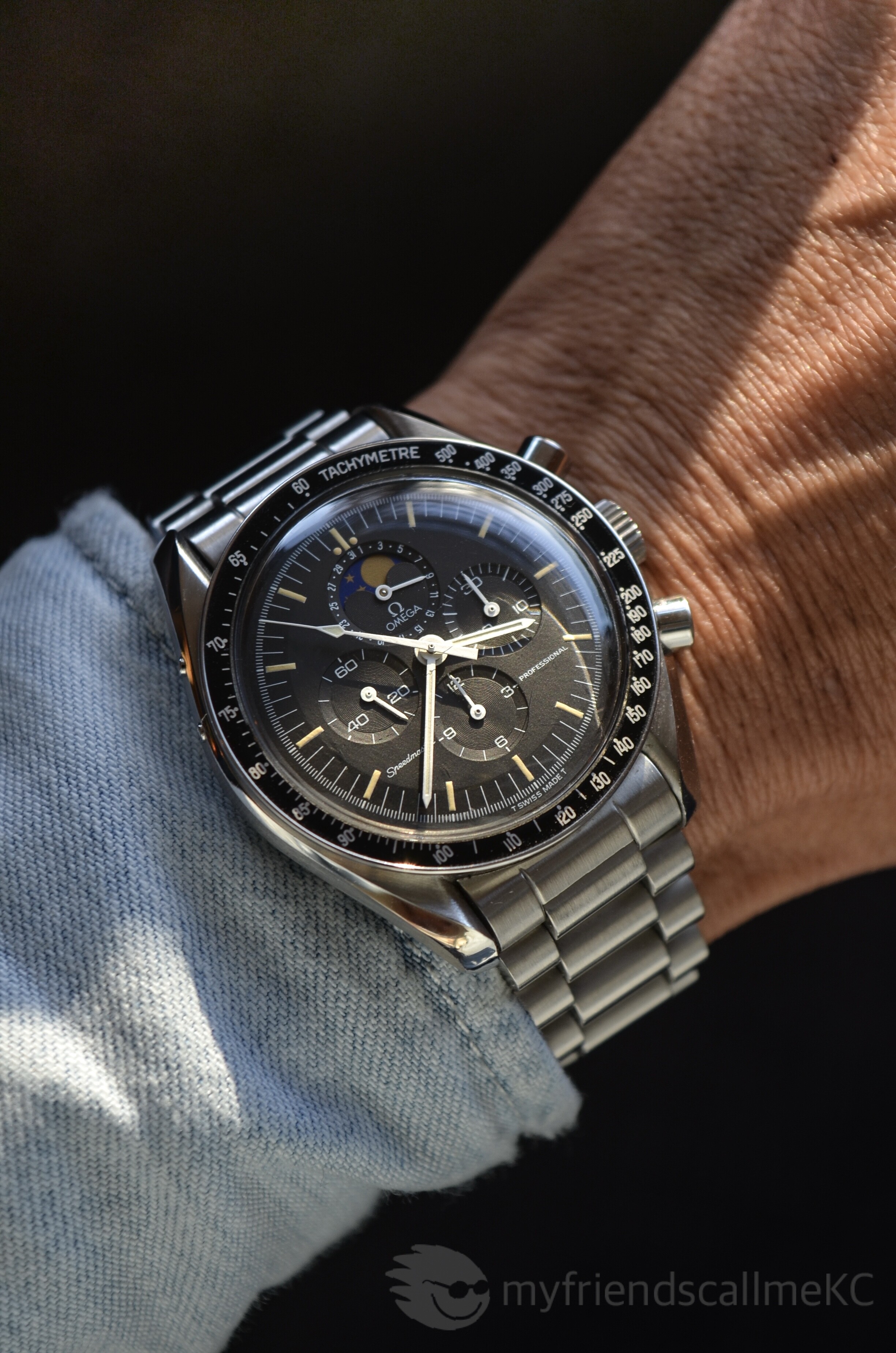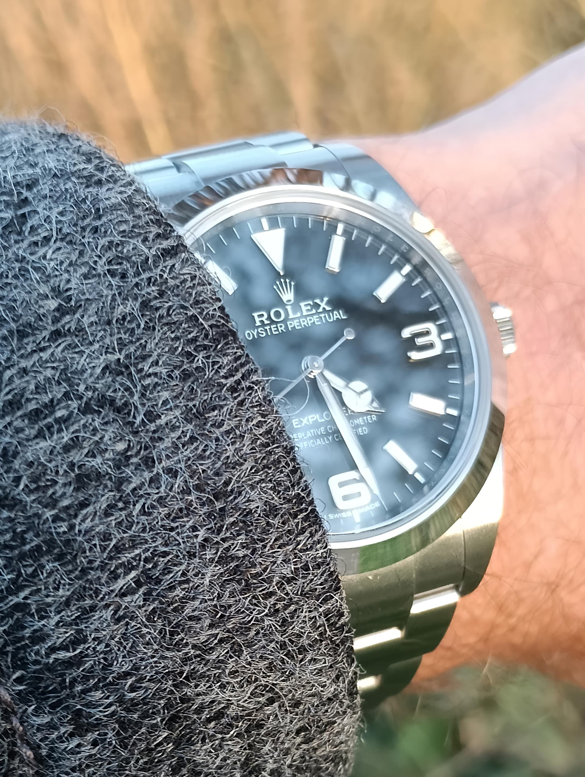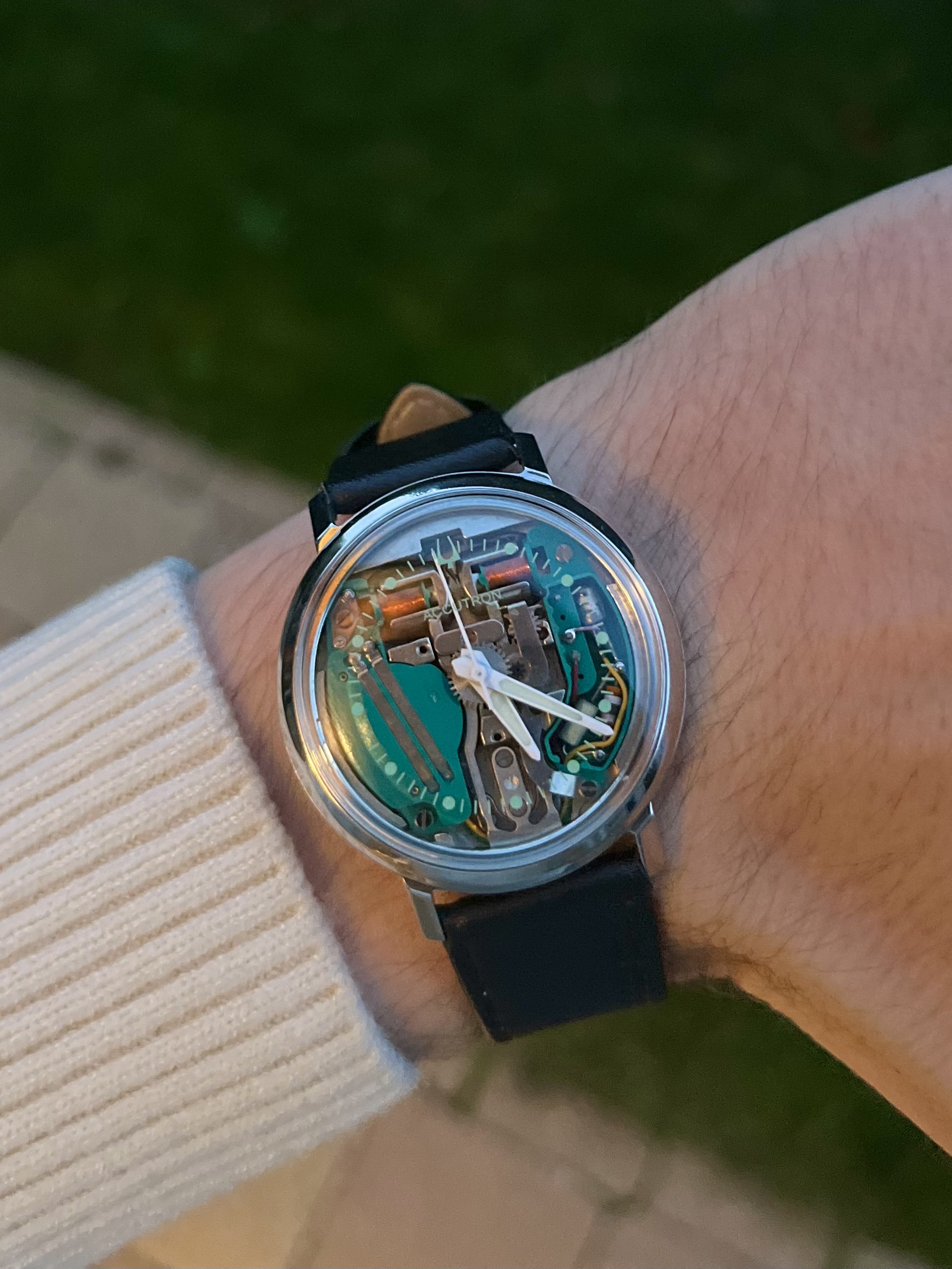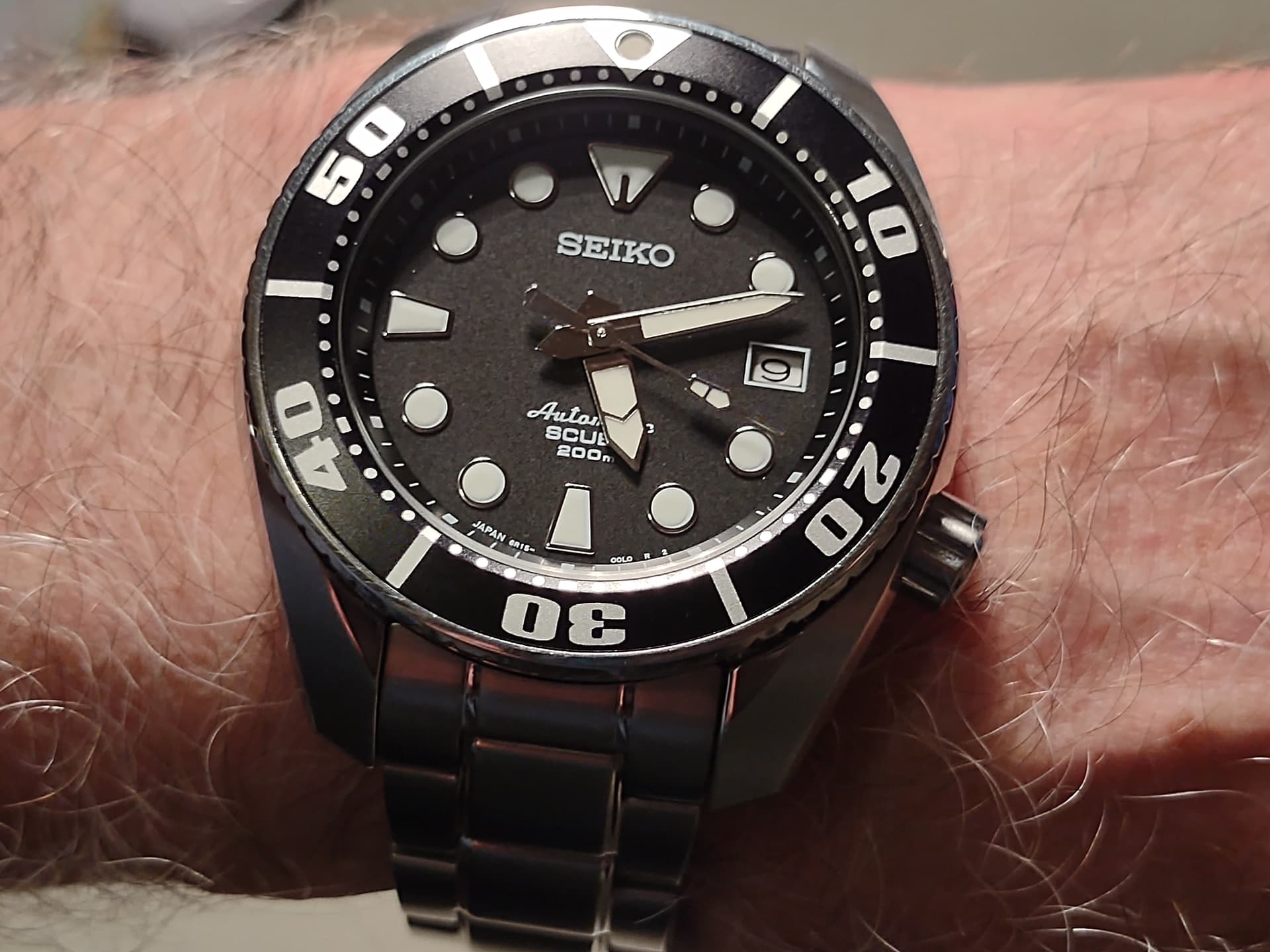 De lume is goed, het bezeltje is van aluminium en leeft dus gewoon mooi, de wijzerset is fijn en goed afleesbaar, en het is een heel erg standaard-standaard zwarte dial die zich voor elke band leent die je maar in de kast hebt liggen. Alles van tropics tot nato’s tot leer, en natuurlijk de OG bracelet die er bij zat, kan allemaal.