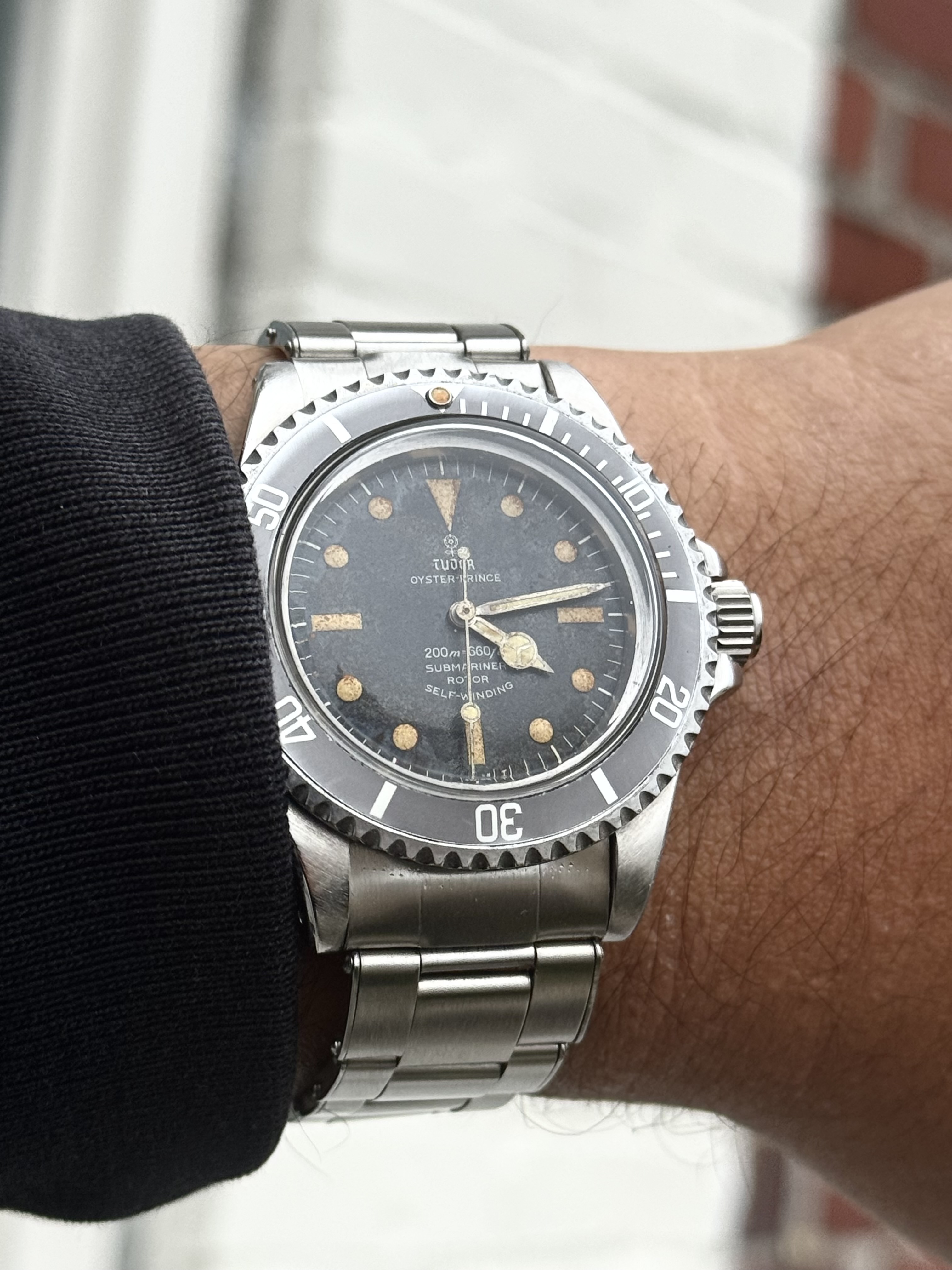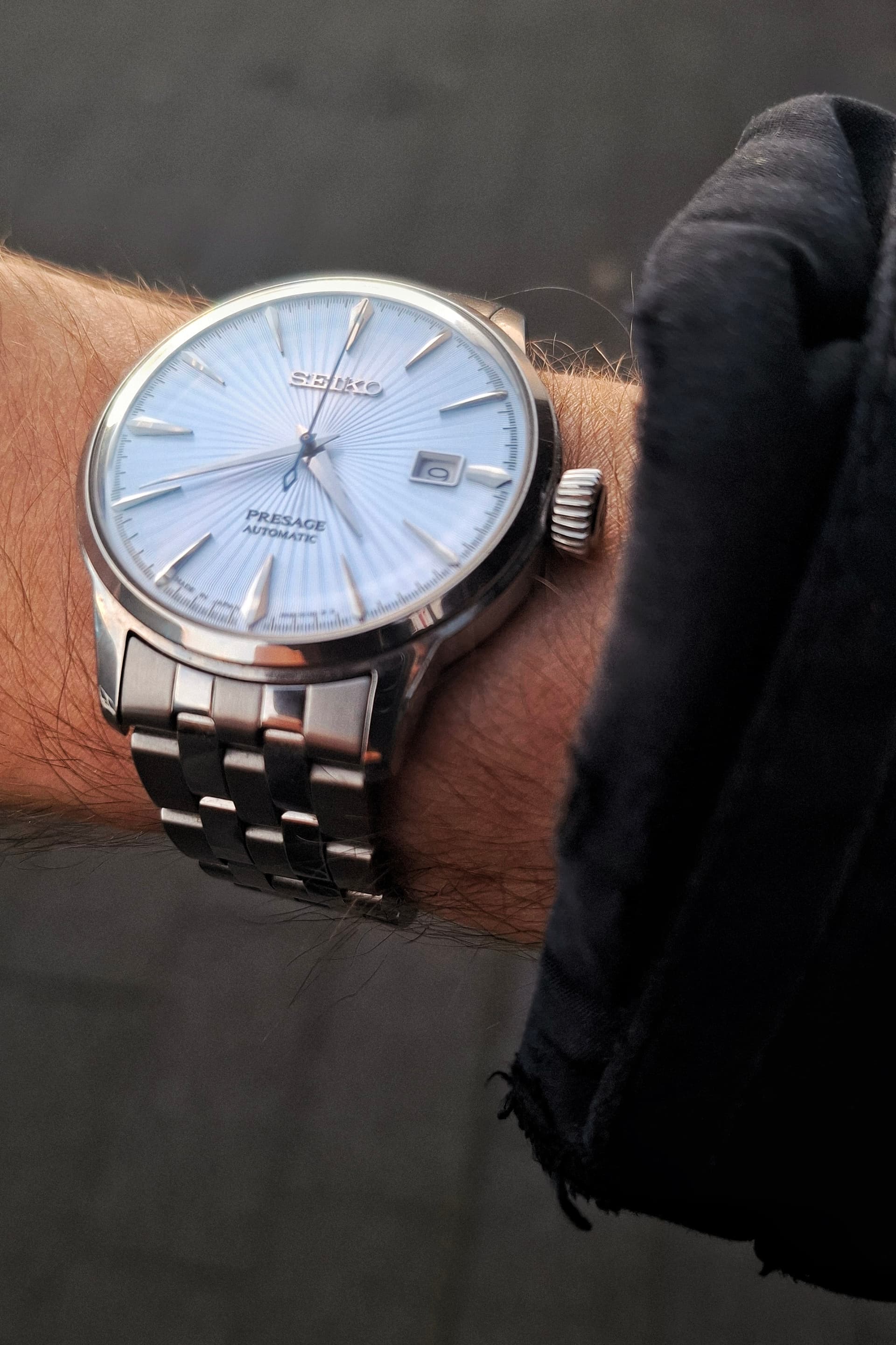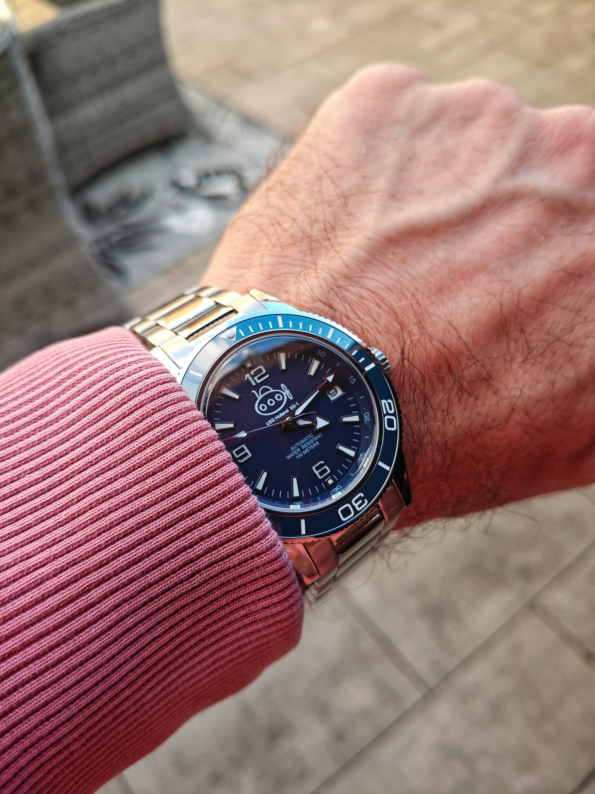Hij is klein. 39x12,5mm is een prima maat voor een duikhorloge. Daar komt bij dat hij komvormig is, en fijn op de pols ligt. Dankzij de lange lugs is hij toch best aanwezig, en aangezien het een soort vintage ontwerp is met bol glas schuift de mouw er makkelijk overheen.