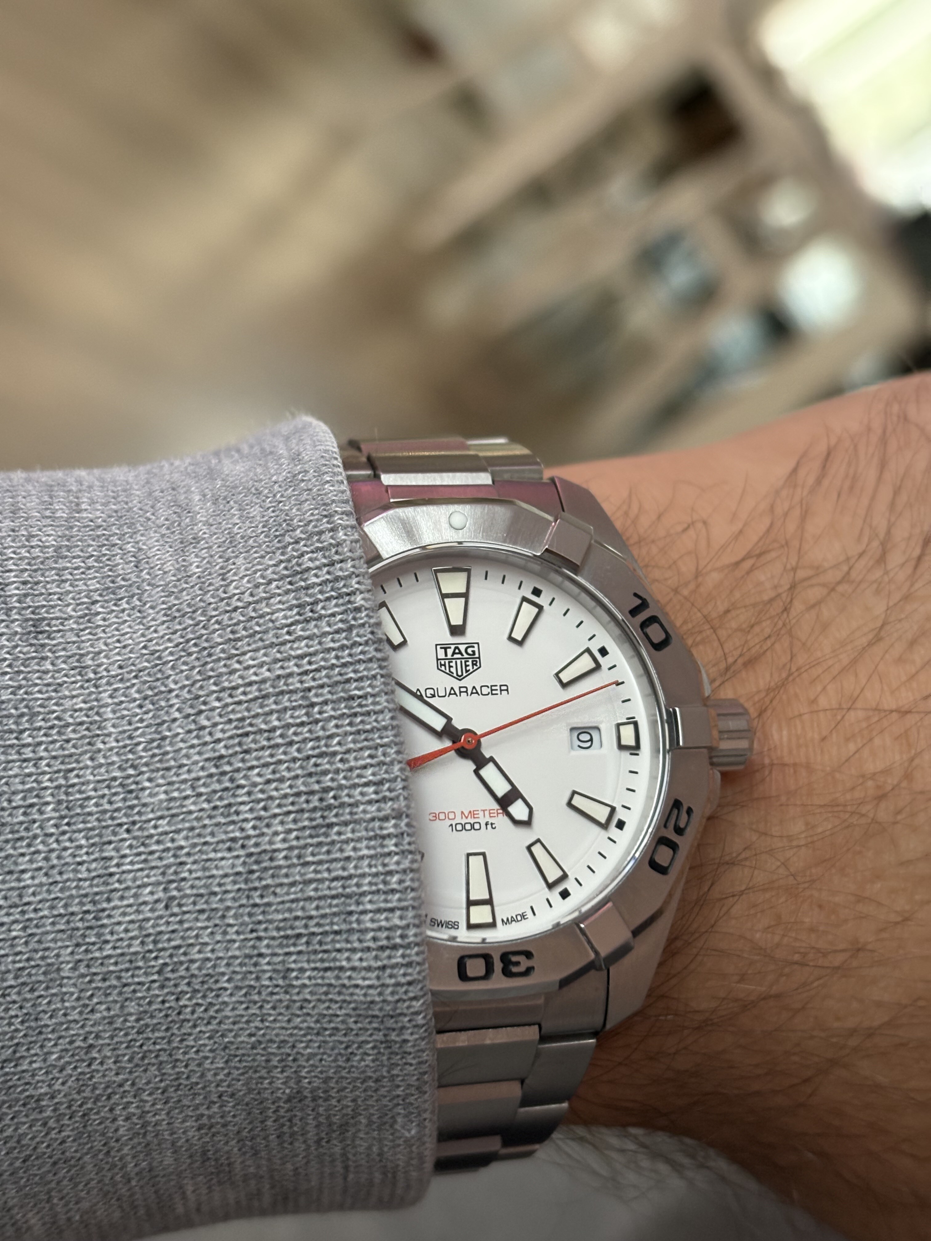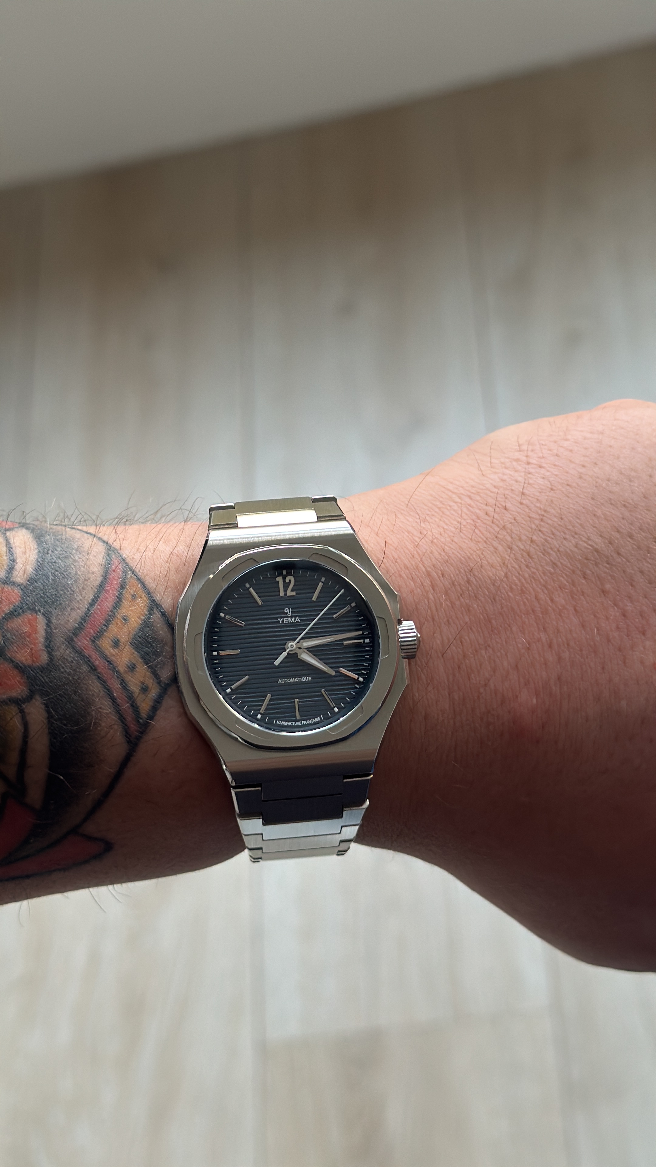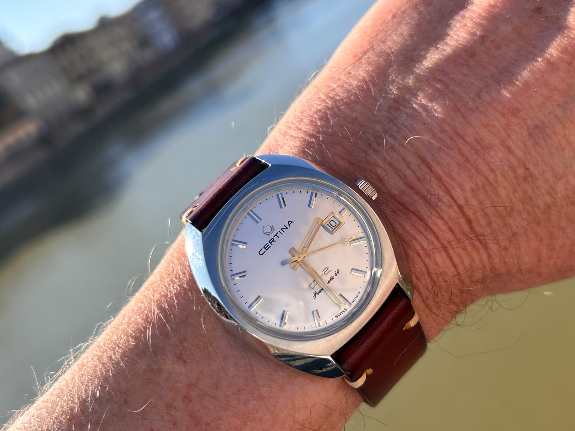 Hij is klein. 39x12,5mm is een prima maat voor een duikhorloge. Daar komt bij dat hij komvormig is, en fijn op de pols ligt. Dankzij de lange lugs is hij toch best aanwezig, en aangezien het een soort vintage ontwerp is met bol glas schuift de mouw er makkelijk overheen.