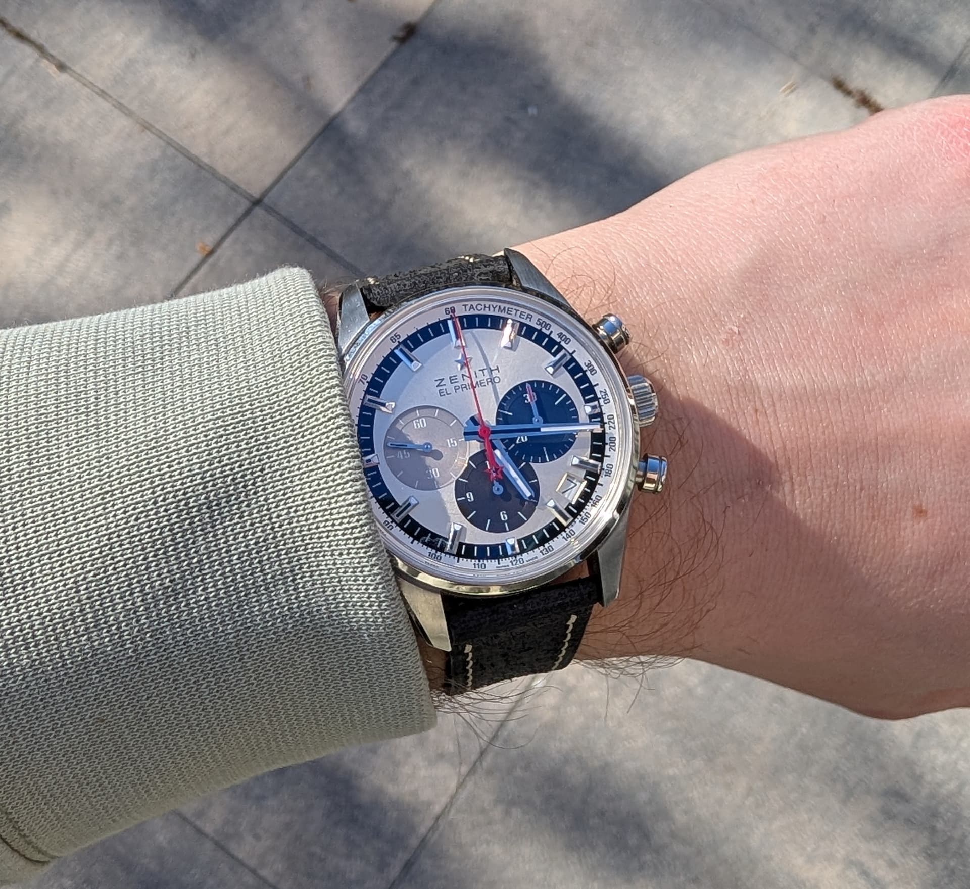 Dank u. Ik draag hem graag als er een beetje zon is. Dan is hij het fotogeniekst. En dat is wat we uiteindelijk willen he.