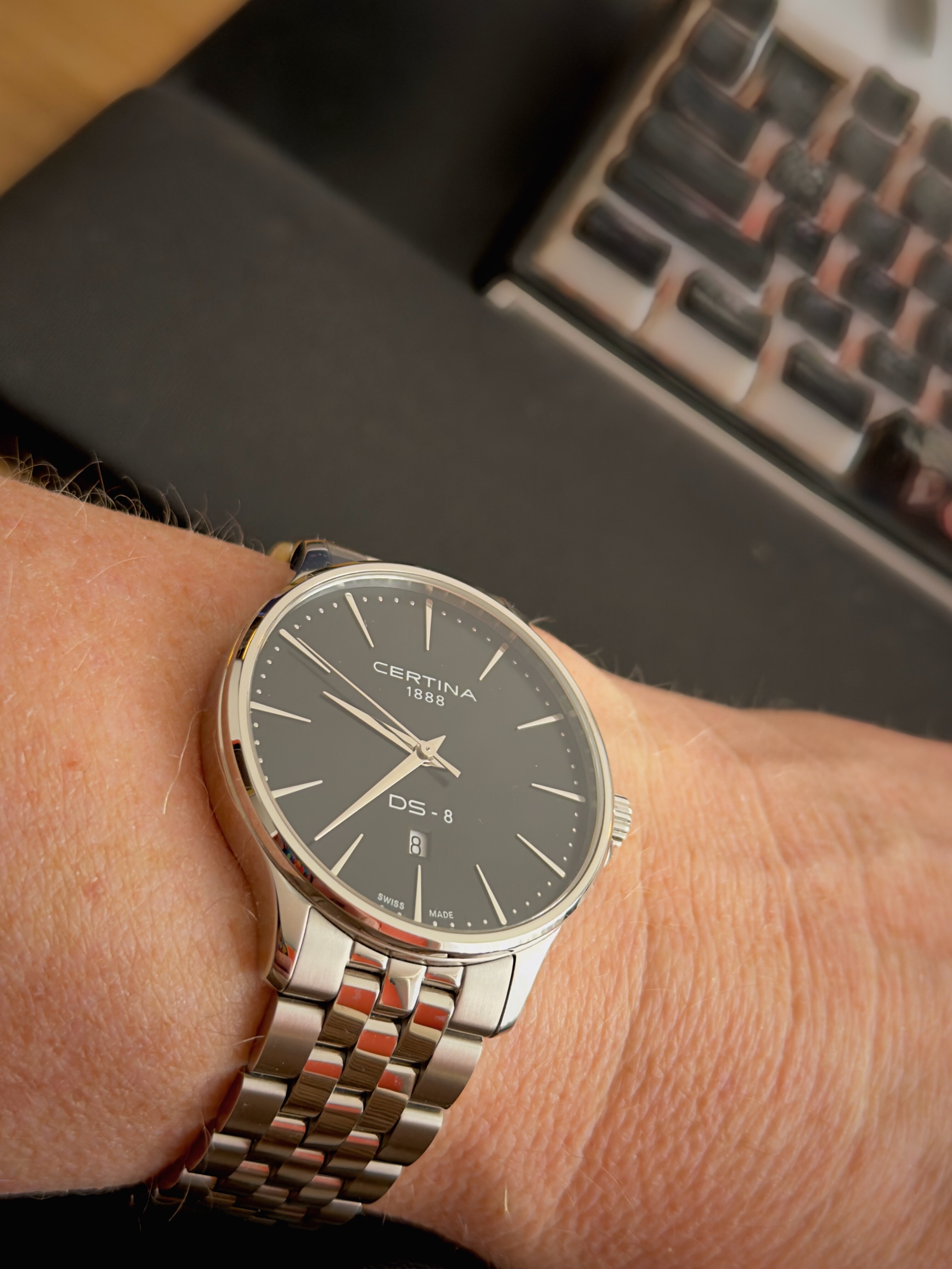 Certina met ETA Precidrive HAQ uurwerk. Niks bijzonders maar ik vind hem gewoon mooi en met 100m waterdichtheid ook nog dressy en praktisch tegelijk: