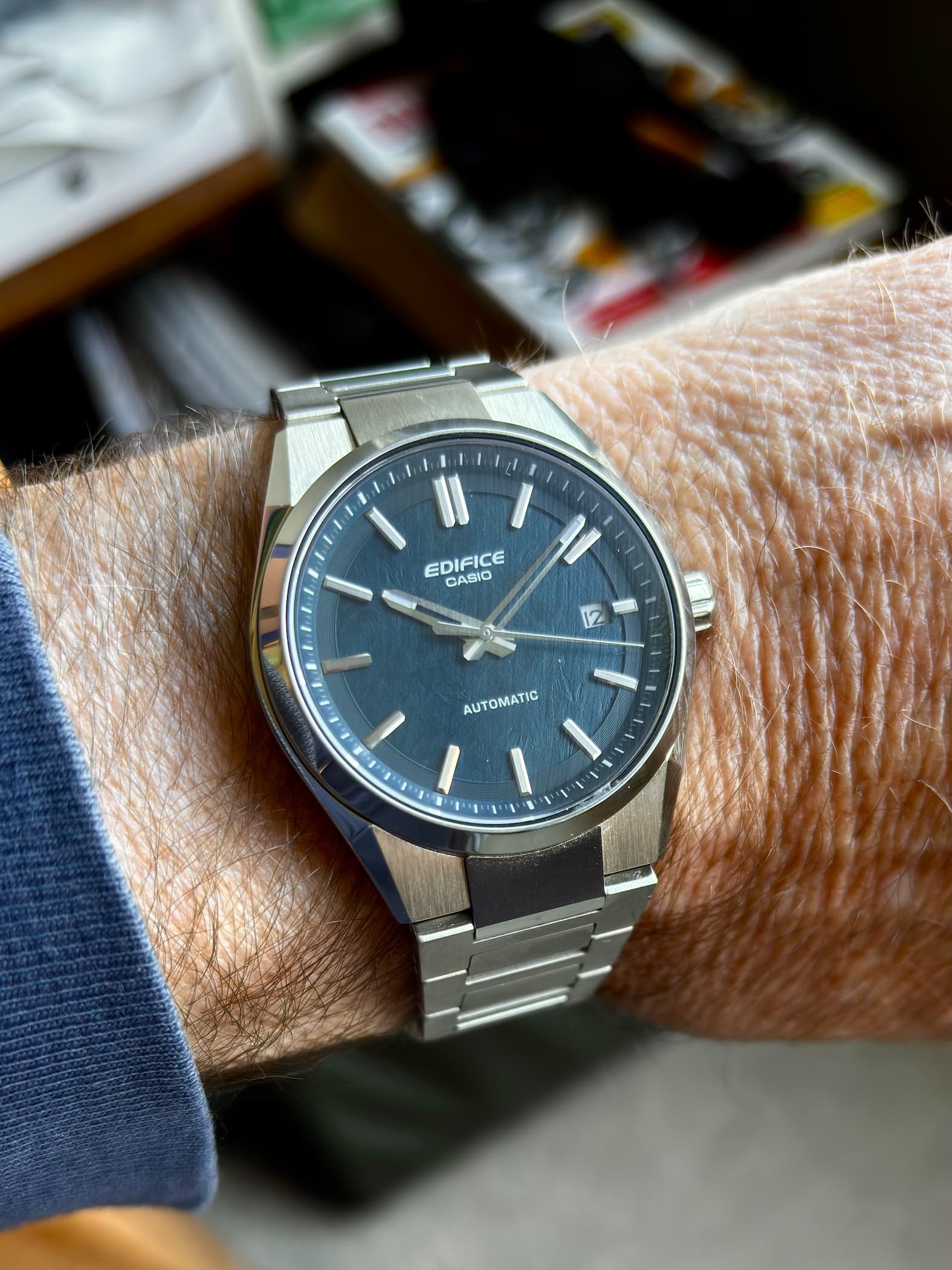 De nieuwe, nu 38 mm en met Miyota 8215, Casio Edifice EFK-110. Niet van mij, maar ik draag hem wel vandaag