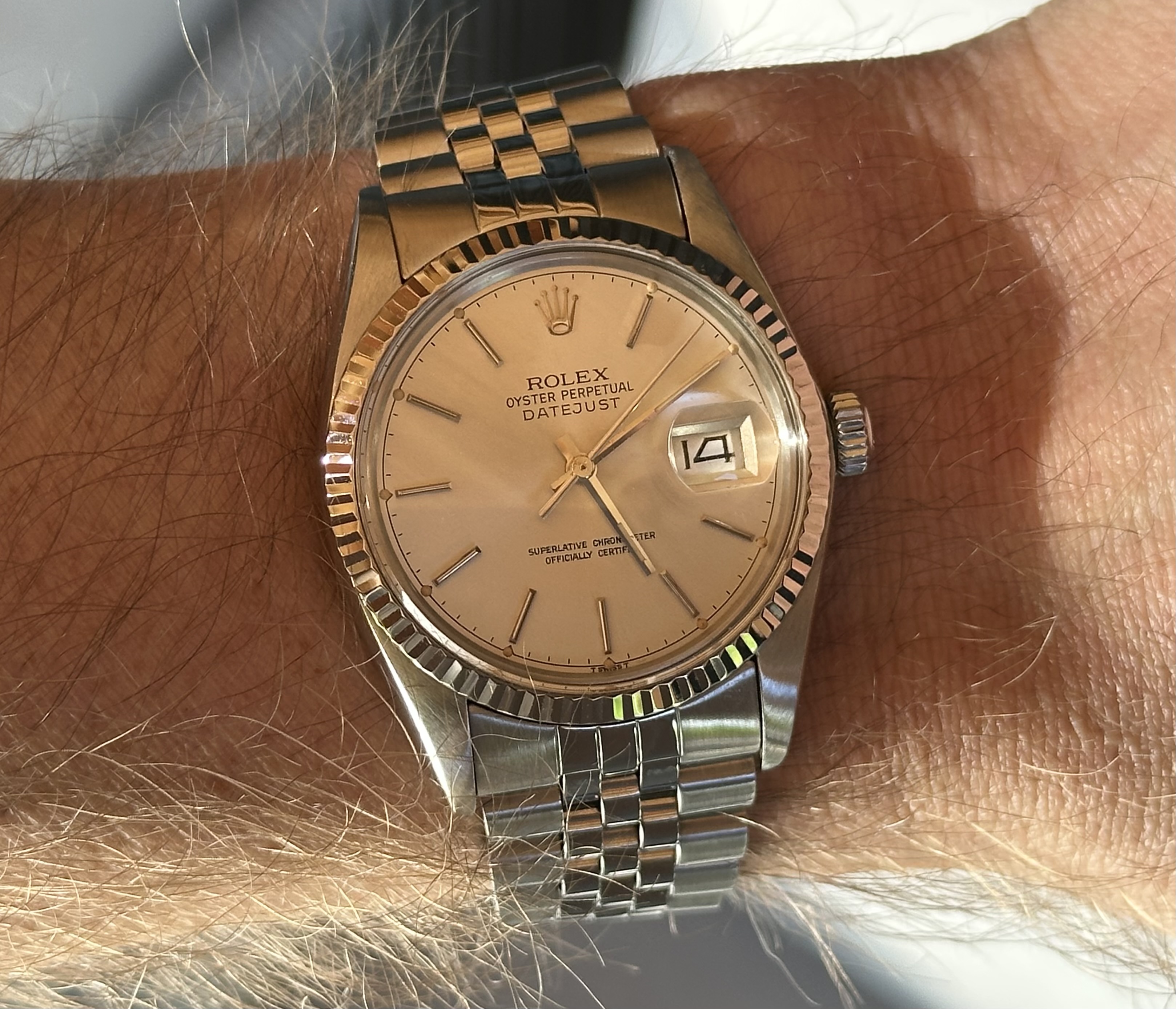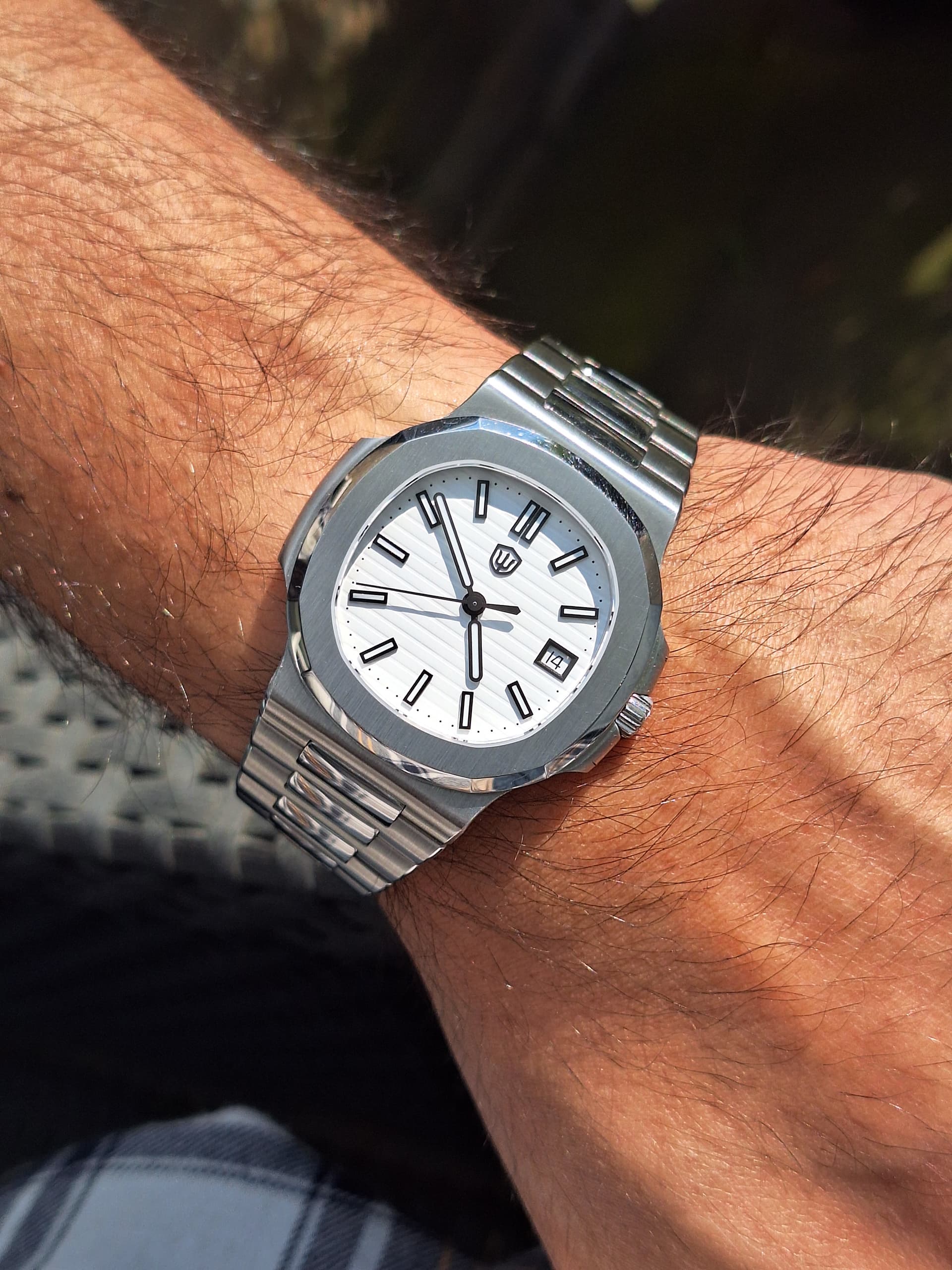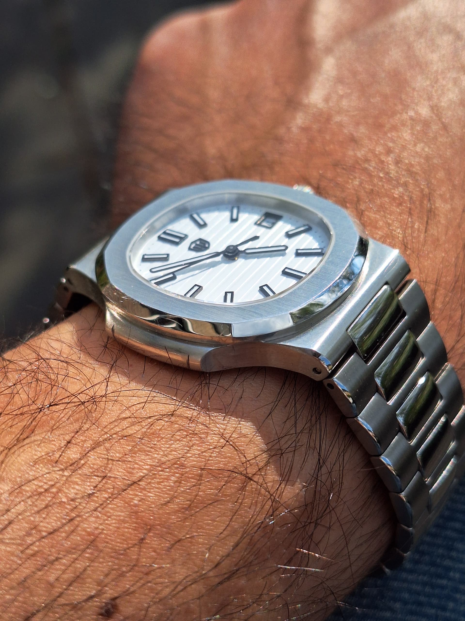 hij is ongeveer even breed als mijn pols (ik ben een grote vent maar mijn polsen zijn bescheiden…), maar door de “helmet”-achtige lugs en shroud valt dit normaal minder op. De foto is recht van boven, daar zie je het idd heel erg. Maar dat vind ik wel cool ![]()
