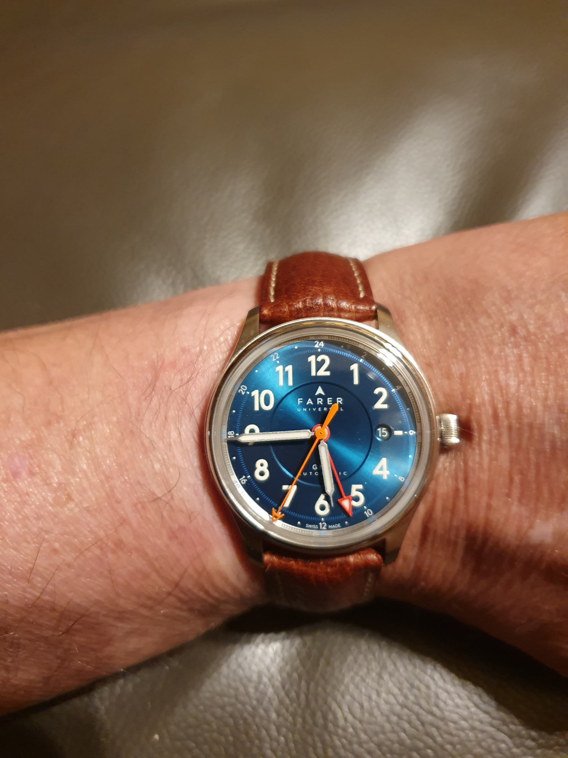 vandaag mijn Farer Lander IV om de pols en speciaal voor @Fate_Amenable_To_Change (Chris), deze is 39,5mm maar oogt 38mm. Ik zeg dit nav wat je zei over de Amabassador van @Brunmontagne. Zo zie je maar het ene horloge is niet hetzelfde als het andere horloge