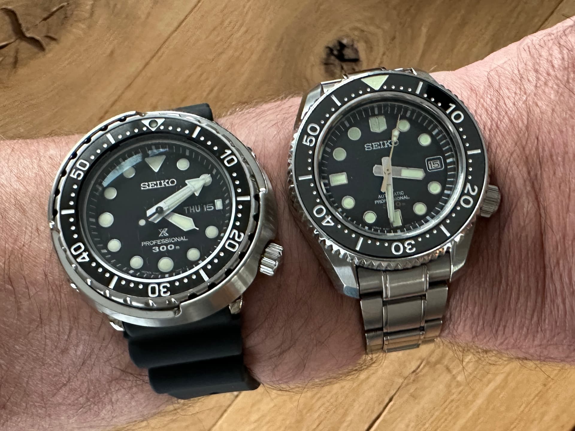 Vandaag MM300 tijd. Twee van mijn drie MM300’s om de pols. de SLA021 (1968) om de linker, de SBBN045 (Tuna) om de rechter. Gewoon, omdat het kan en omdat MarineMasters simpelweg gewoon übergeil zijn.