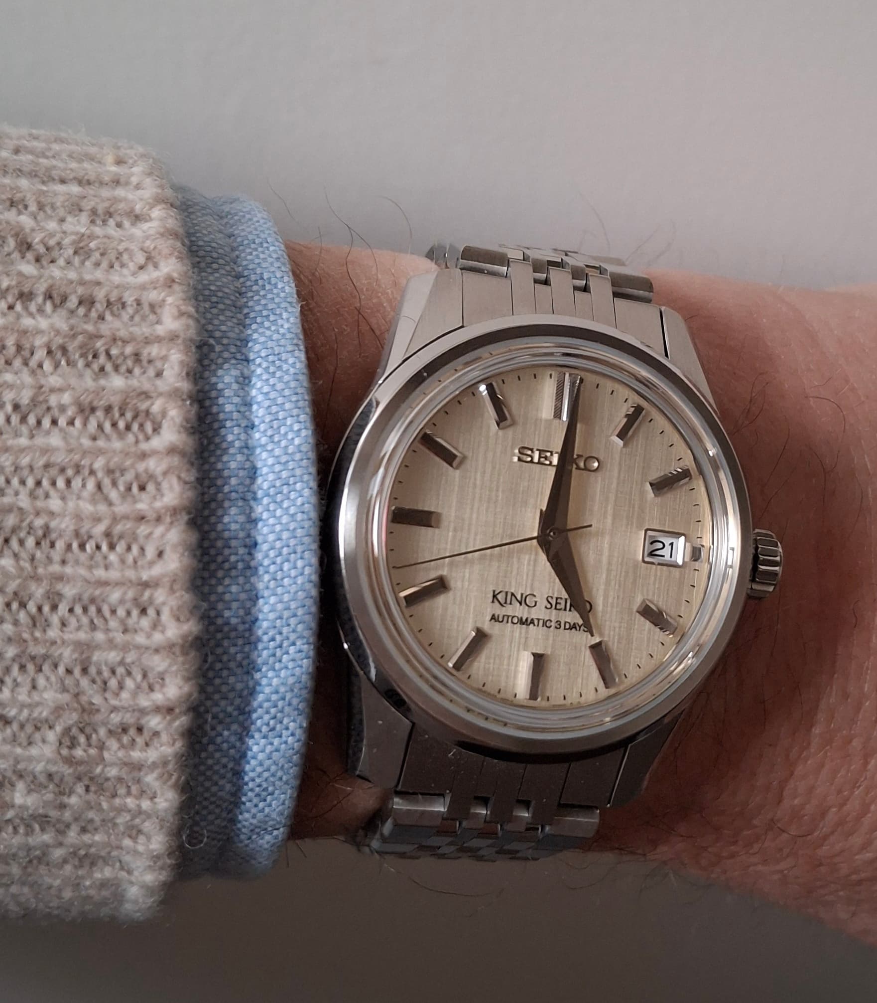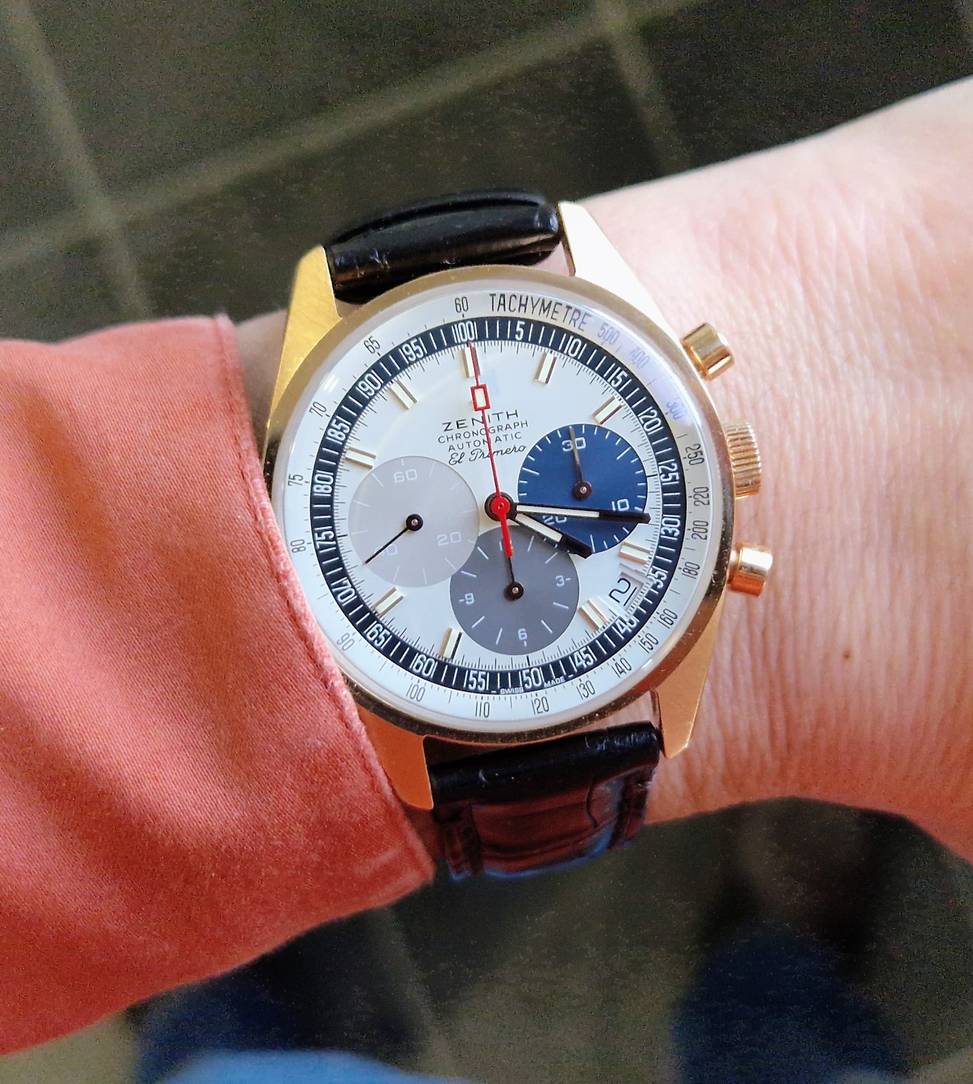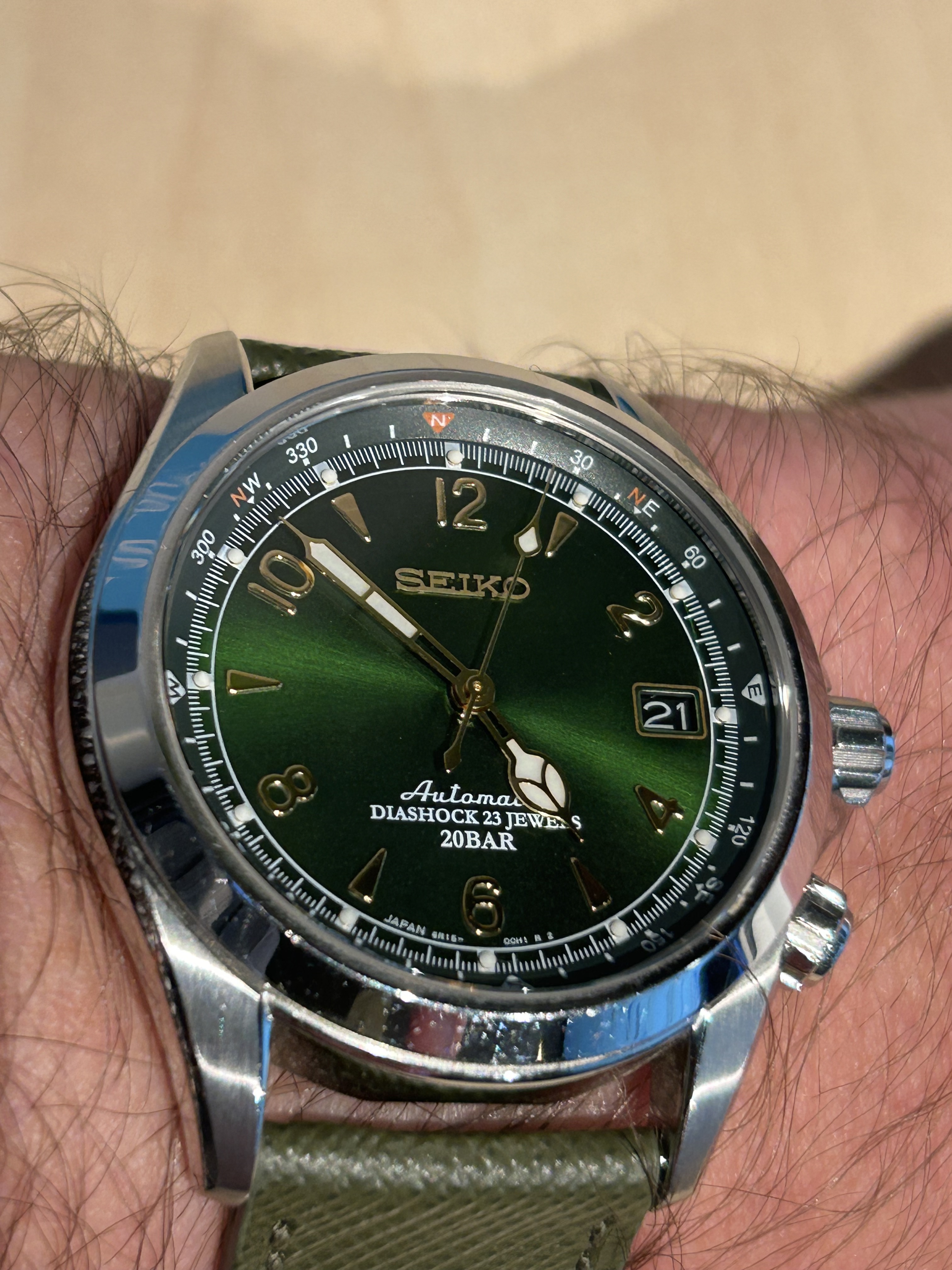 Good old Alpinist om de pols. Enige horloge met groene wijzerplaat en enige horloge met goudkleurige wijzers en indices, want goudkleurig en groen ben ik eigenlijk niet van….