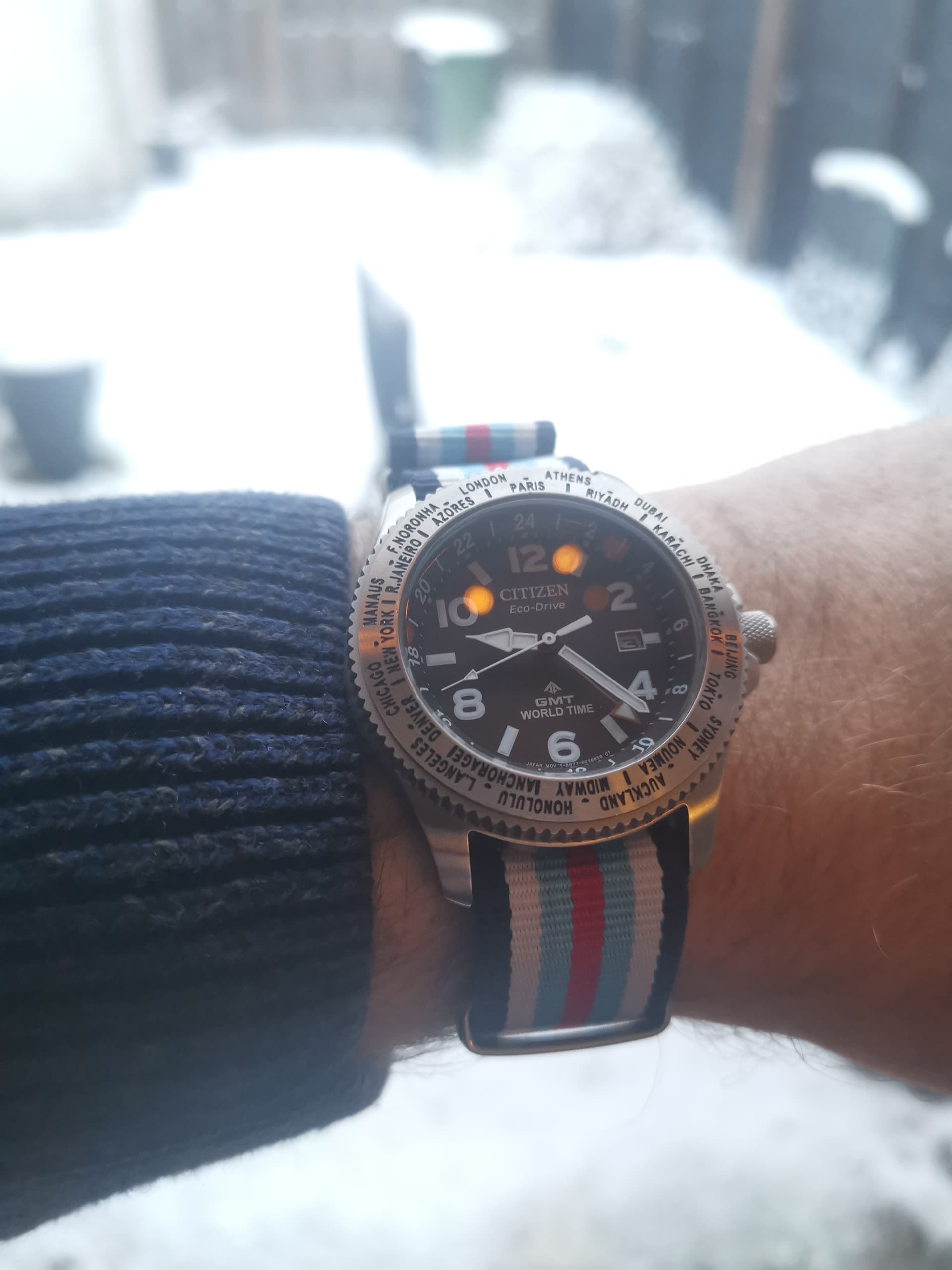 Citizen GMT World Time vandaag, op een Martini Racing nato.