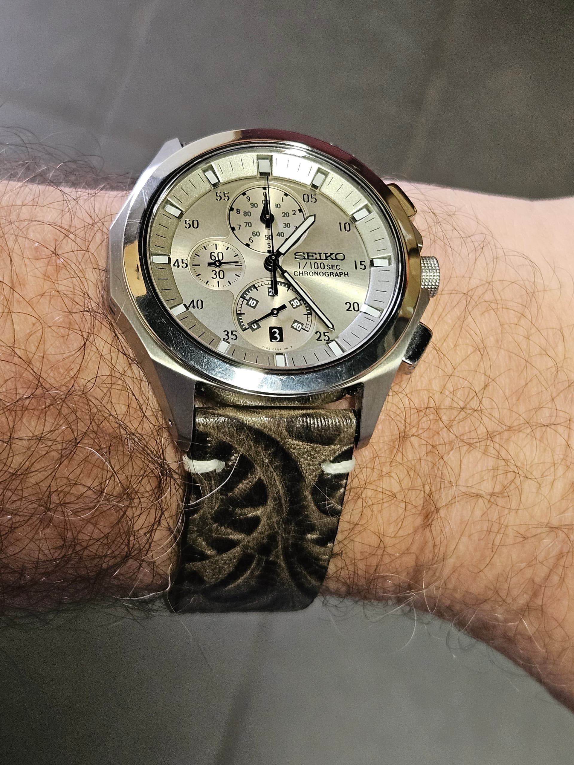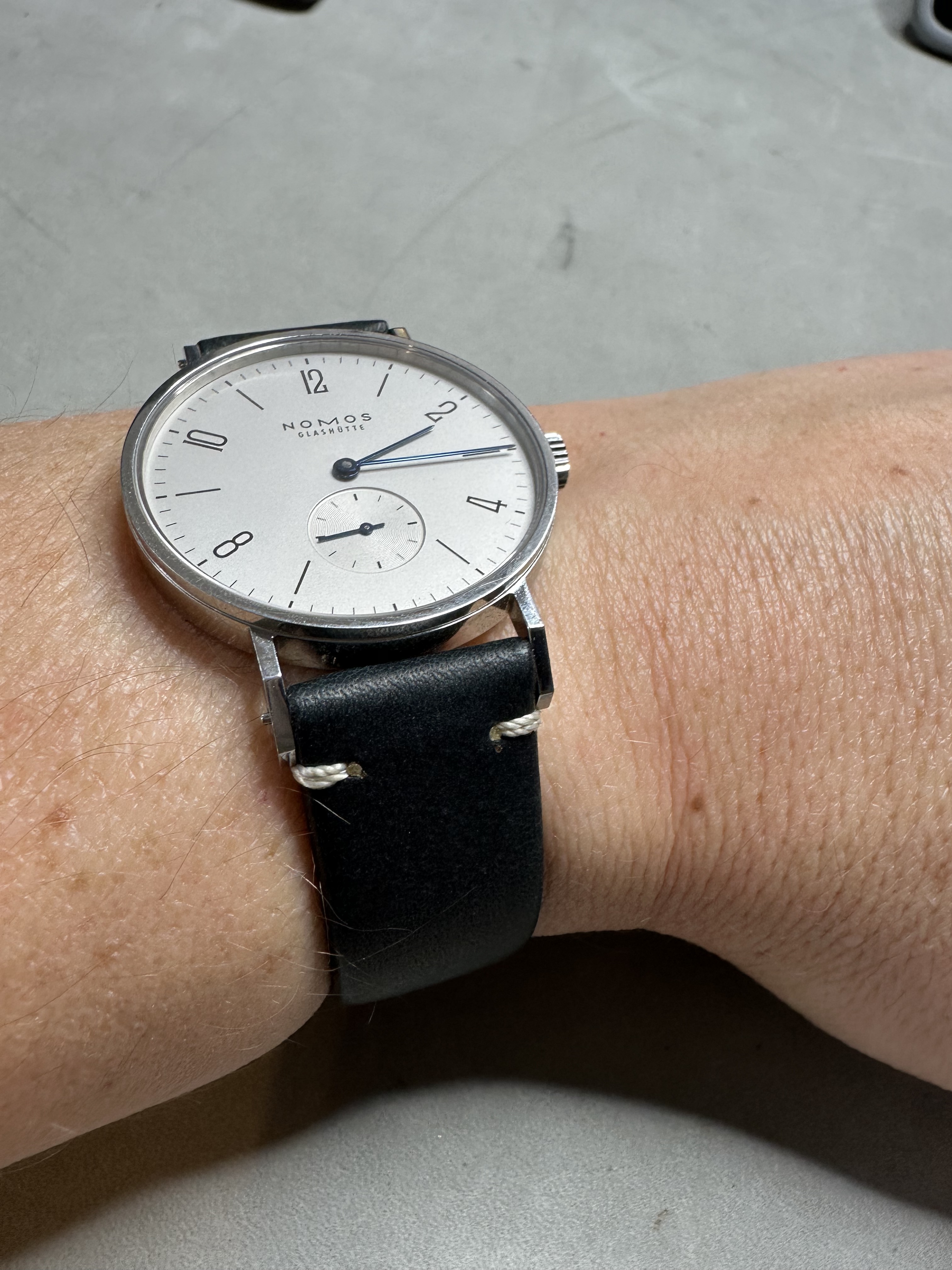 Zo, het werd tijd het versleten bandje waarmee ik het kocht, te vervangen! En nu wellicht het glas nog.