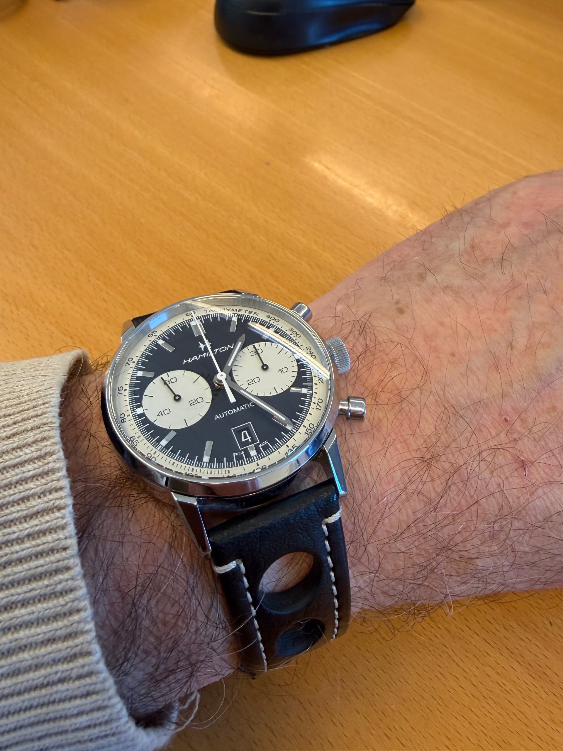 Heb al aardig wat Chrono’s gehad (meestal 3-register), maar nu een ‘klassieke’ Panda (weliswaar inverse, maar toch). Wat ik heel tof vind aan deze is dat de twee subdials relatief groot zijn tov de gehele dial.