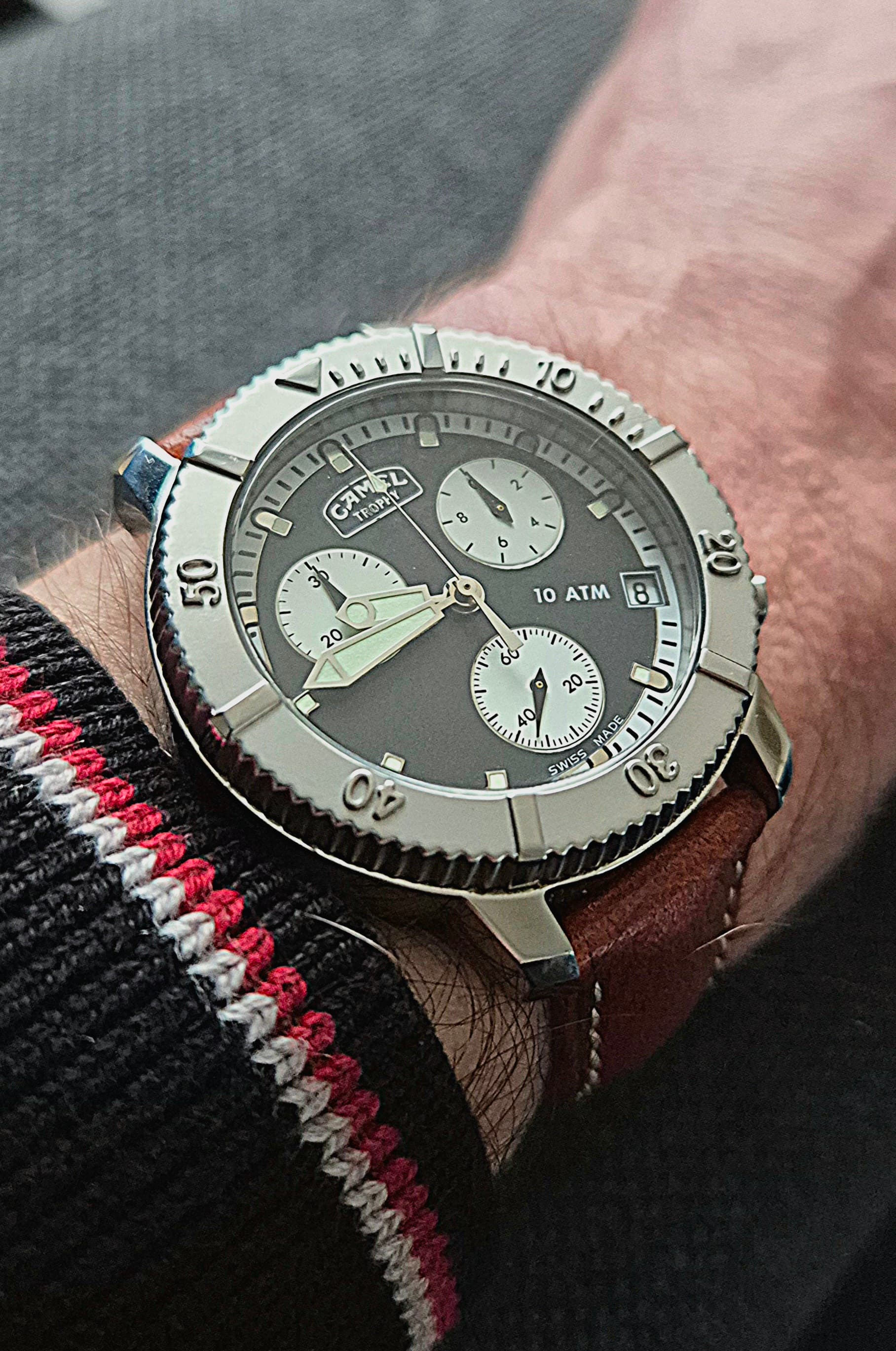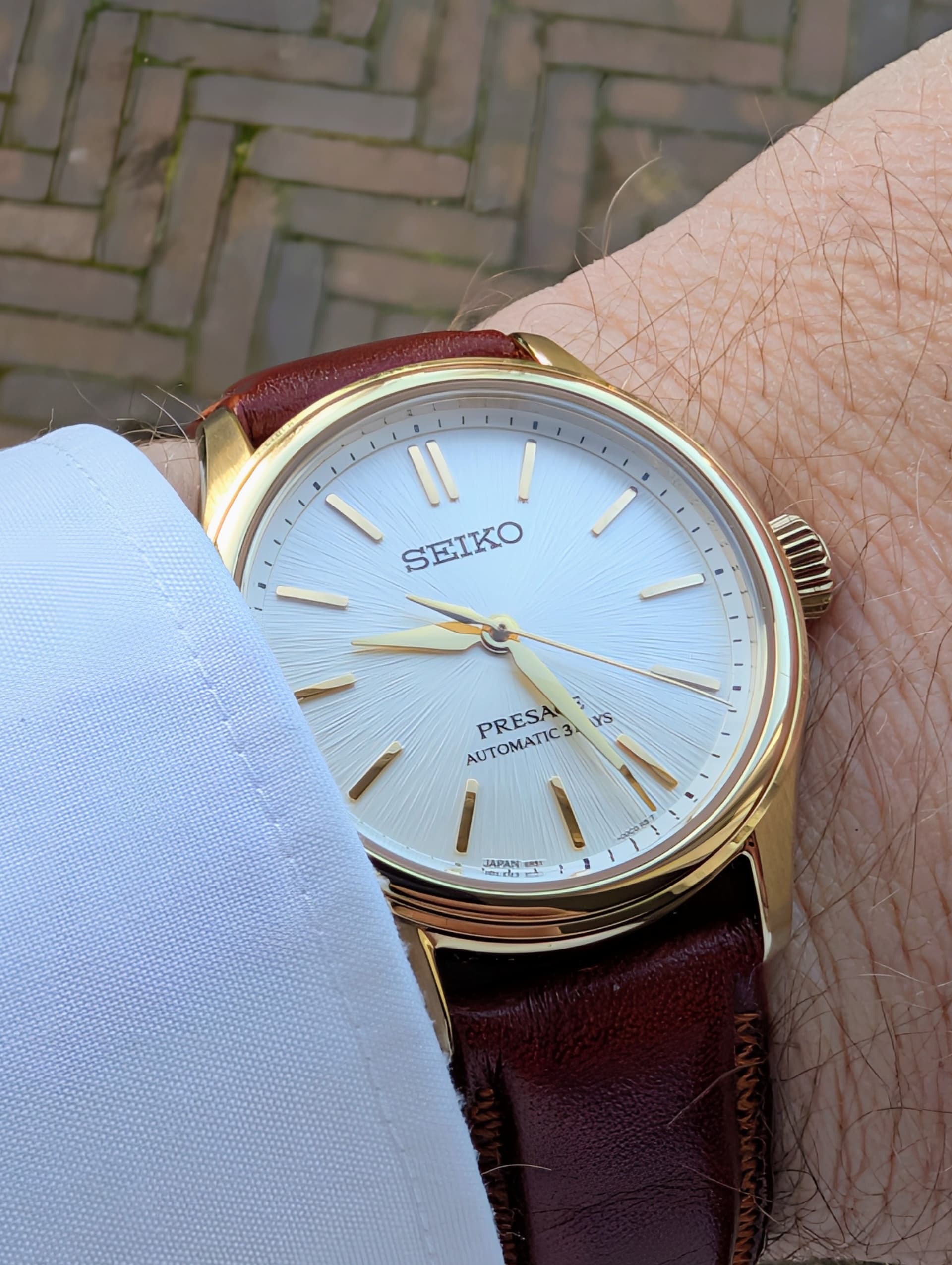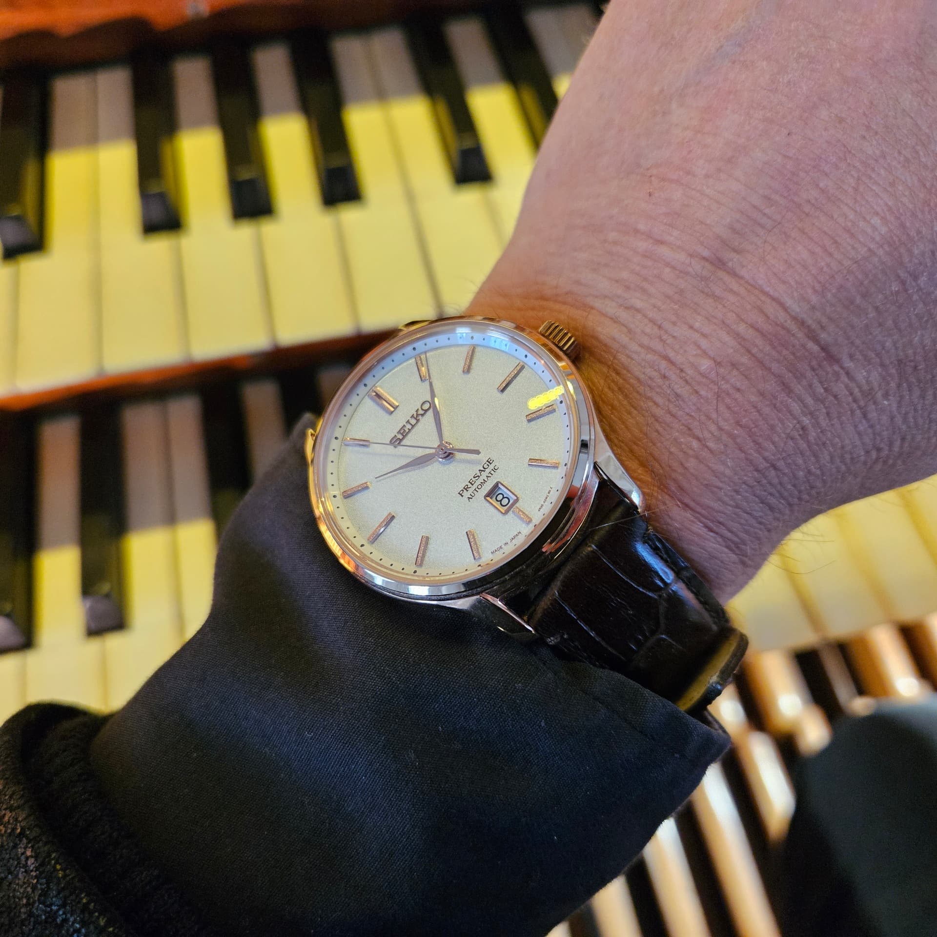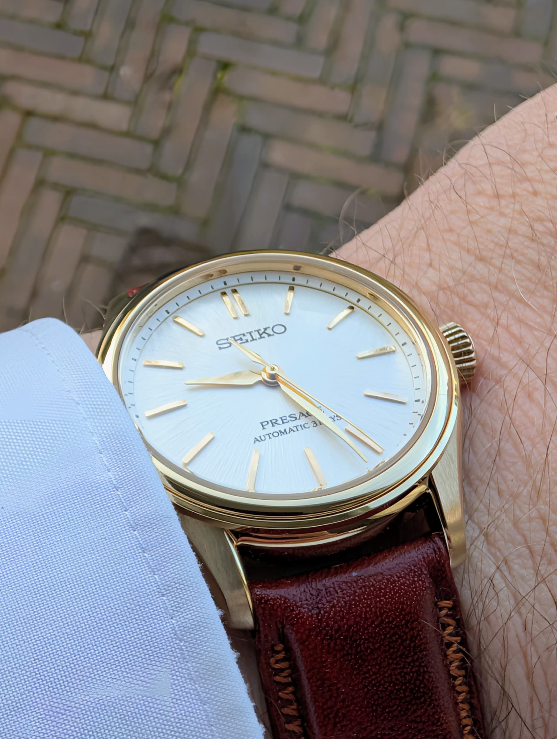 Nice, chique met die gouden kast op leer. Komt niet oorspronkelijk op lederen band toch?