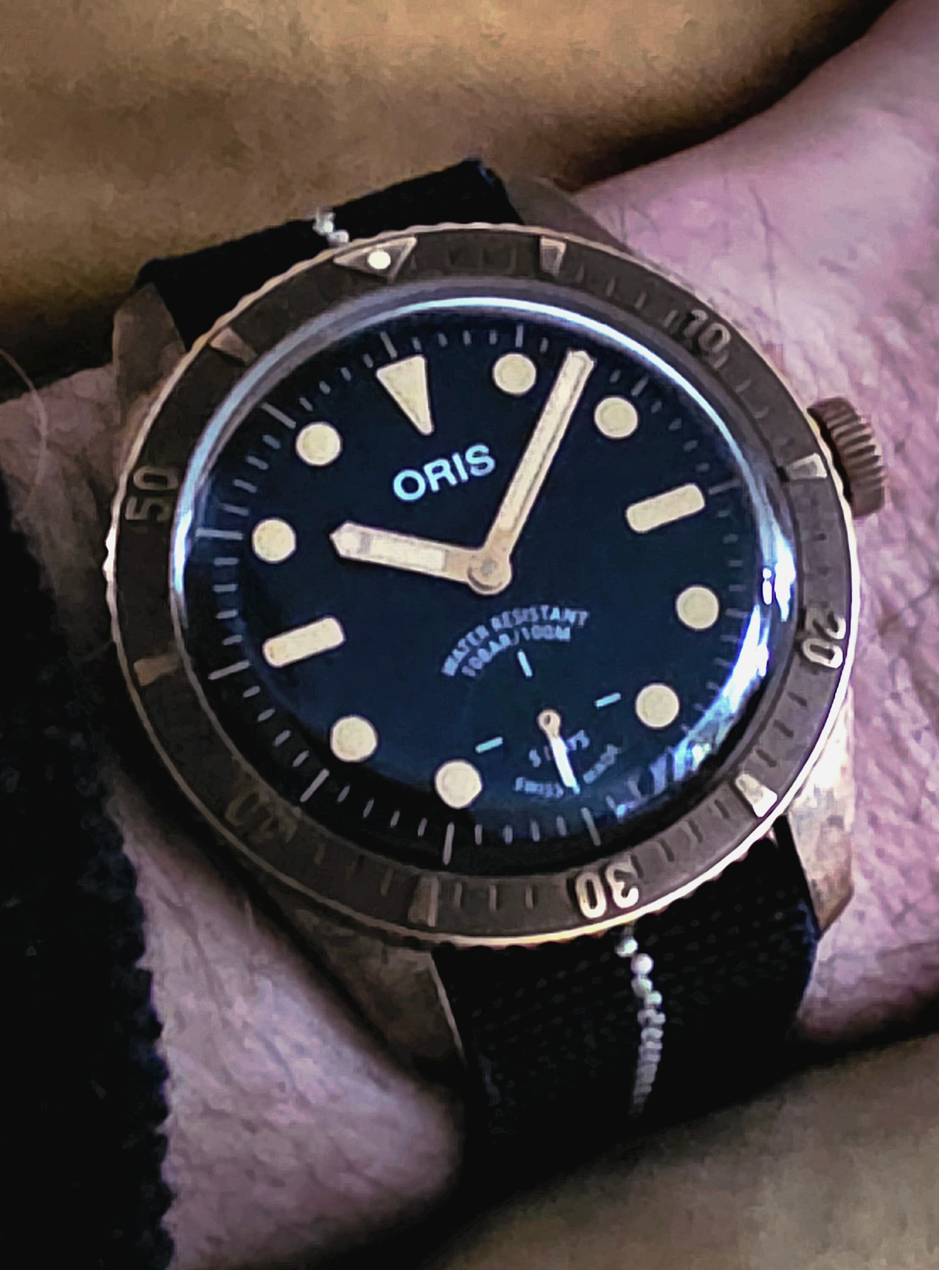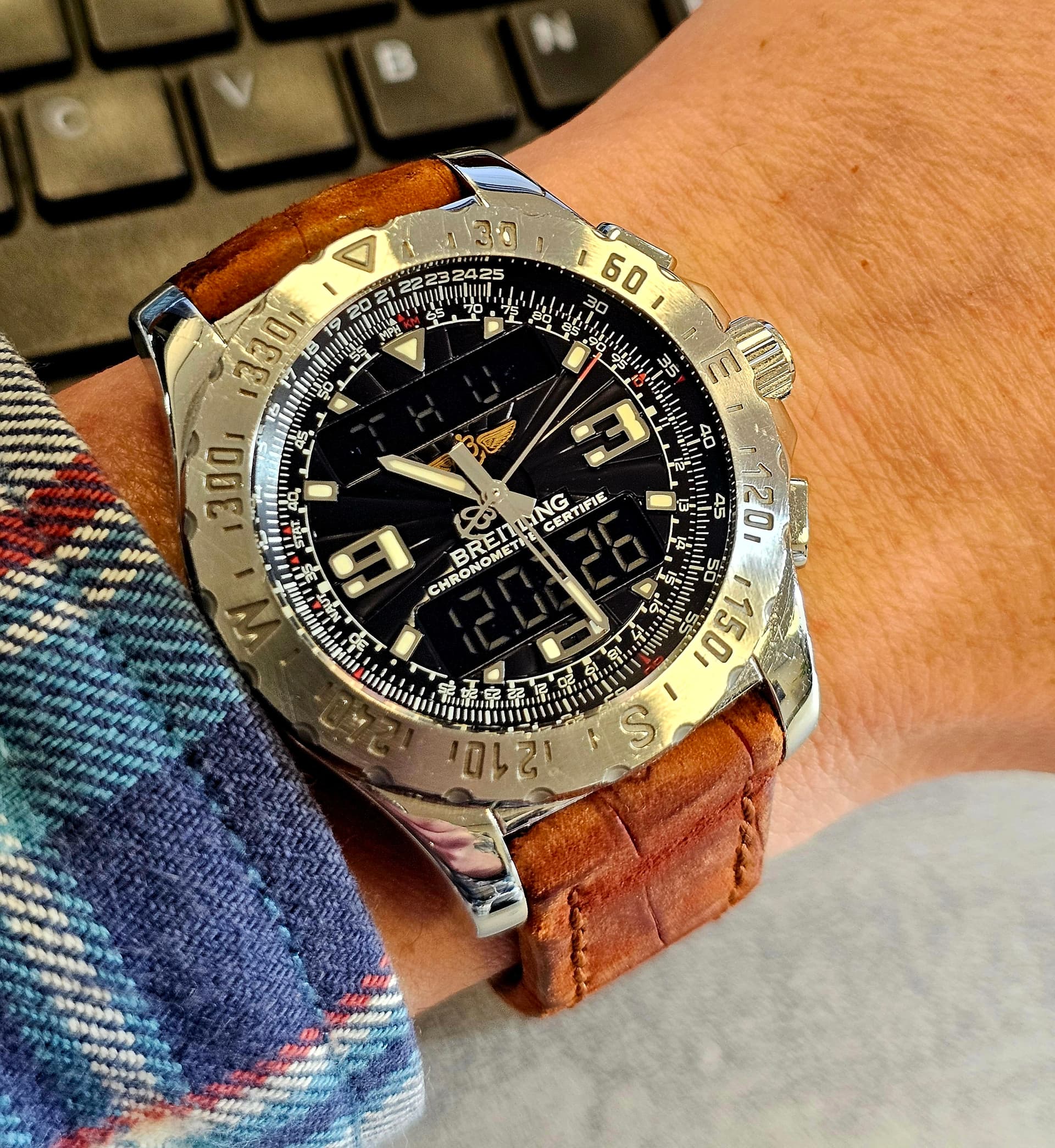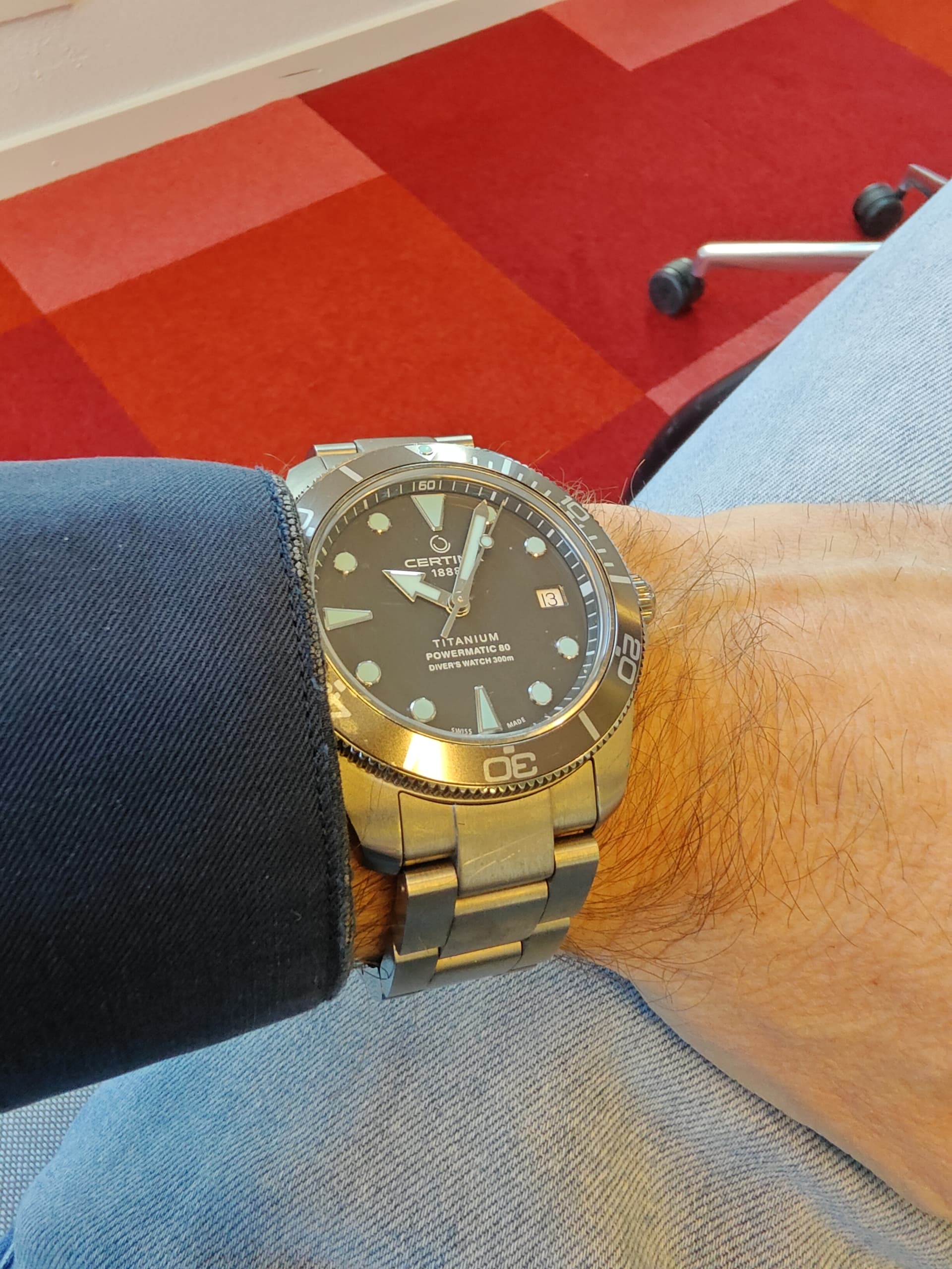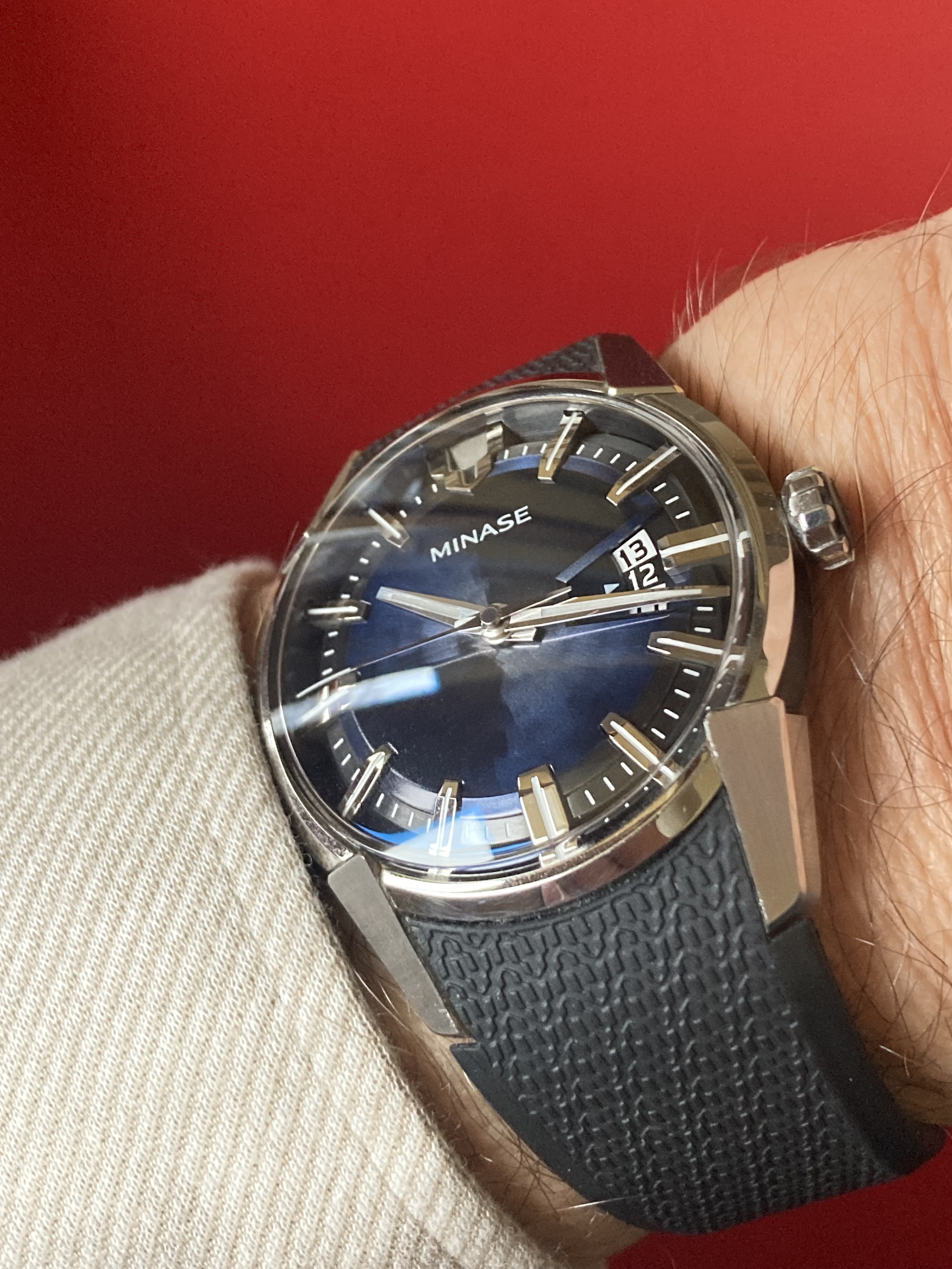 De wijzerplaat is niet rond. Je kijkt door/langs het horloge. Kleur rode bank zichtbaar dus