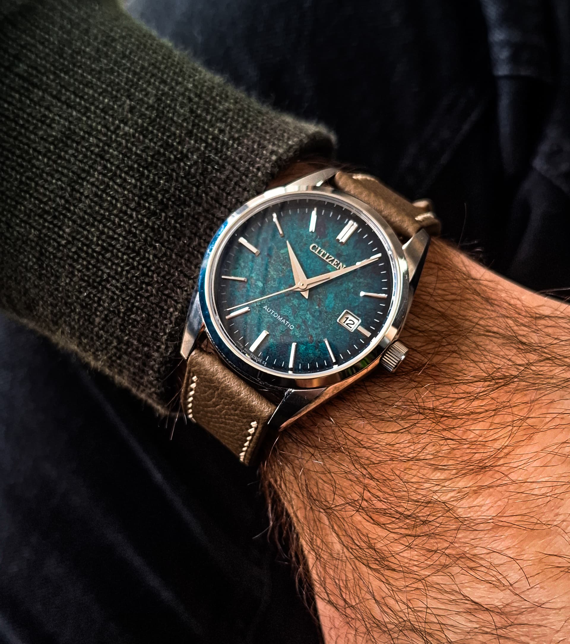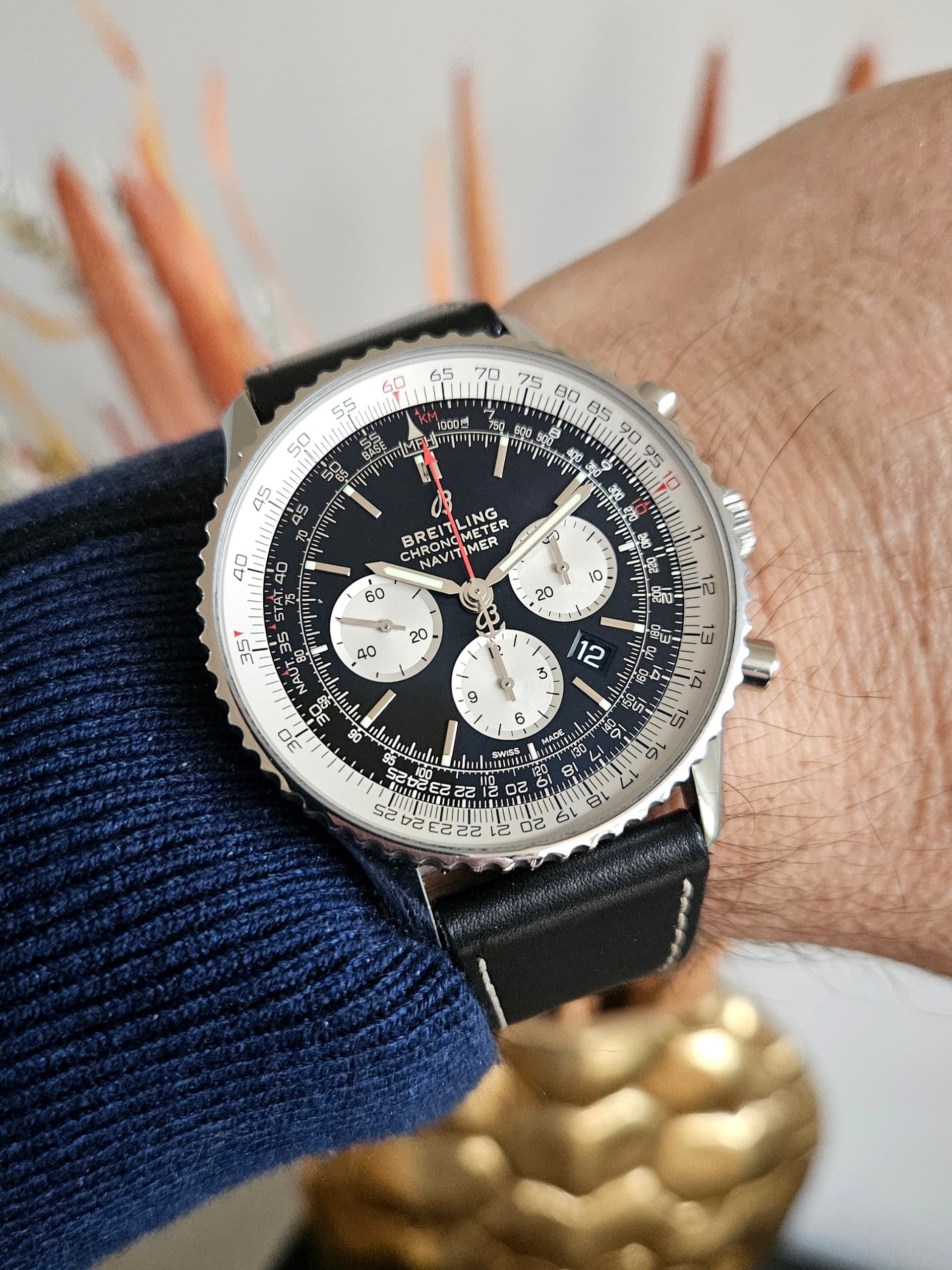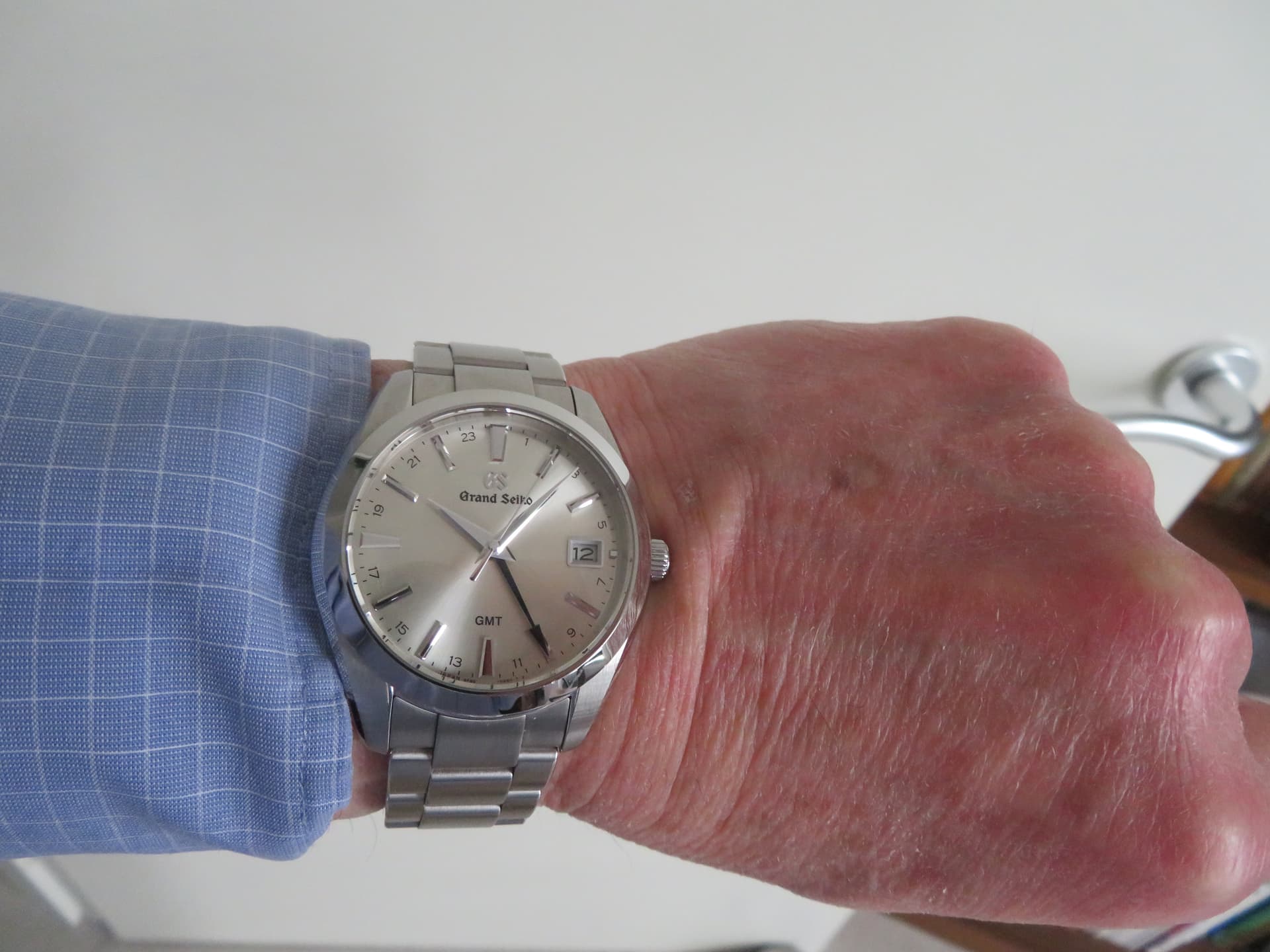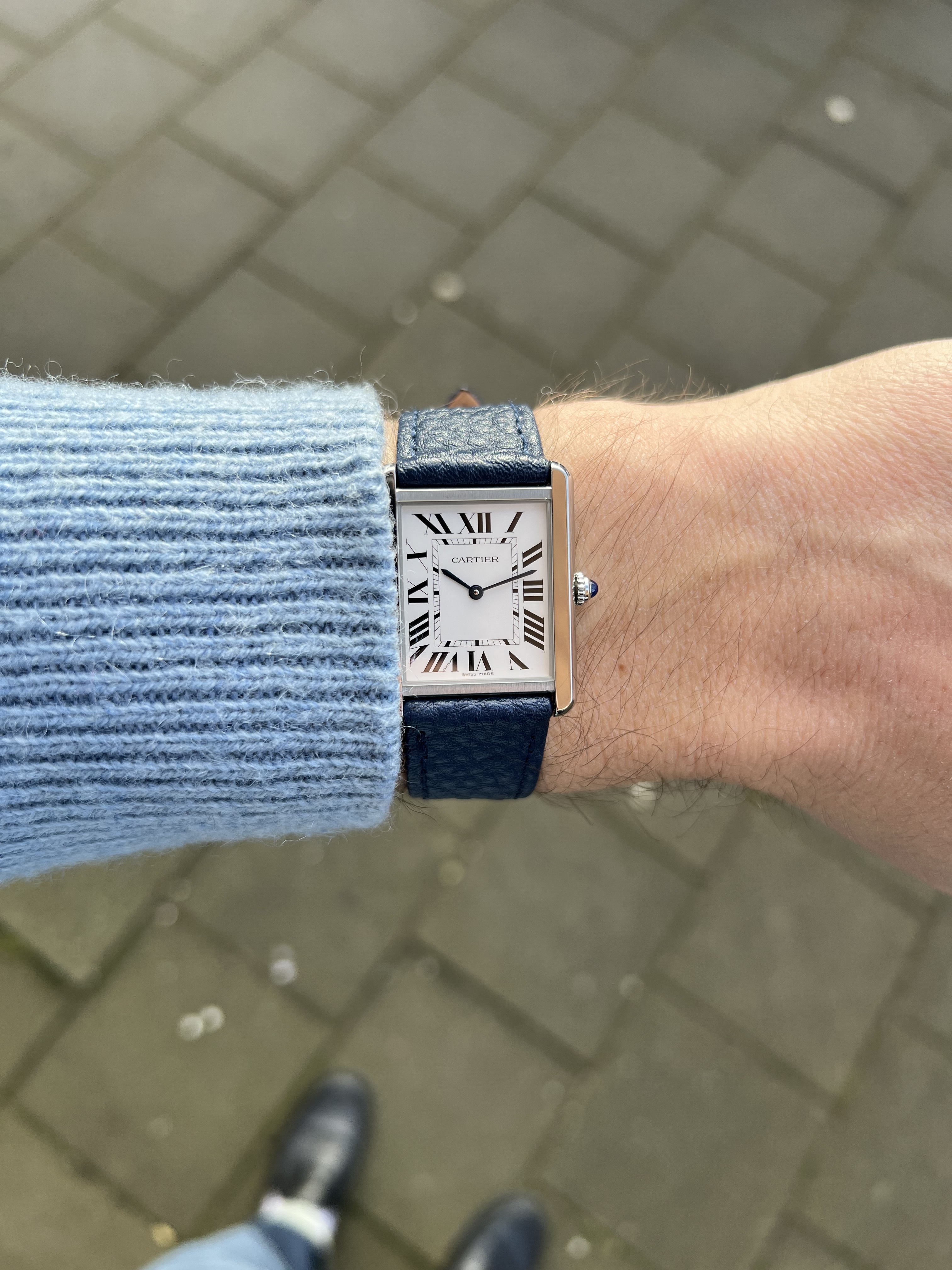 De wijzerplaat is niet rond. Je kijkt door/langs het horloge. Kleur rode bank zichtbaar dus