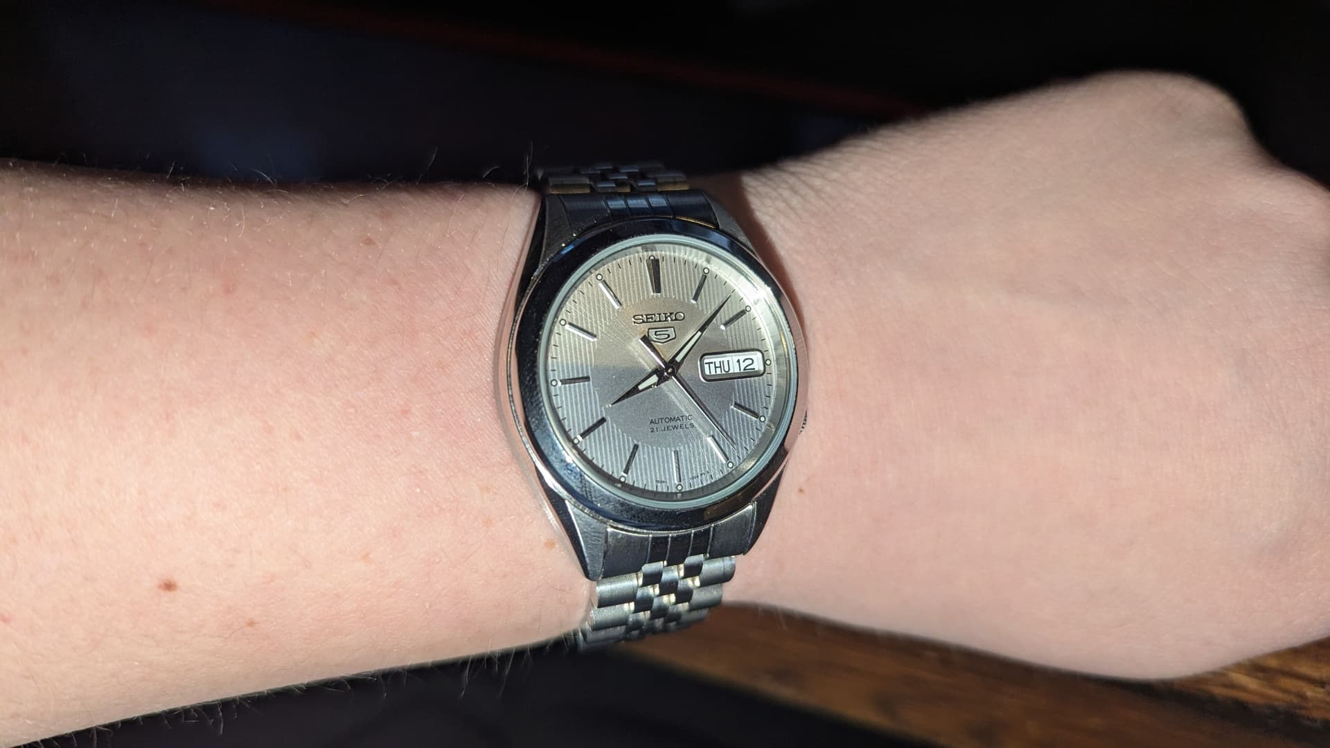 De Seiko SNKL15K1. De foto’s doen dit horloge echt geen recht. Samen met de jubilee band ziet ie er stukken duurder uit dan de 170 euro die ik ervoor kwijt was. Heerlijk horloge dat ik eigenlijk veel meer moet dragen. Ik heb z’n zwarte broertje ook.