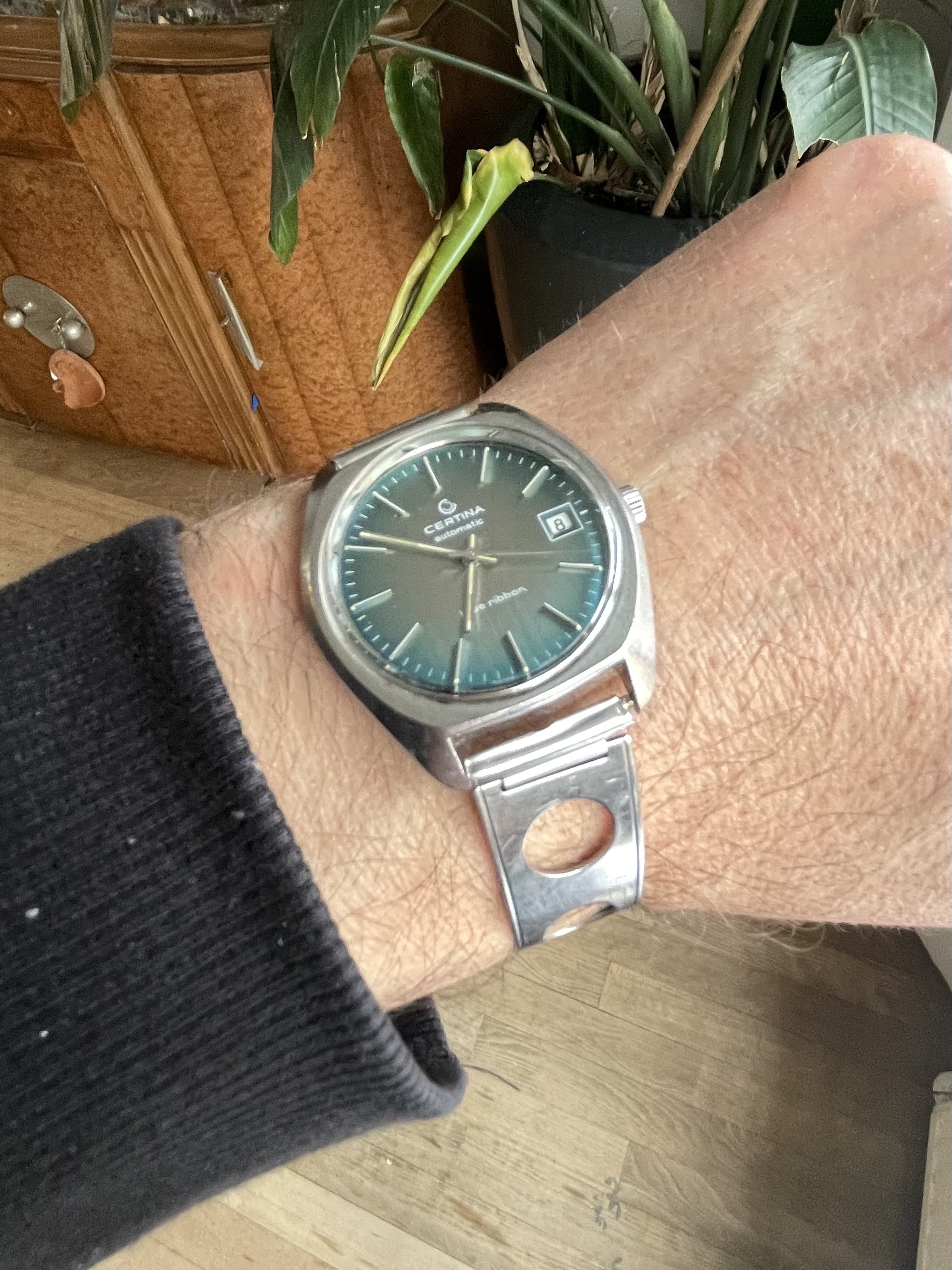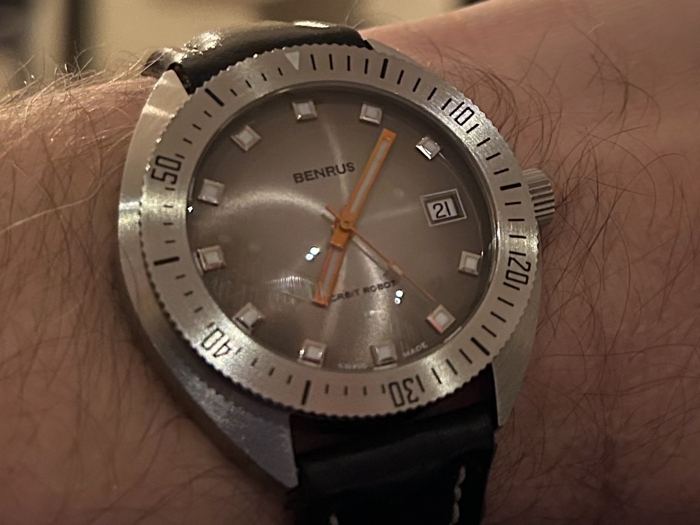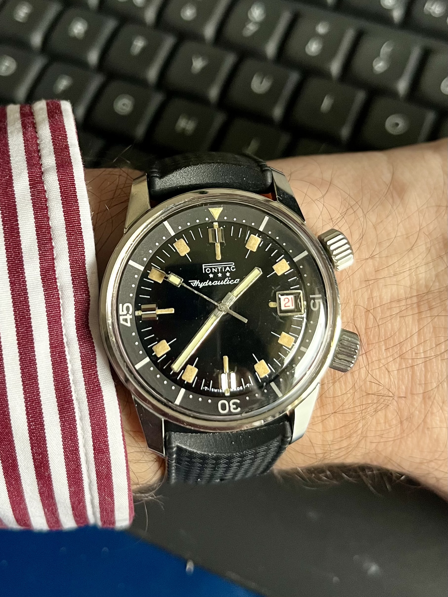 Pontiac Hydraulica 20 met de kenmerkende EPSA Super Compressor kast met dubbele kronen deze keer niet “cross-hatched” maar met de sterretje en de tekst “Pontiac”, hoog acrylglas met de Pontiac P erin gegraveerd. Ongepolijste vlijmscherpe kast, leuk blokje op de secondenwijzer, lekkere vanille tritium lume en een fijne ETA automaat binnenin.