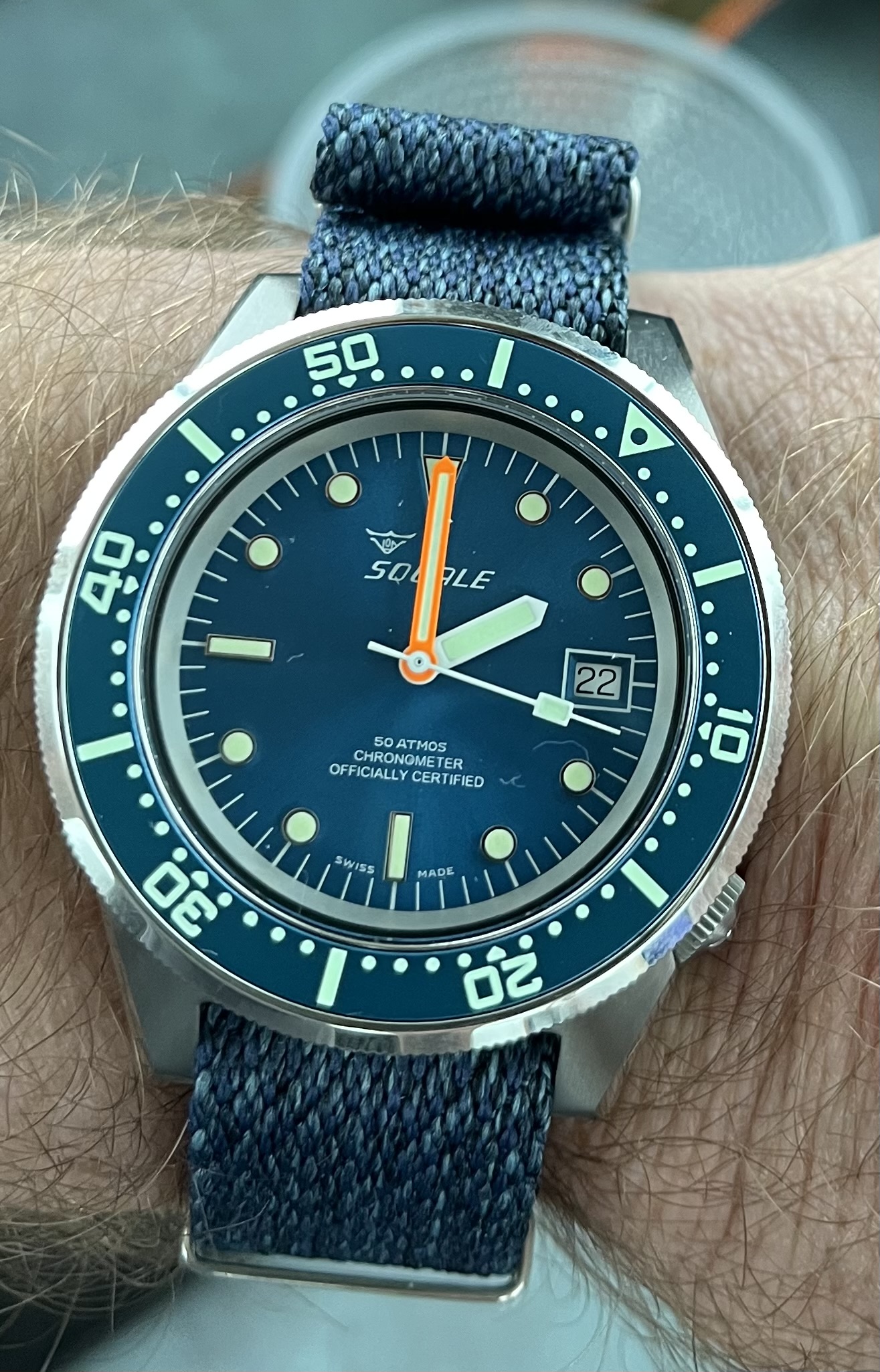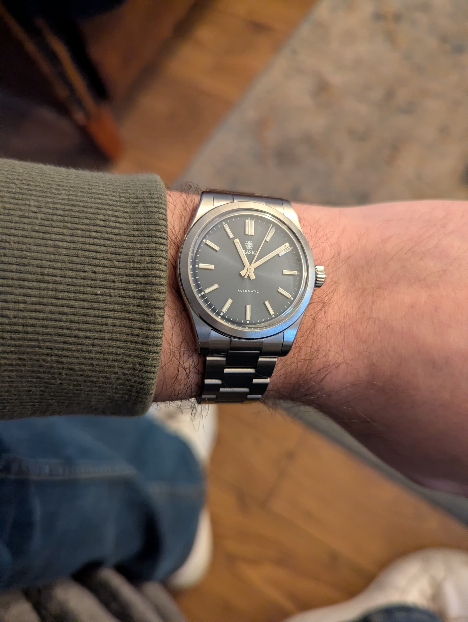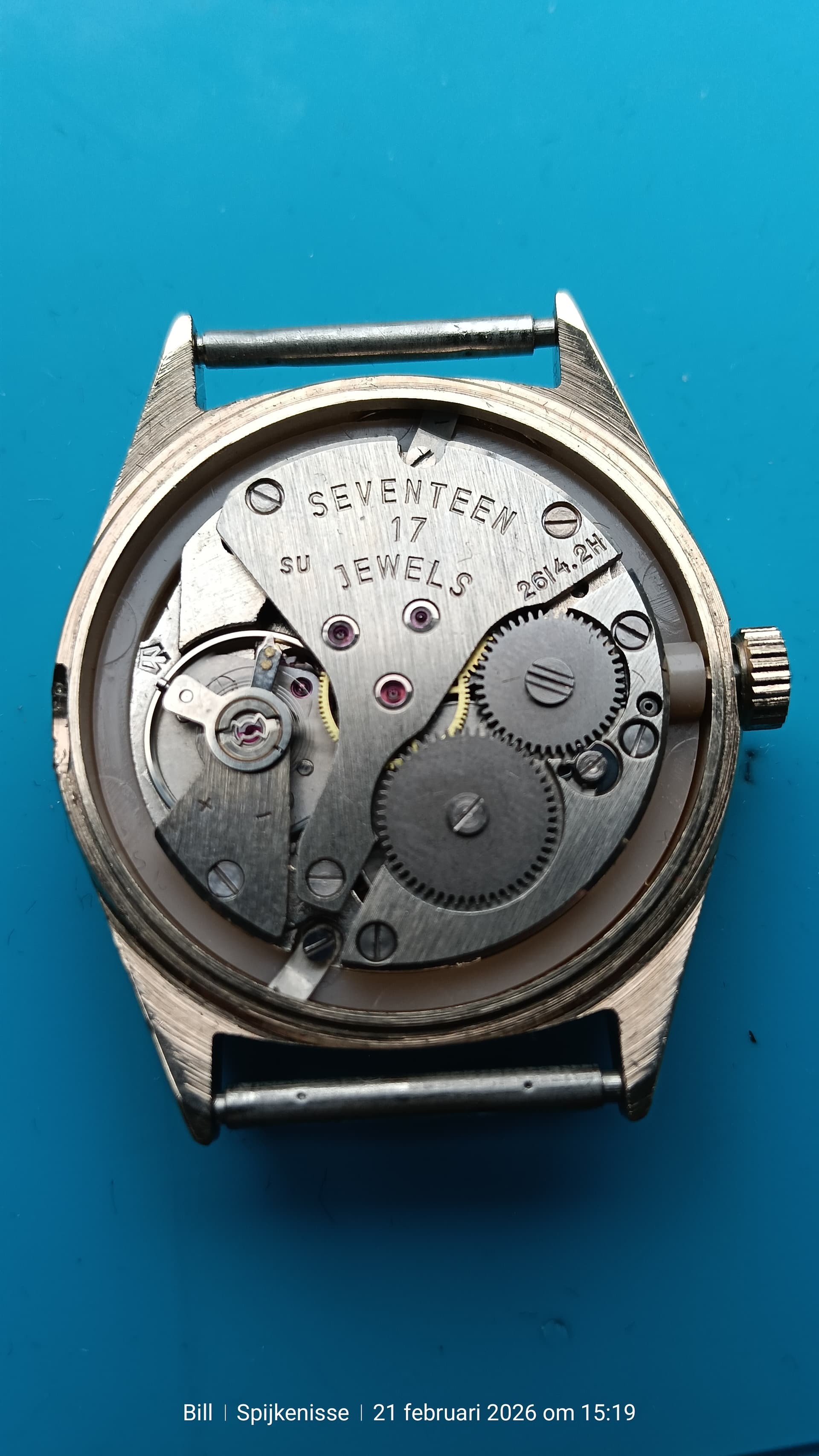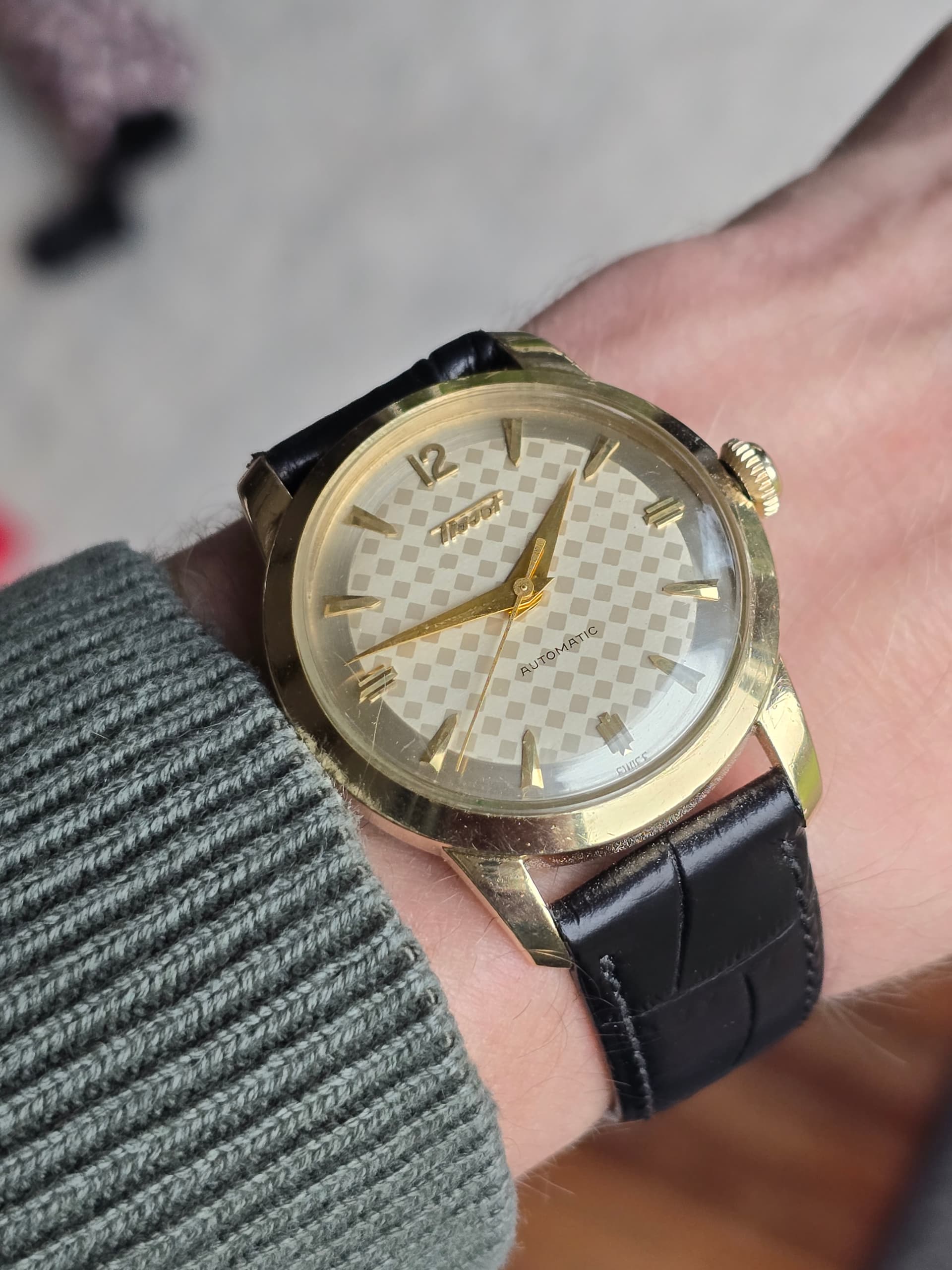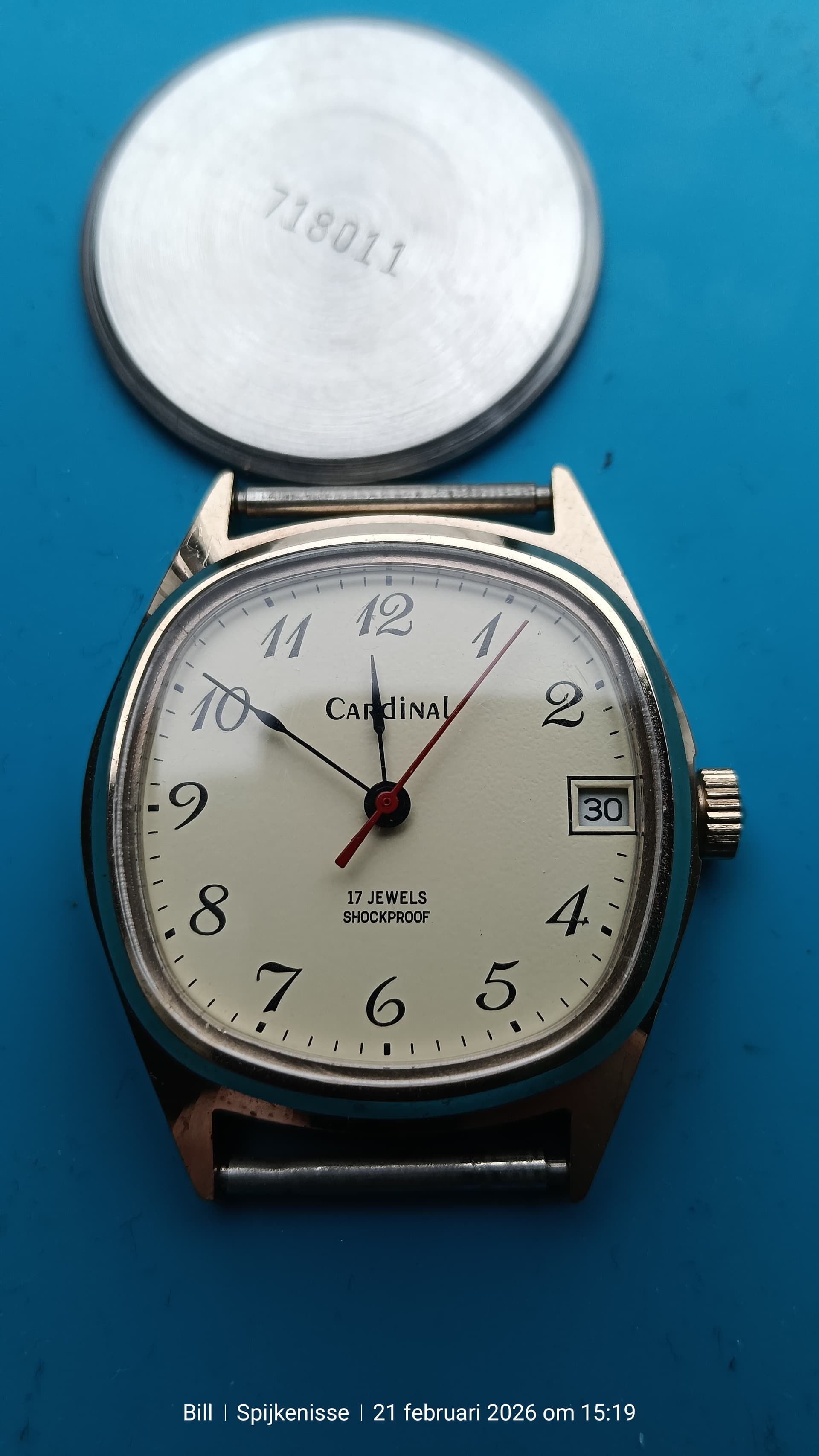 Nieuwe aanwinst, Rotorautomaat uit 1957 met fraai geslepen schaakbord op de wijzerplaat en een Amerikaanse star case kast.