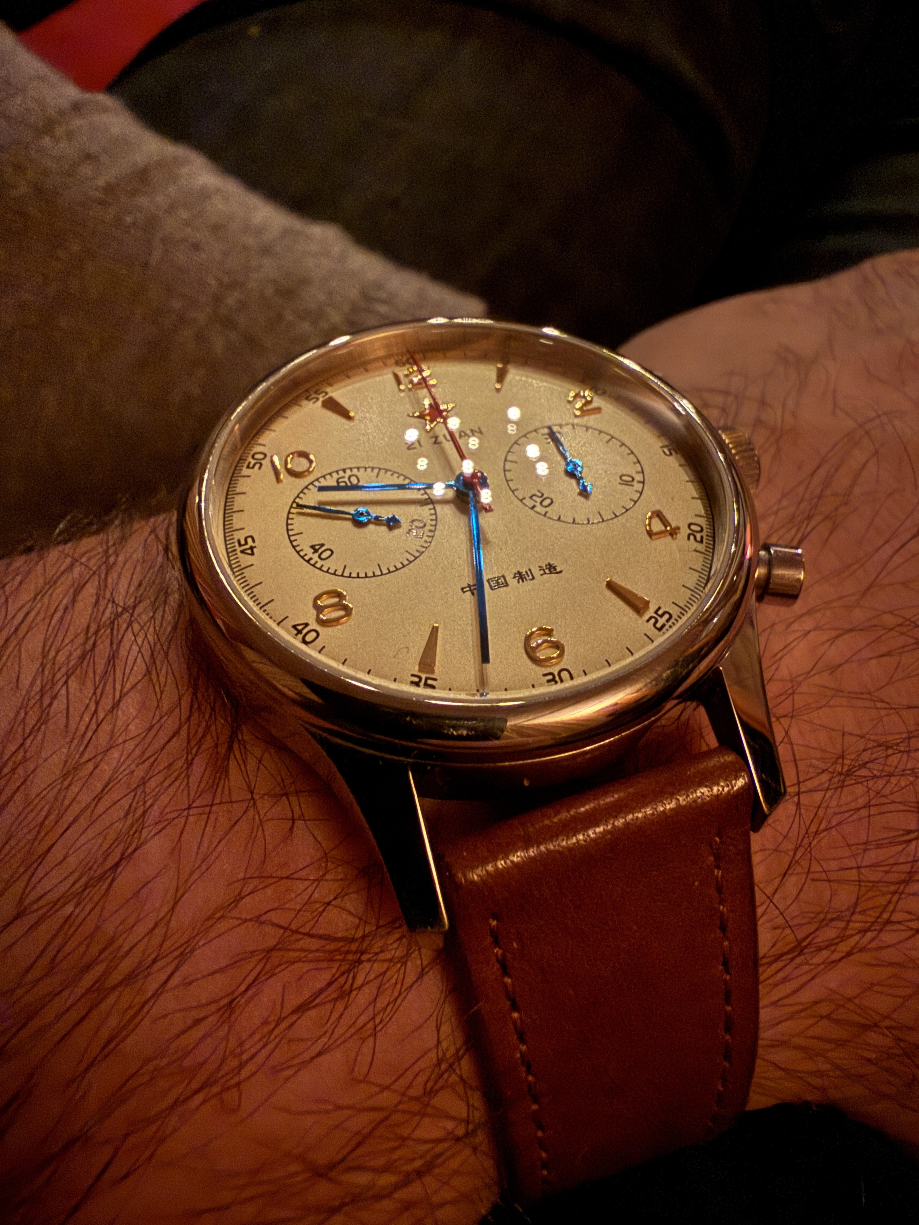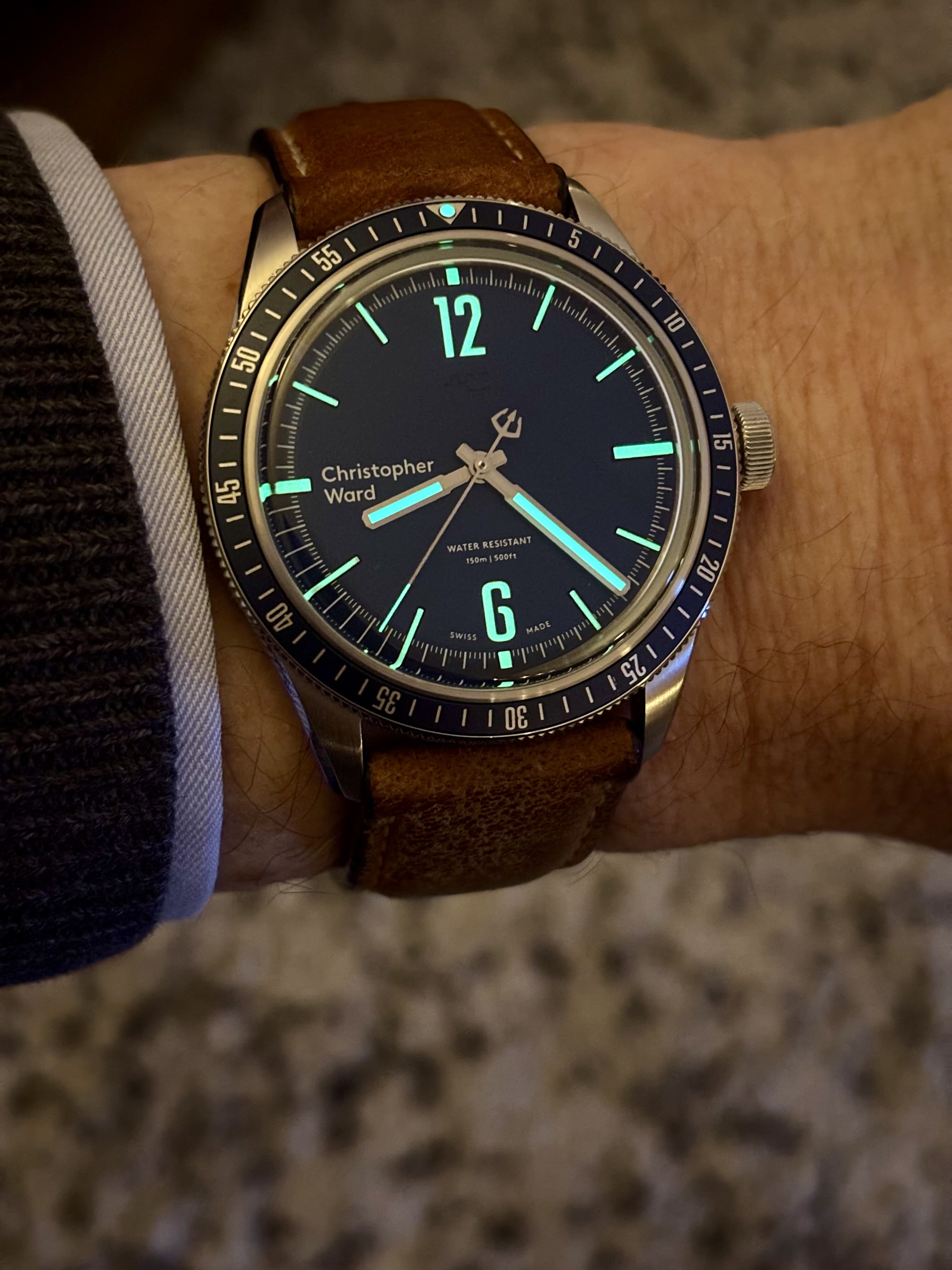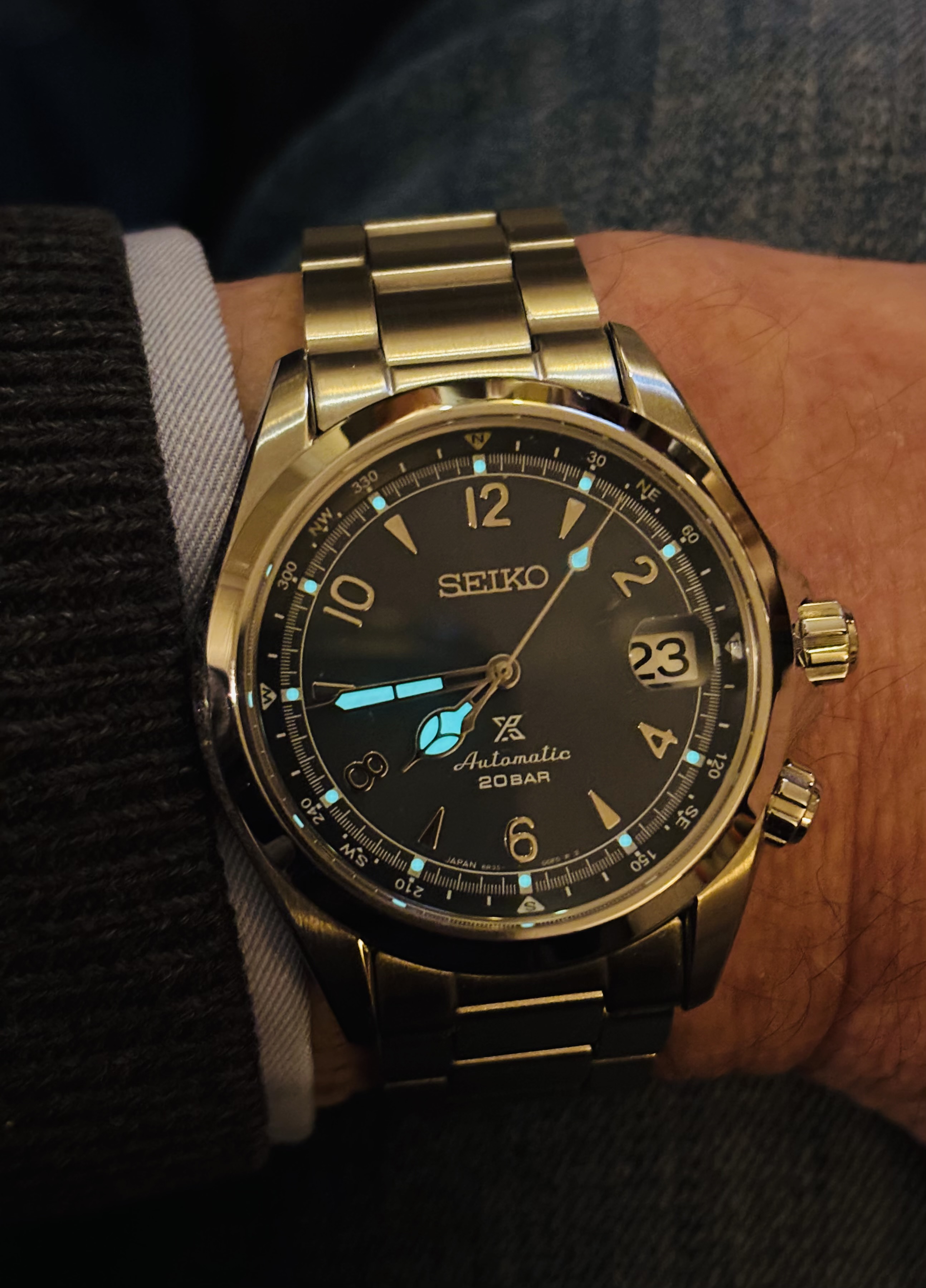 De hele dag was de mooie diepblauwe een fijne gezel, maar nu mag deze geklede presage avant la lettre een avondje mee. De wijzerplaat spiegelt aan de binnenkant van het saffier, en dat spiegelt weer op de superscherp gepolijste wijzers. Zou er haast stiekem een 4R35 in willen doen, met z’n 4R15 heeft deze schoonheid geen handopwinding en dat voelt wel wat vintage😊
